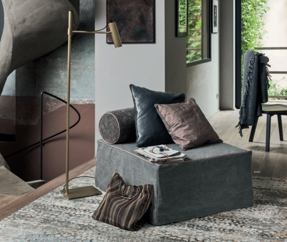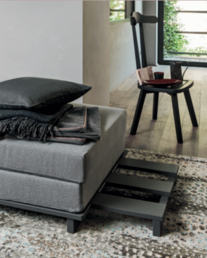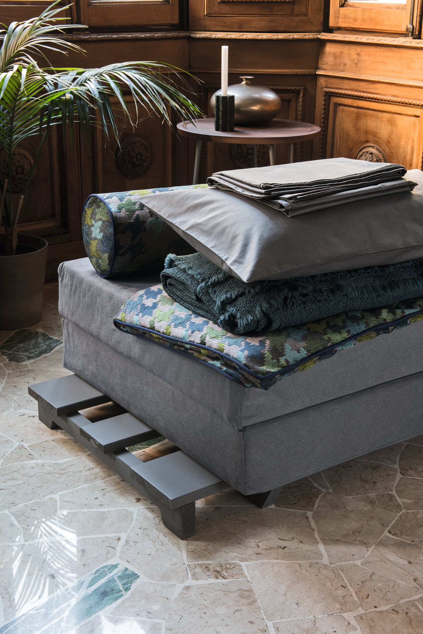 Reinterpretation of the typical oriental bed, the Kubo free-standing bed is all about transformation: the removable slatted base, hidden under the folding mattress, slides with a simple movement allowing you to switch from pouf to single bed and from sofa to double bed. Its versatility and space-saving qualities make it ideal for spaces of all sizes, from the living room, to the study to the bedroom. Wooden base in grey, white, black, ocean,dove-grey, date, blueberry and ginger finish.