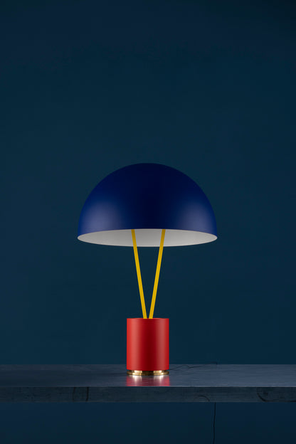 red/brass base / yellow tubes / ext. blue/int. white dome / black fly / black wire