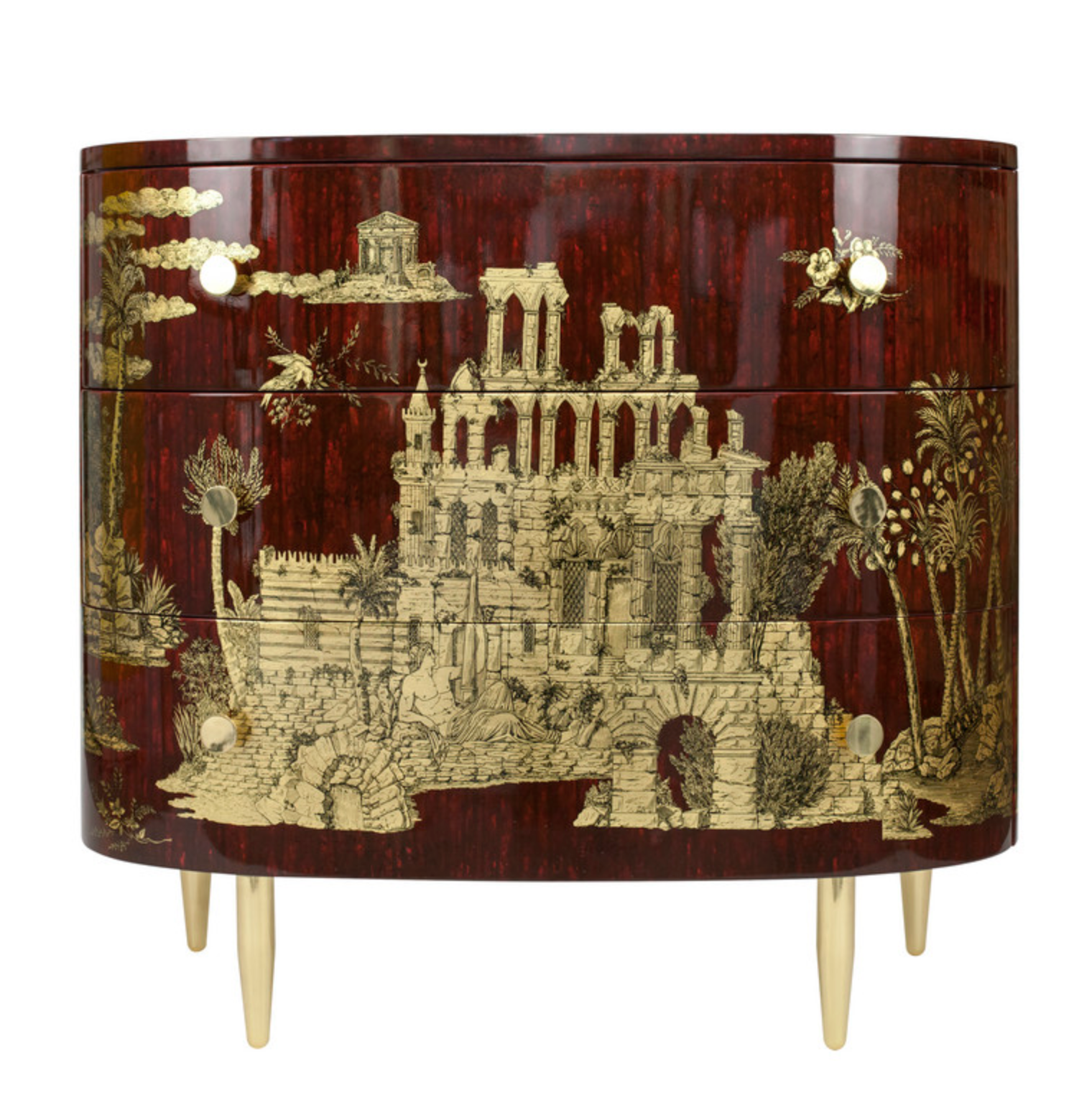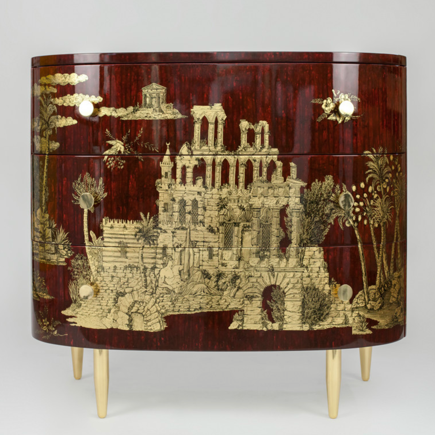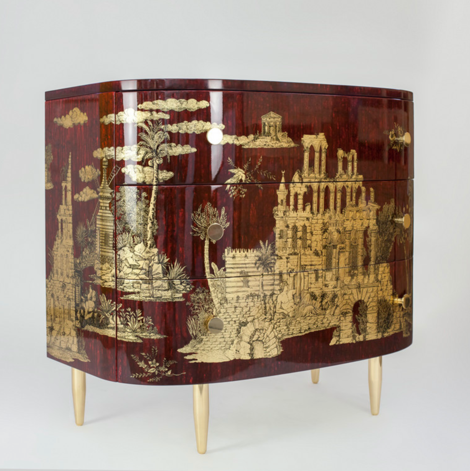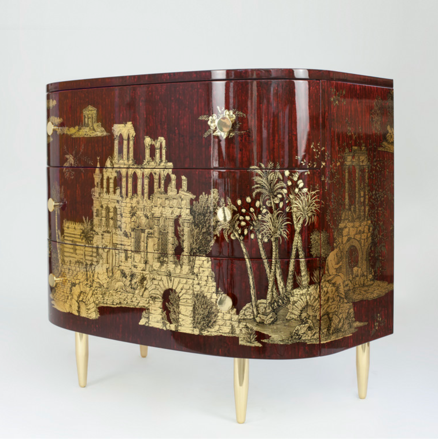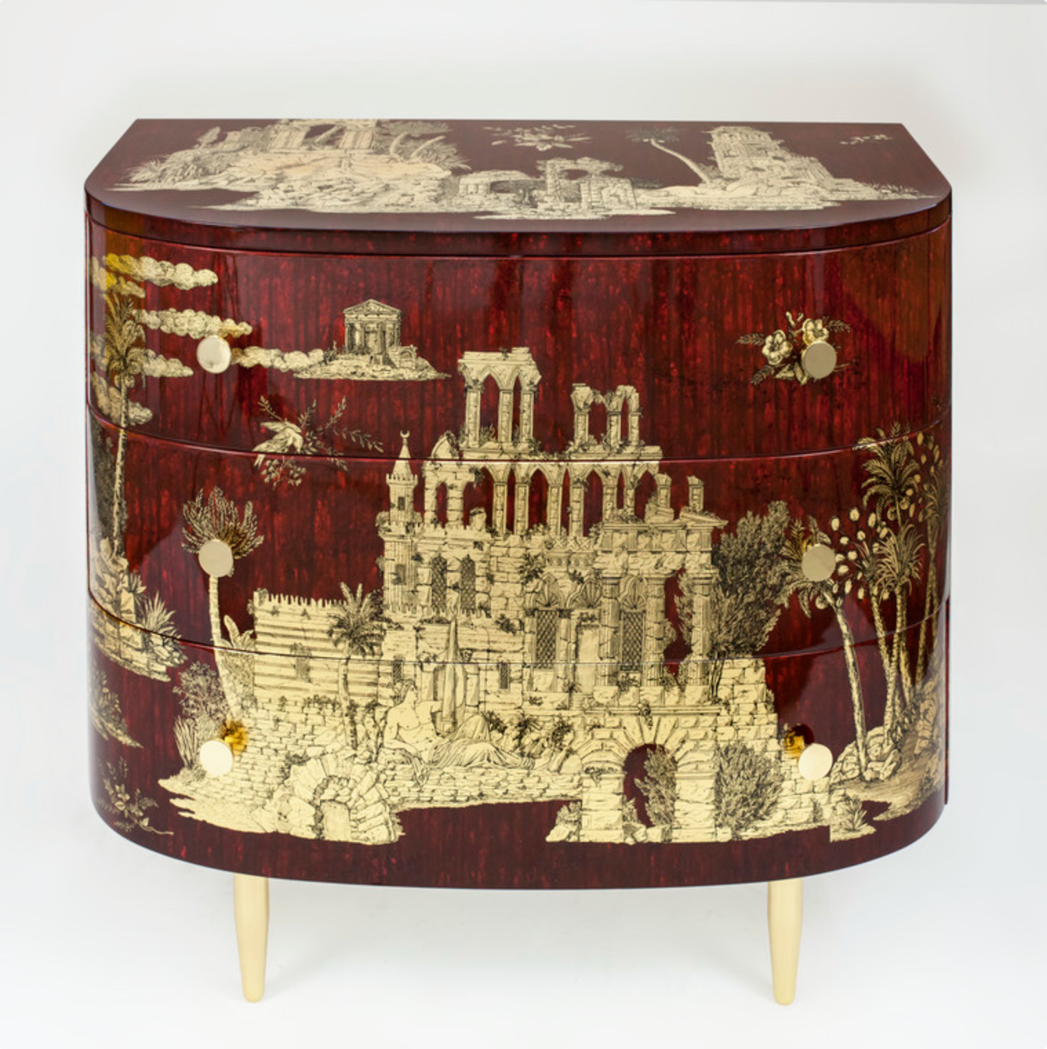 Fornasetti Curved chest of drawers Grand Coromandel gold / dripped bordeaux