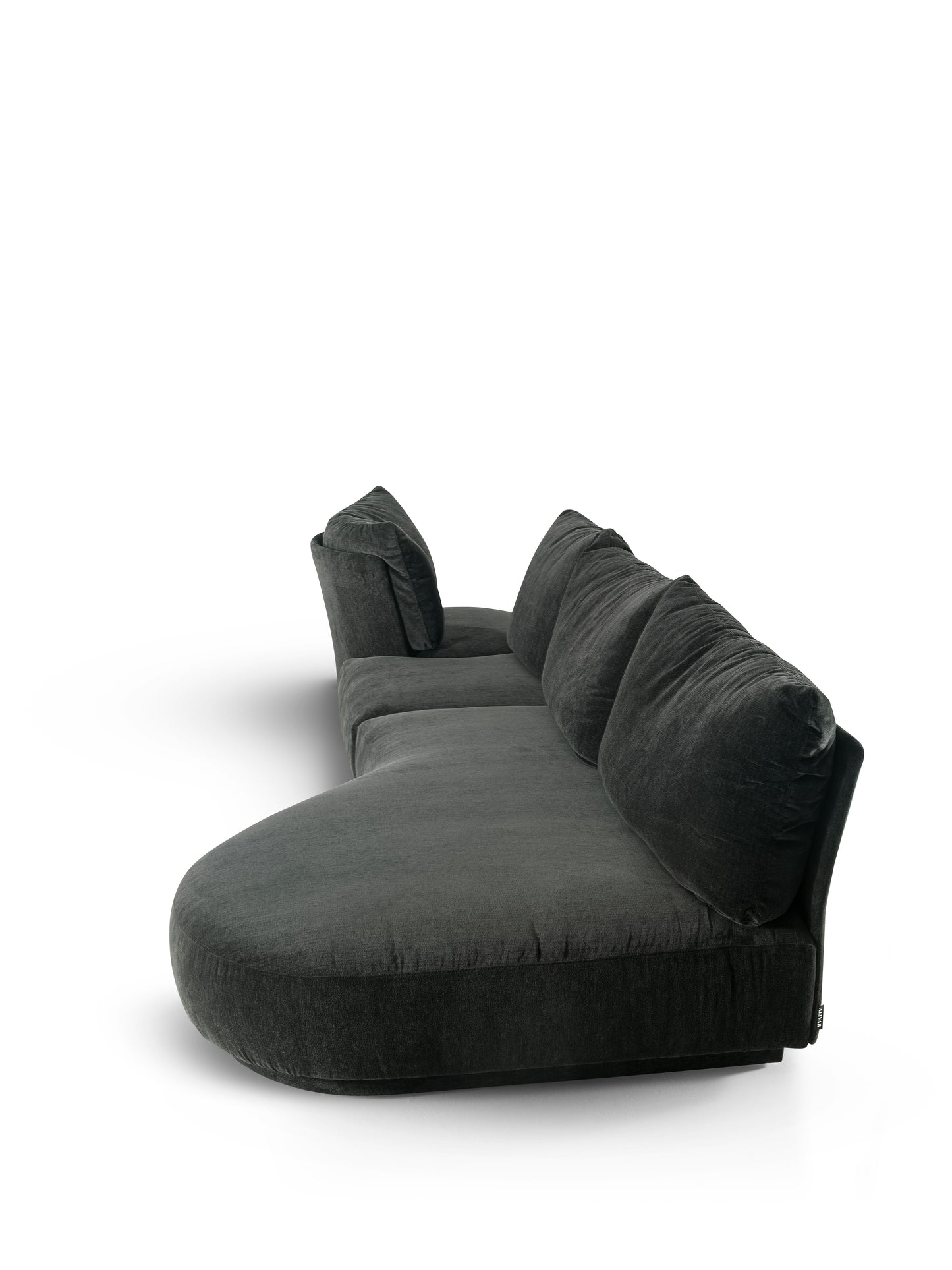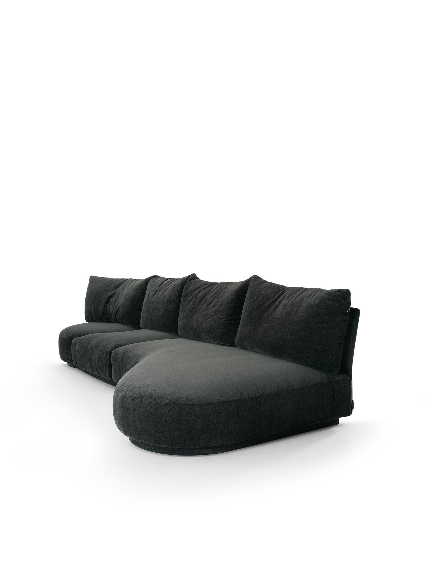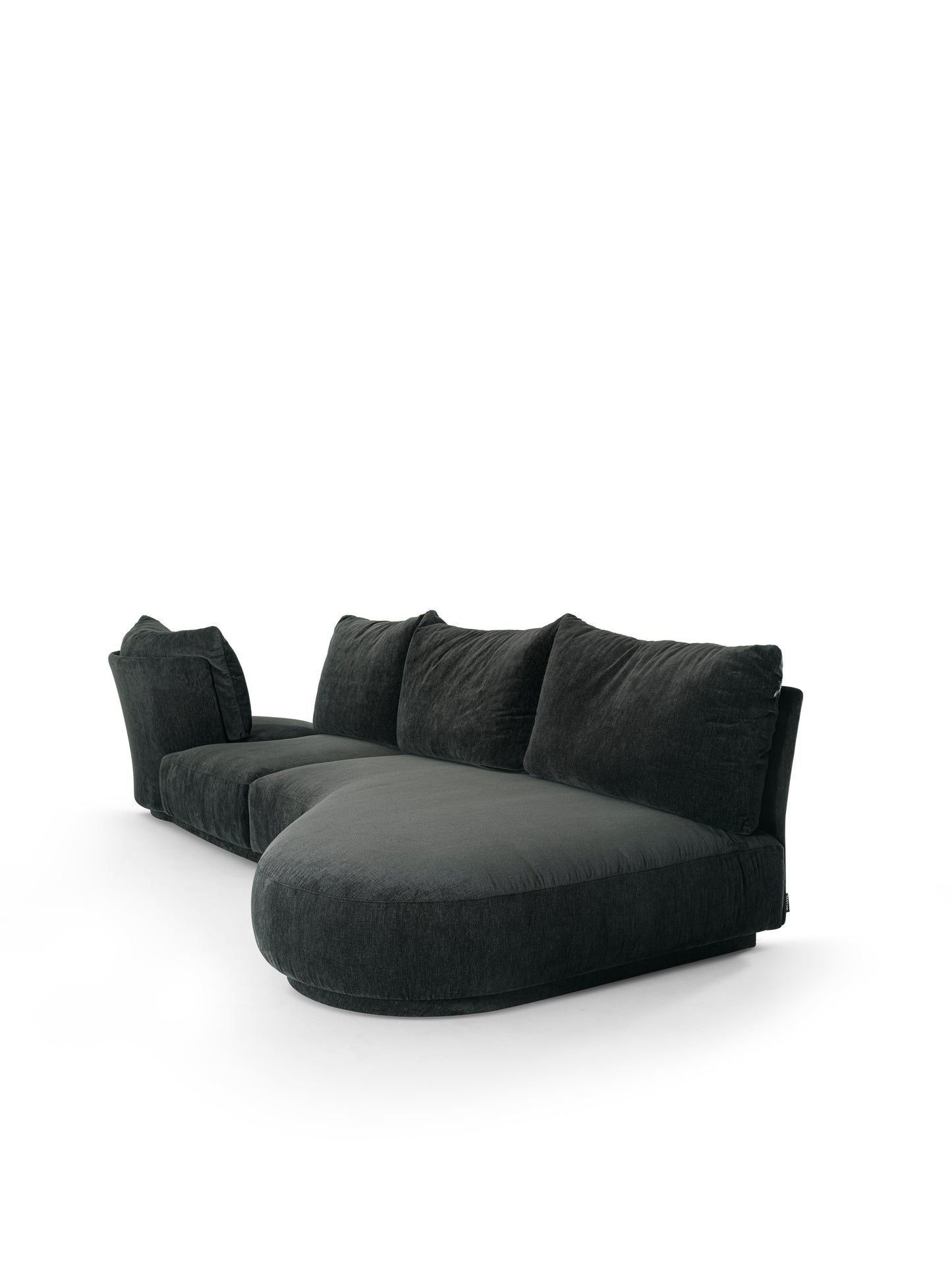 Distinguished by robust wooden base covered in resilient polyurethane, upholstered with non-deformable polyurethane foam and polyester fiber lining, this modular sofa blends comfort with contemporary style. Steel backrest and arms coated in polyurethane ensure durability. Featuring seat cushions in polyurethane foam of different densities and quilt in sterilized feathers, it offers plush comfort. Back cushions in polyurethane foam covered with a lining filled with sterilized feathers. Upholstered in black fabric, with non-slip feet, and available in customizable sizes. It includes a swivel armchair.
