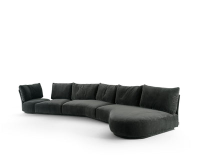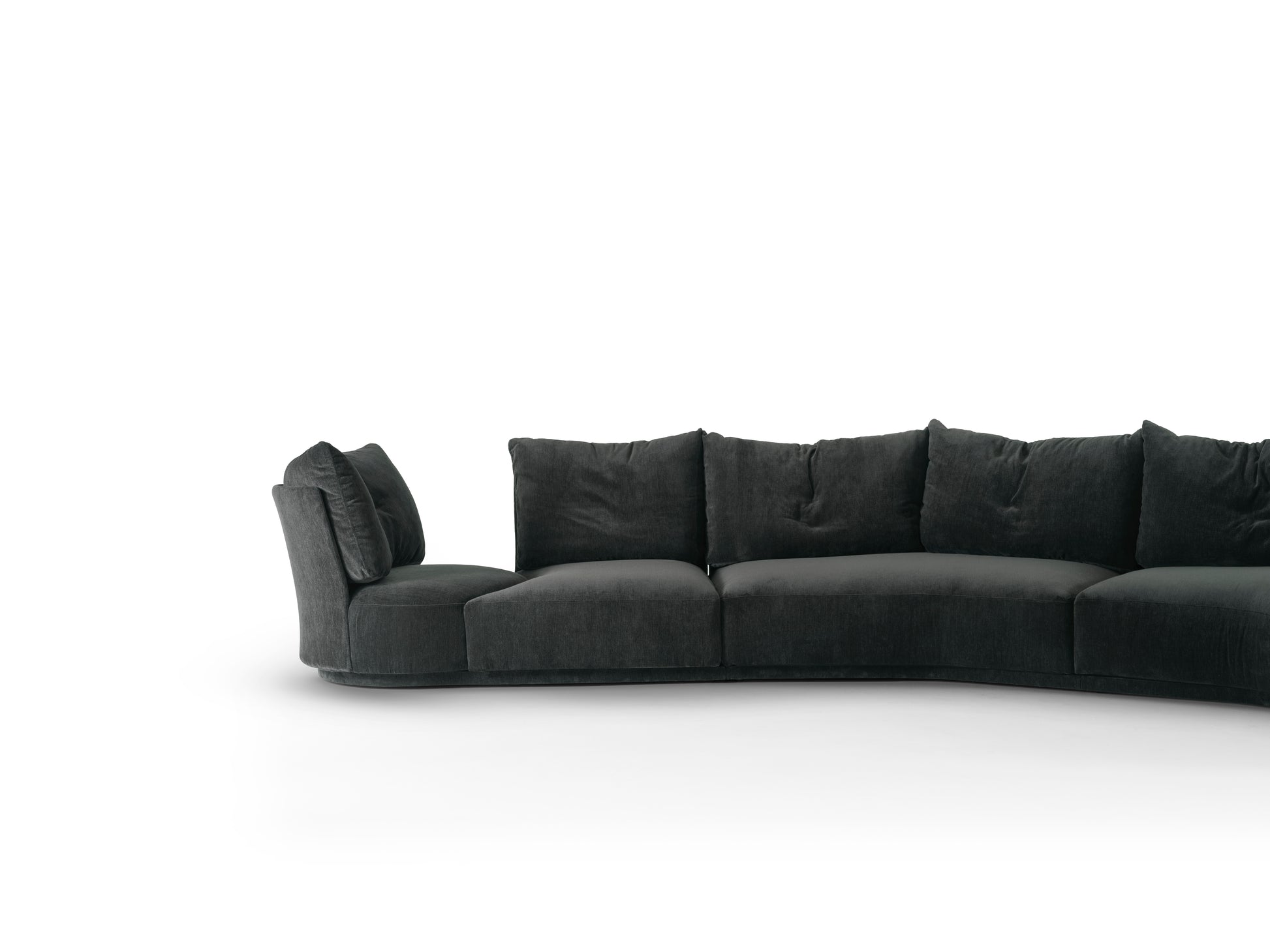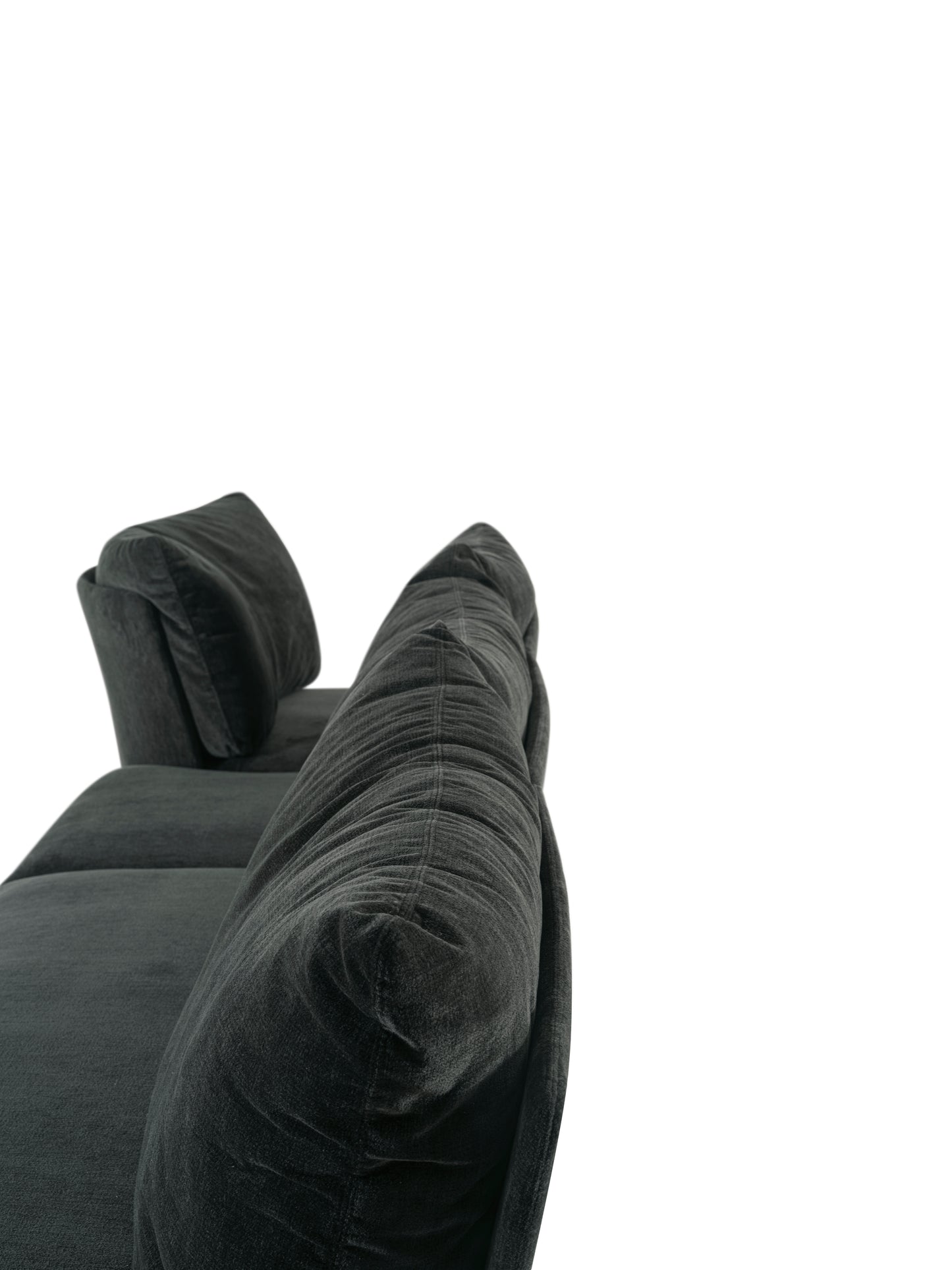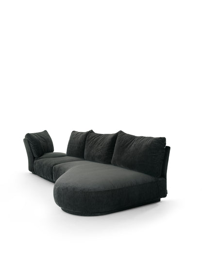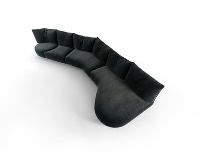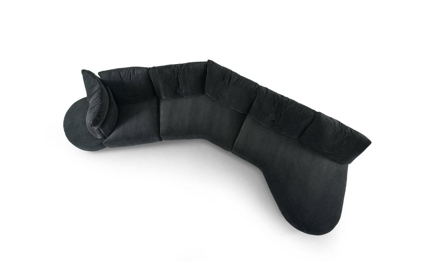 Distinguished by robust wooden base covered in resilient polyurethane, upholstered with non-deformable polyurethane foam and polyester fiber lining, this modular sofa blends comfort with contemporary style. Steel backrest and arms coated in polyurethane ensure durability. Featuring seat cushions in polyurethane foam of different densities and quilt in sterilized feathers, it offers plush comfort. Back cushions in polyurethane foam covered with a lining filled with sterilized feathers. Upholstered in black fabric, with non-slip feet, and available in customizable sizes. It includes a swivel armchair.