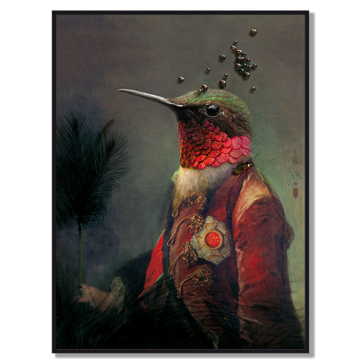 With his haughty demeanor and enigmatic medals, Ambroise seems to have stepped out of an album of forgotten memories. This imaginary uncle, erudite and benevolent, imposes his presence while leaving his prestigious past a mystery. A hummingbird of modest appearance, but whose stature and aura betray an unsuspected nobility.