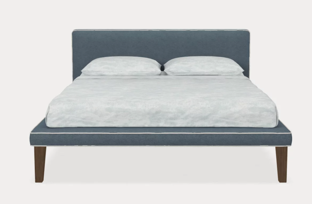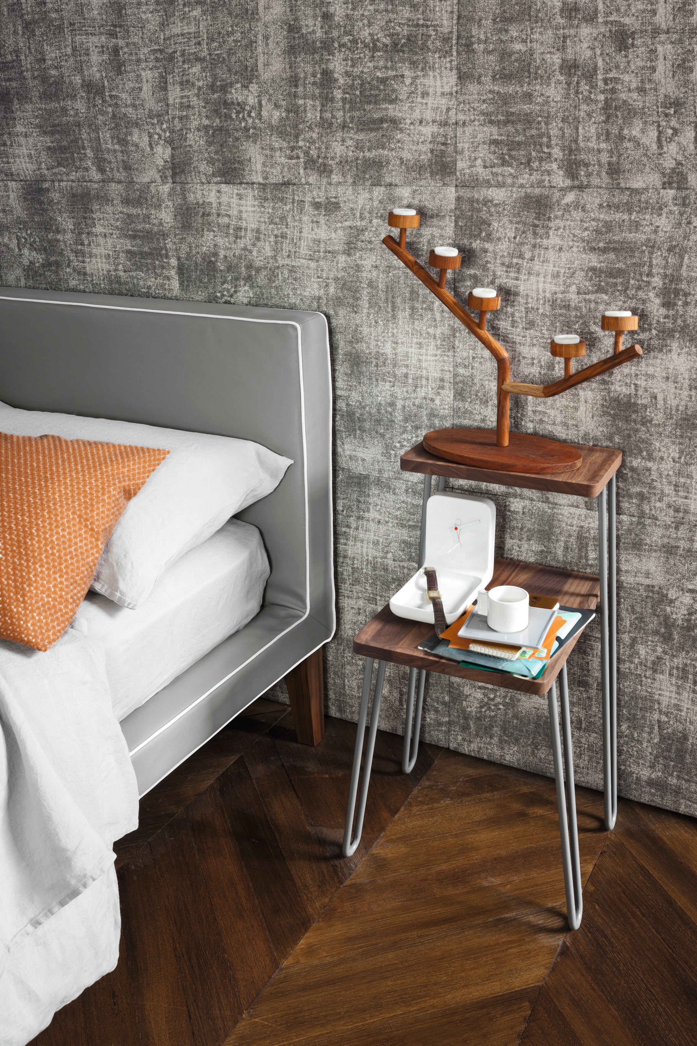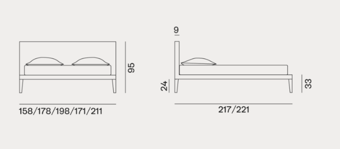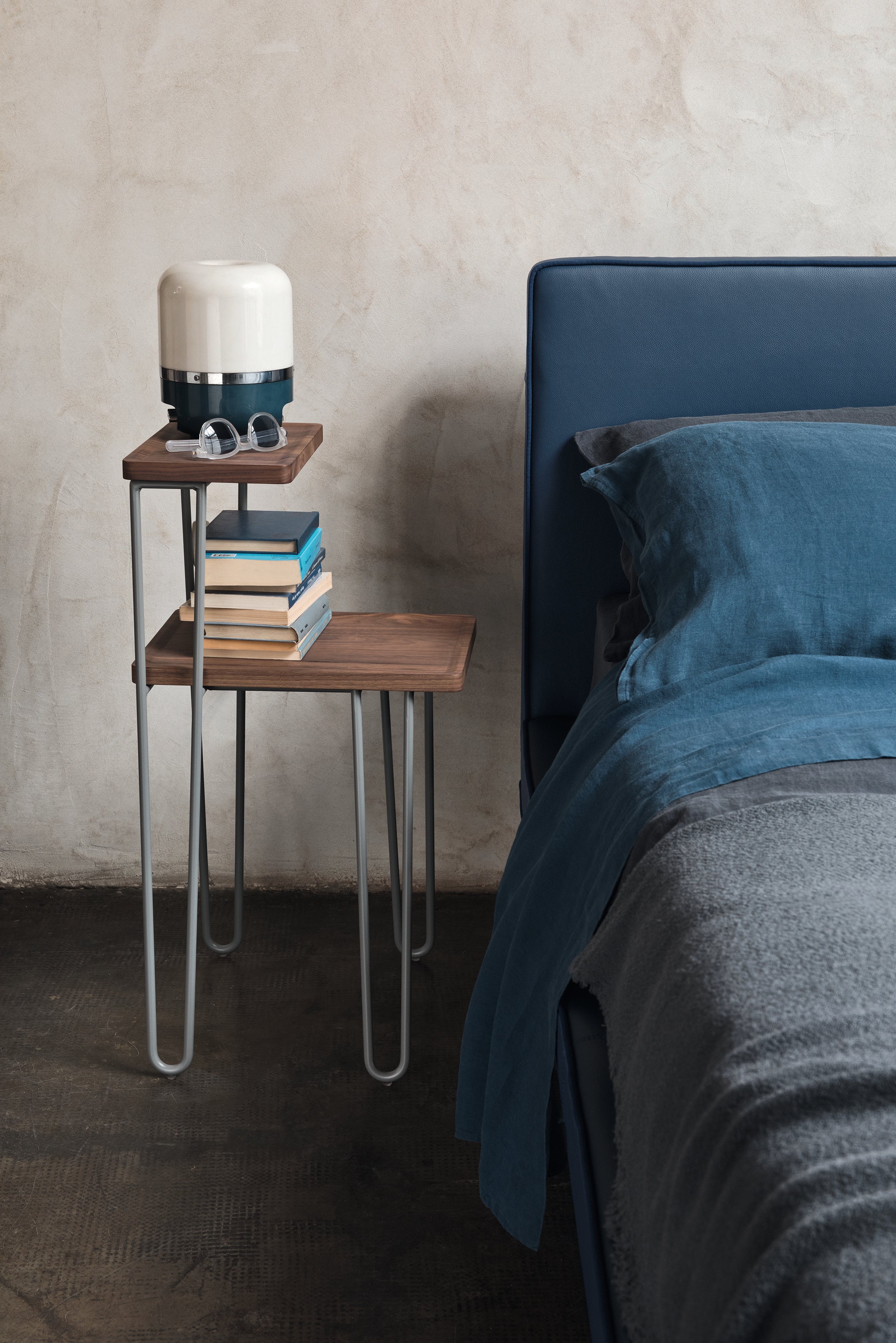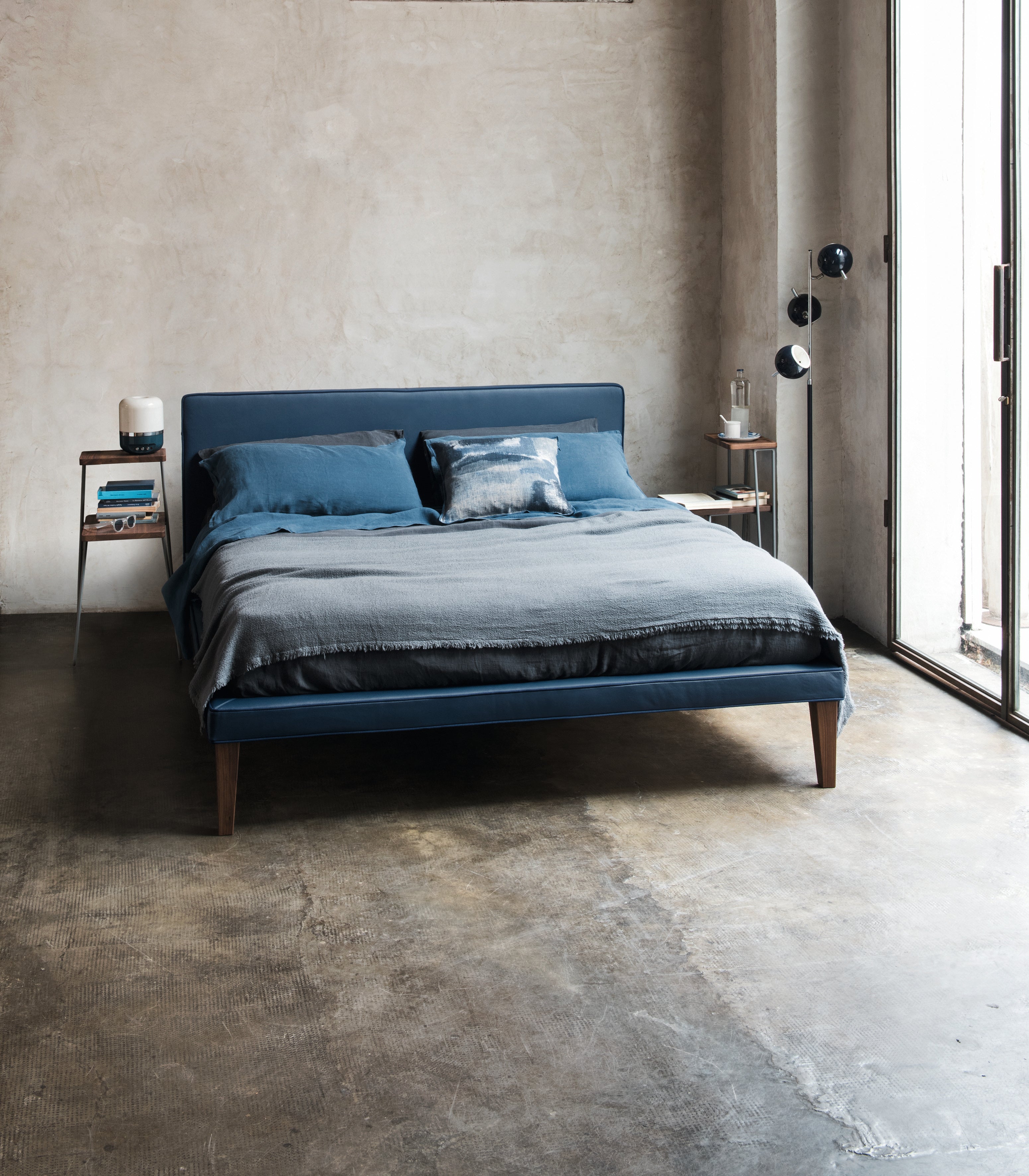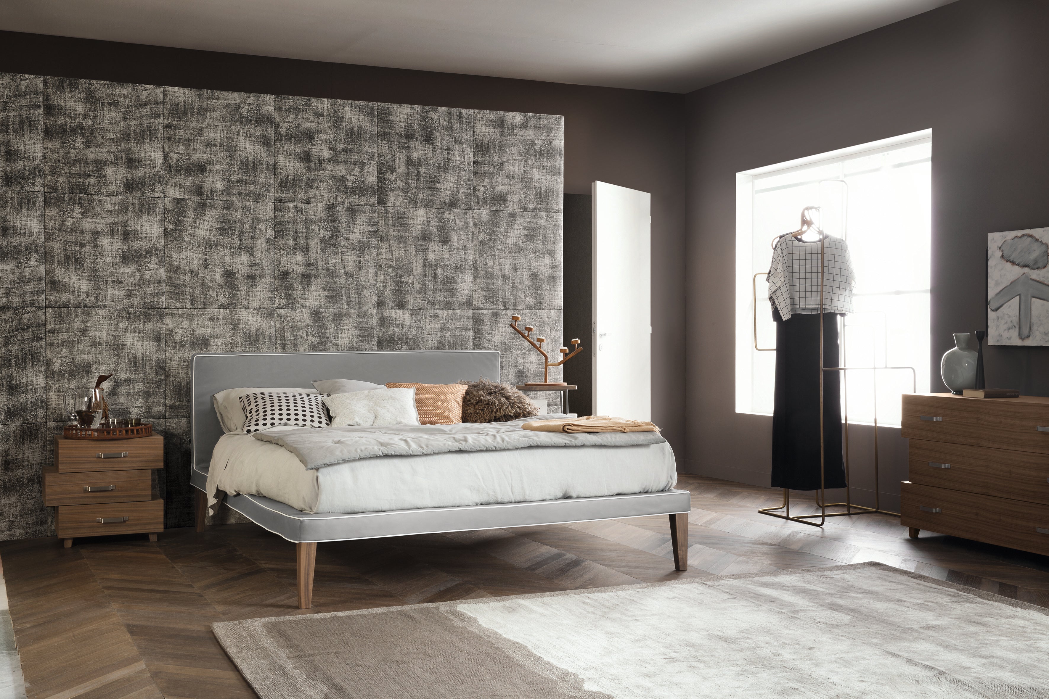 An essential bed, Cocò is suitable for any environment: poetic, iconic and familiar. Raised from the ground, it has a removable bed frame and a thin headboard with visible piping, available in contrasting colours to make its profile stand out. Upholstered with removable cover available in fabric or eco-friendly leather. The solid wood feet come in different finishes: natural walnut, or dyed in black, white, grey, ocean, dove-grey, blueberry, date or ginger.