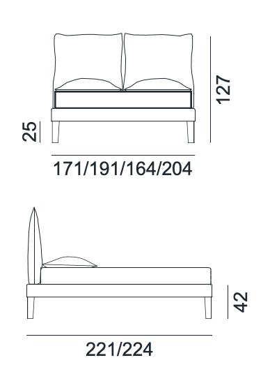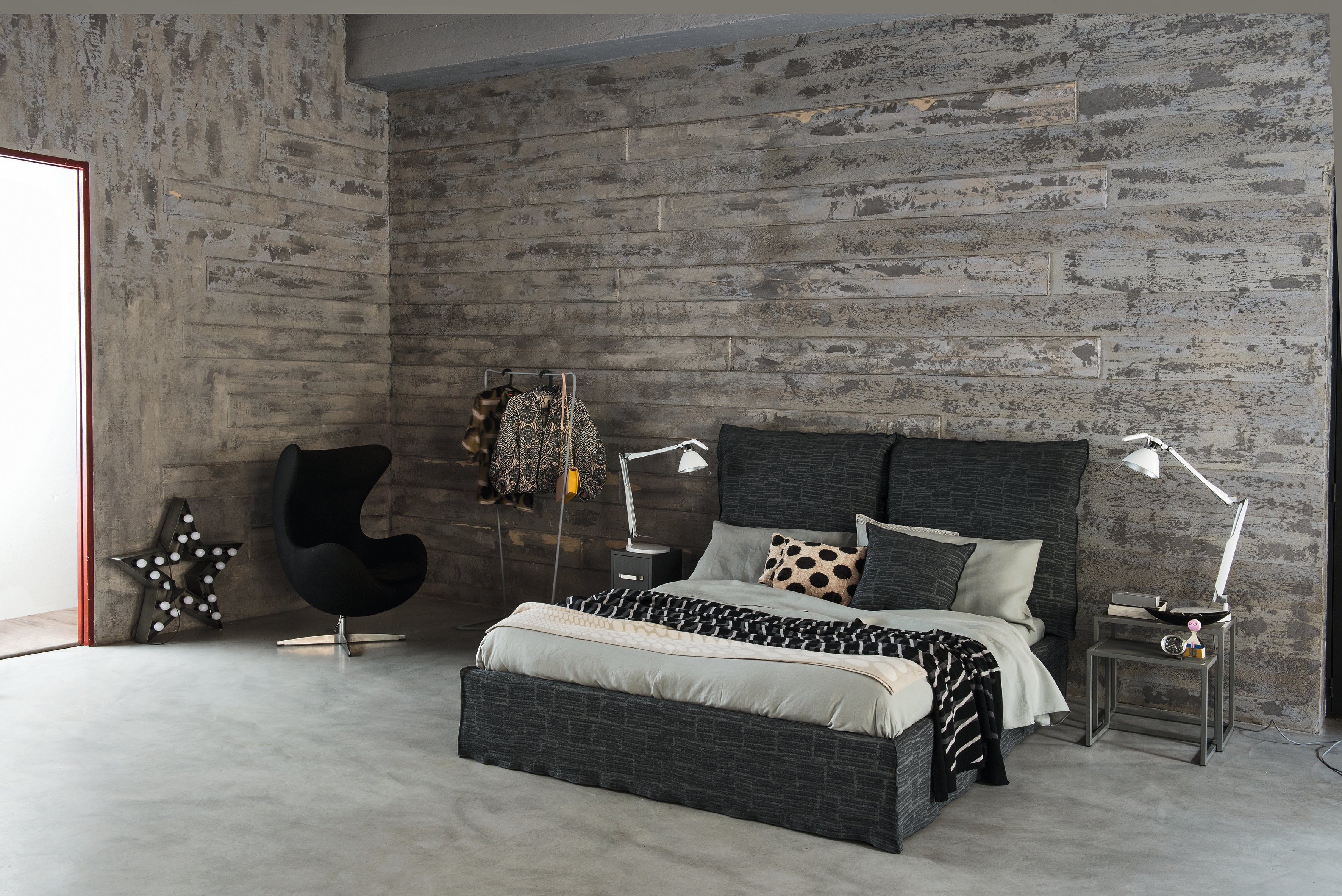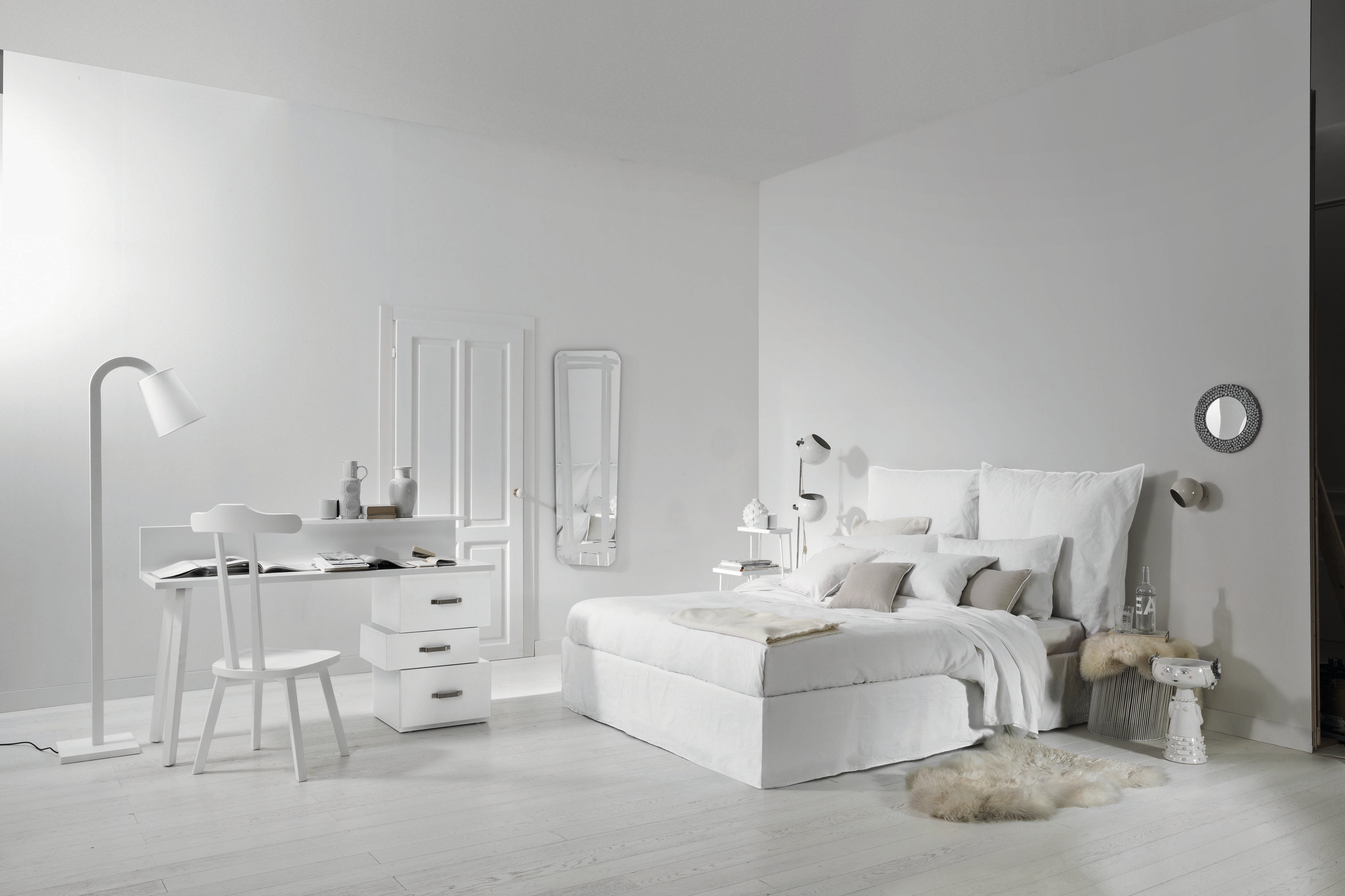 Soft and reassuring shapes inviting you to relax are what characterise Double, a removable upholstered bed, which comes with a large headboard and two oversized cushions. Double is a textile bed with a classic charm, available with visible solid wood feet in natural walnut, black, white, grey, ocean, dove-grey, blueberry, date or ginger and with possible free-bottom covering down to the ground.