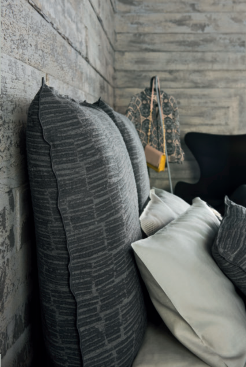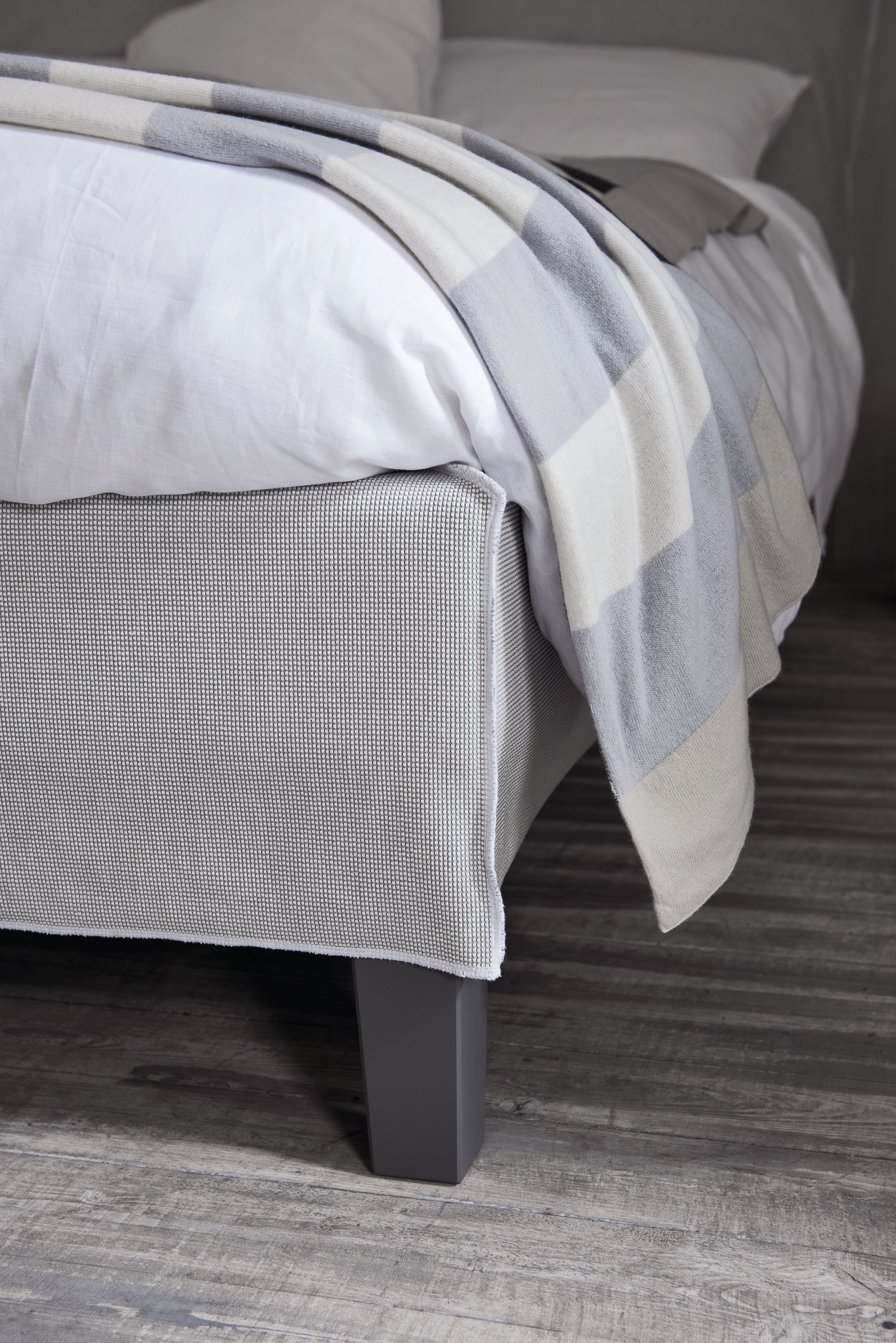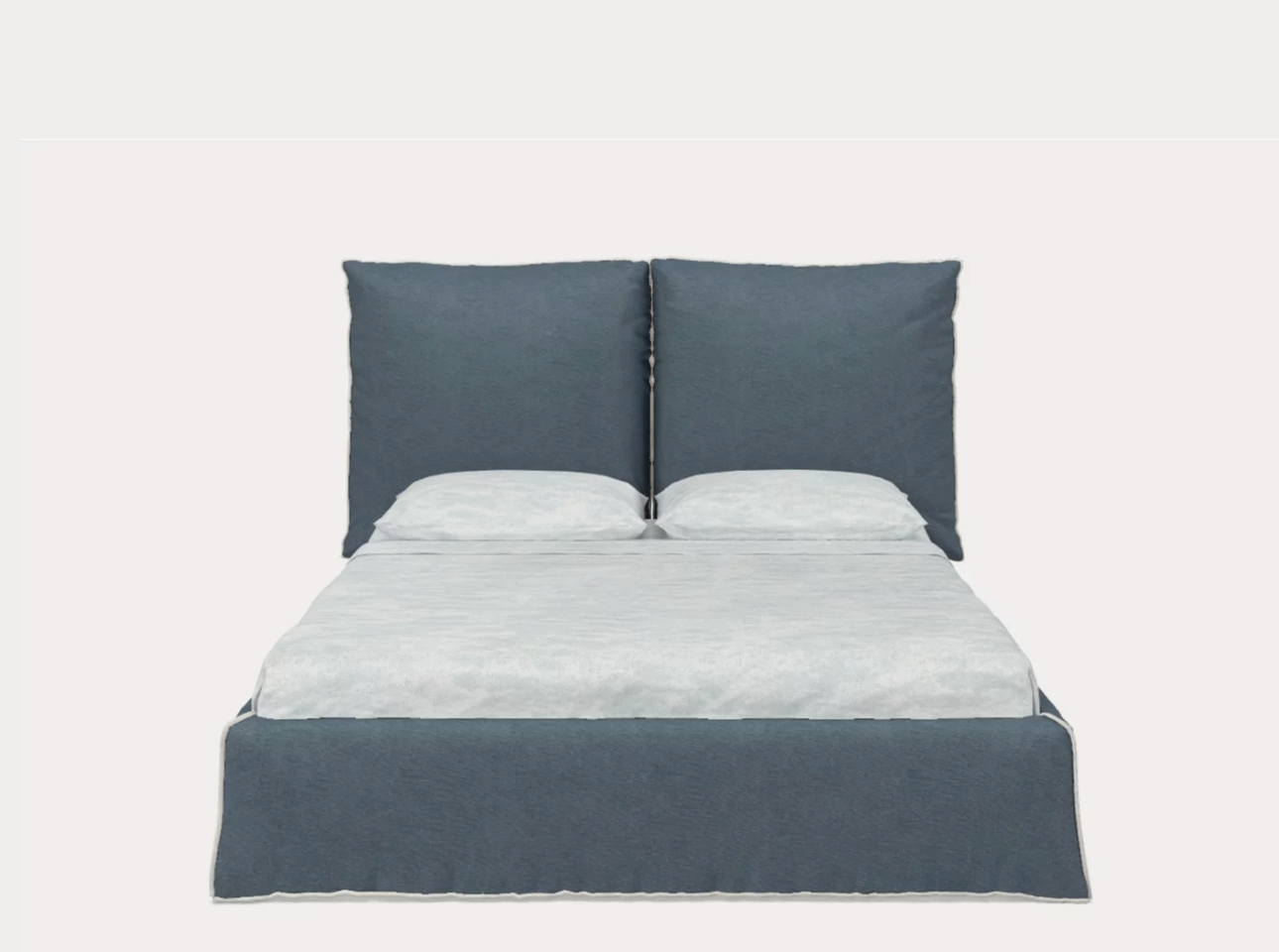 Upholstered bed with removable cover and removable bed frame, characterised by a large headboard consisting of two large cushions. A bed with a welcoming and inviting shape. The bed boasts a visual uniformity thanks to the textile structure that perfectly matches the solid wood feet, slightly hidden by a fabric skirt and available in natural walnut, black, white, grey, ocean, dove-grey, date, blueberry or ginger.