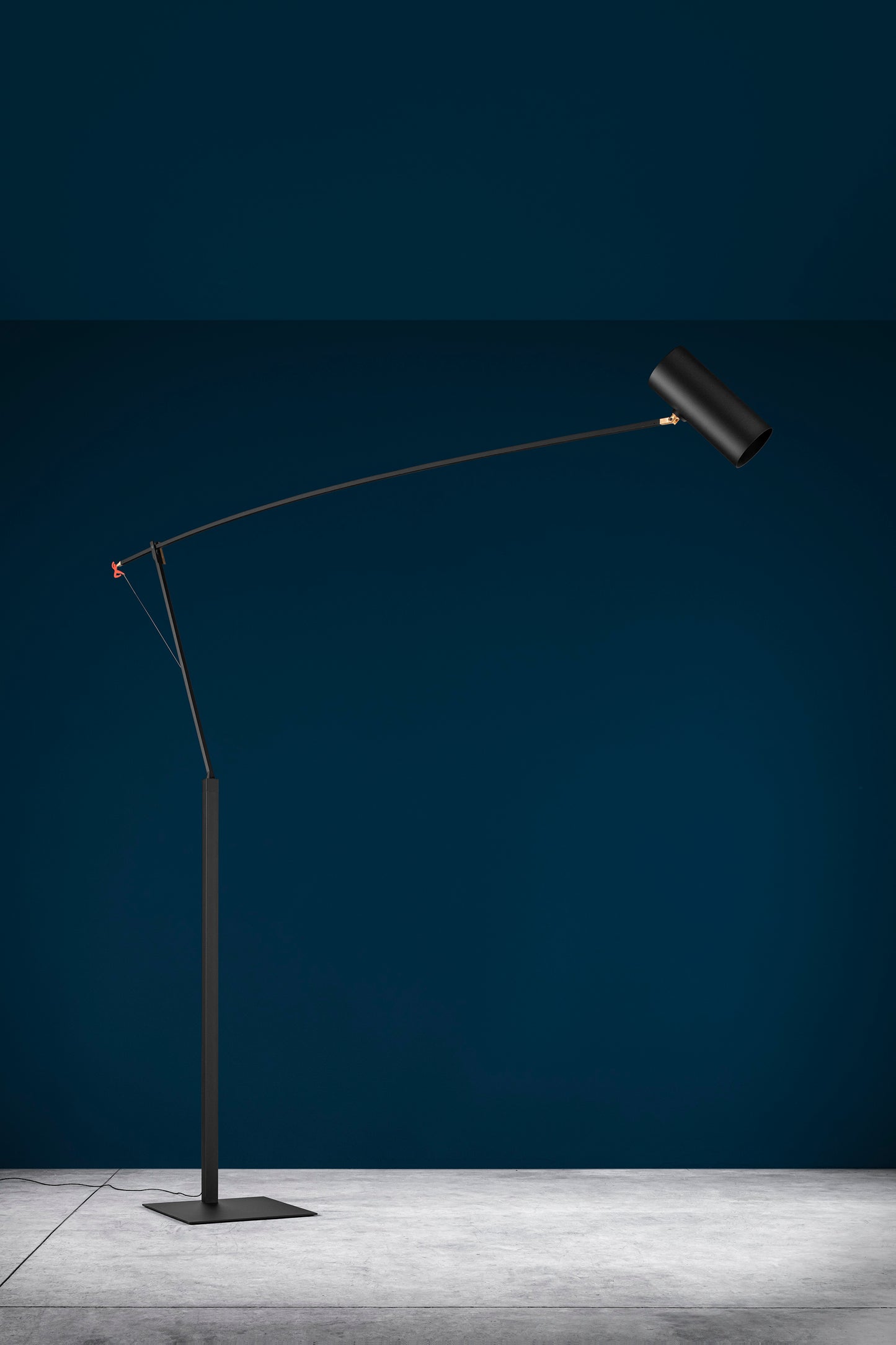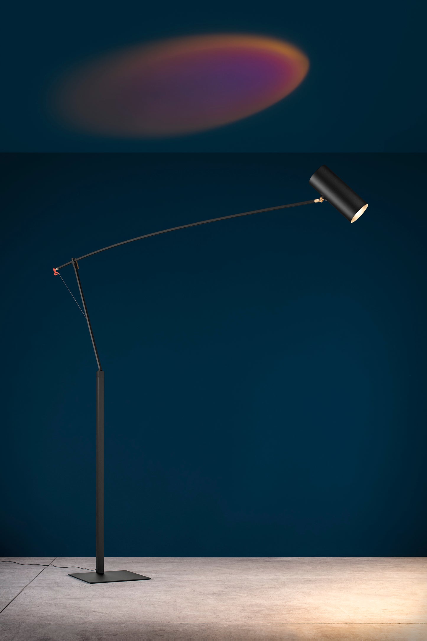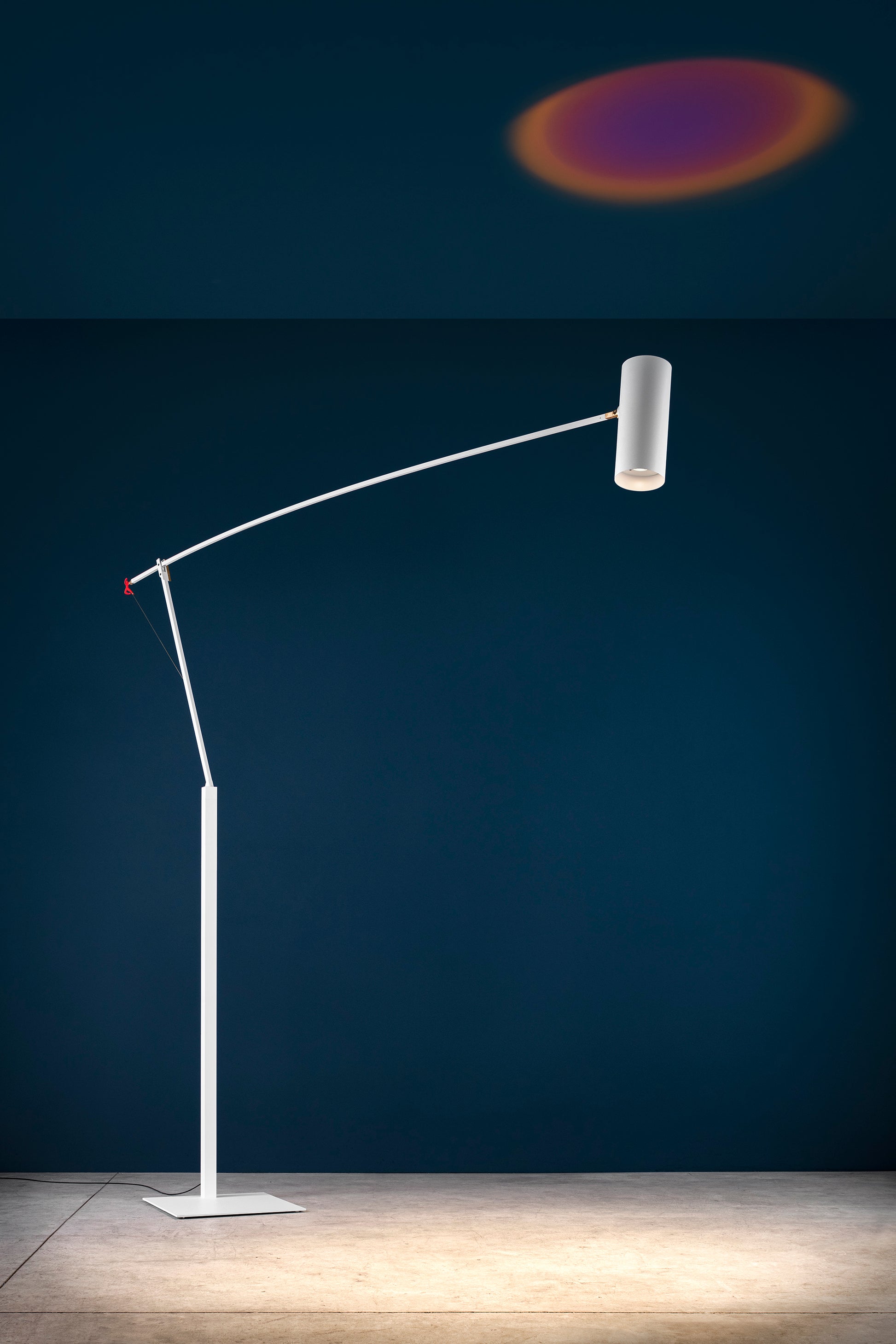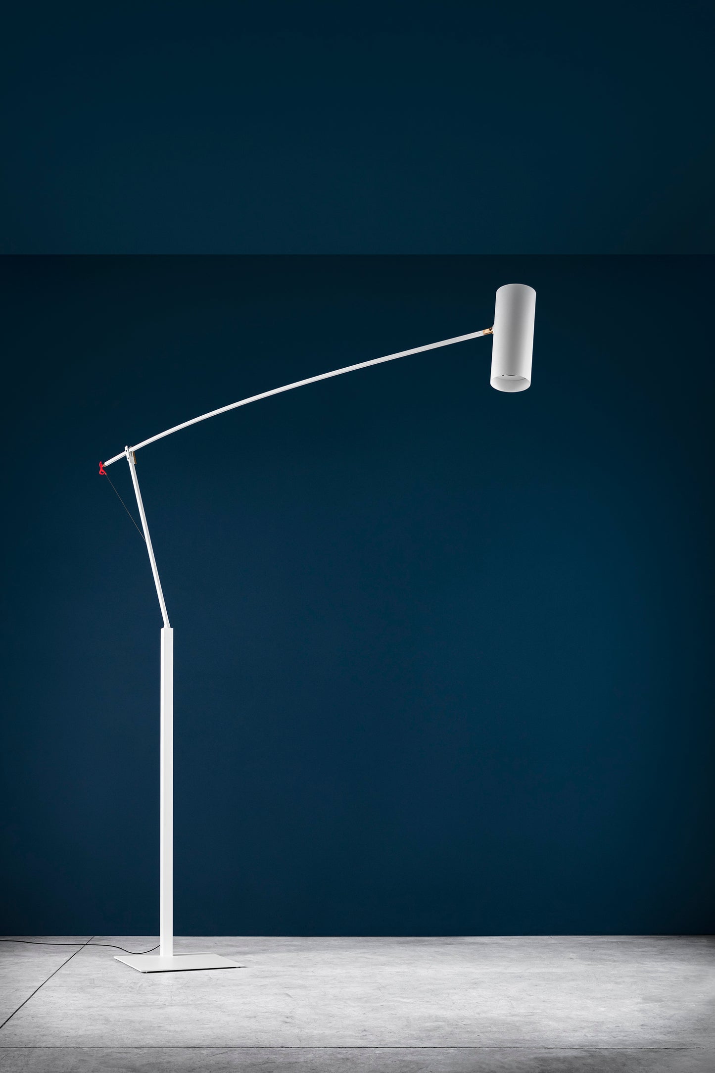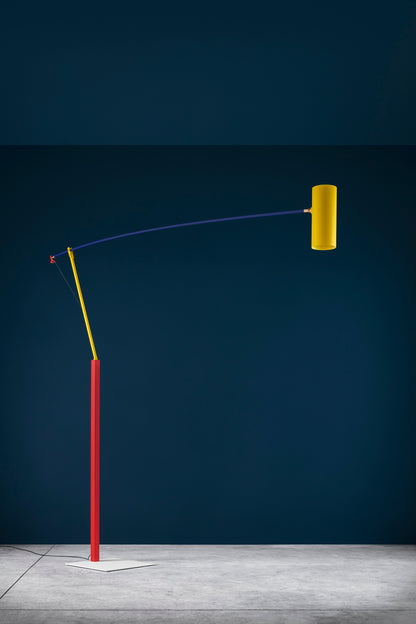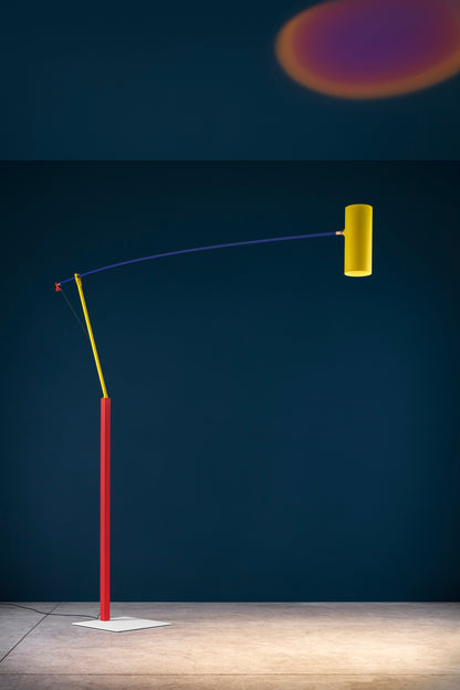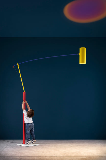 In 2004, colour became part of our catalogue for the first time, with the PostKrisi collection. Colour was used as a message of rebirth and joy. Today, that colour is back.” Also available in the classic black and white finishes, the “colourful” versions of the Ettorino lamps feature an elegant combination of primary colours, mixing blue, yellow and red. Preceded by the development of an innovative patented system, these new articulated lamps are characterised by a simple, rigorous design featuring surprising details. The signature feature of all the lamps is a functional detail in the shape of a red, dancing figure. Ettorino BIG is a large floor lamp designed for the lighting of a living room or a long table, thanks to a COB LED combined with a very wide optical lens that spreads the light evenly over the surface below.