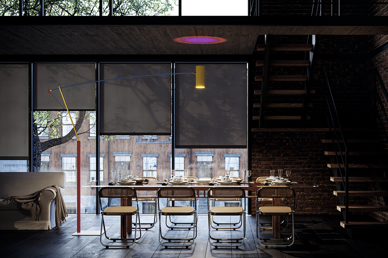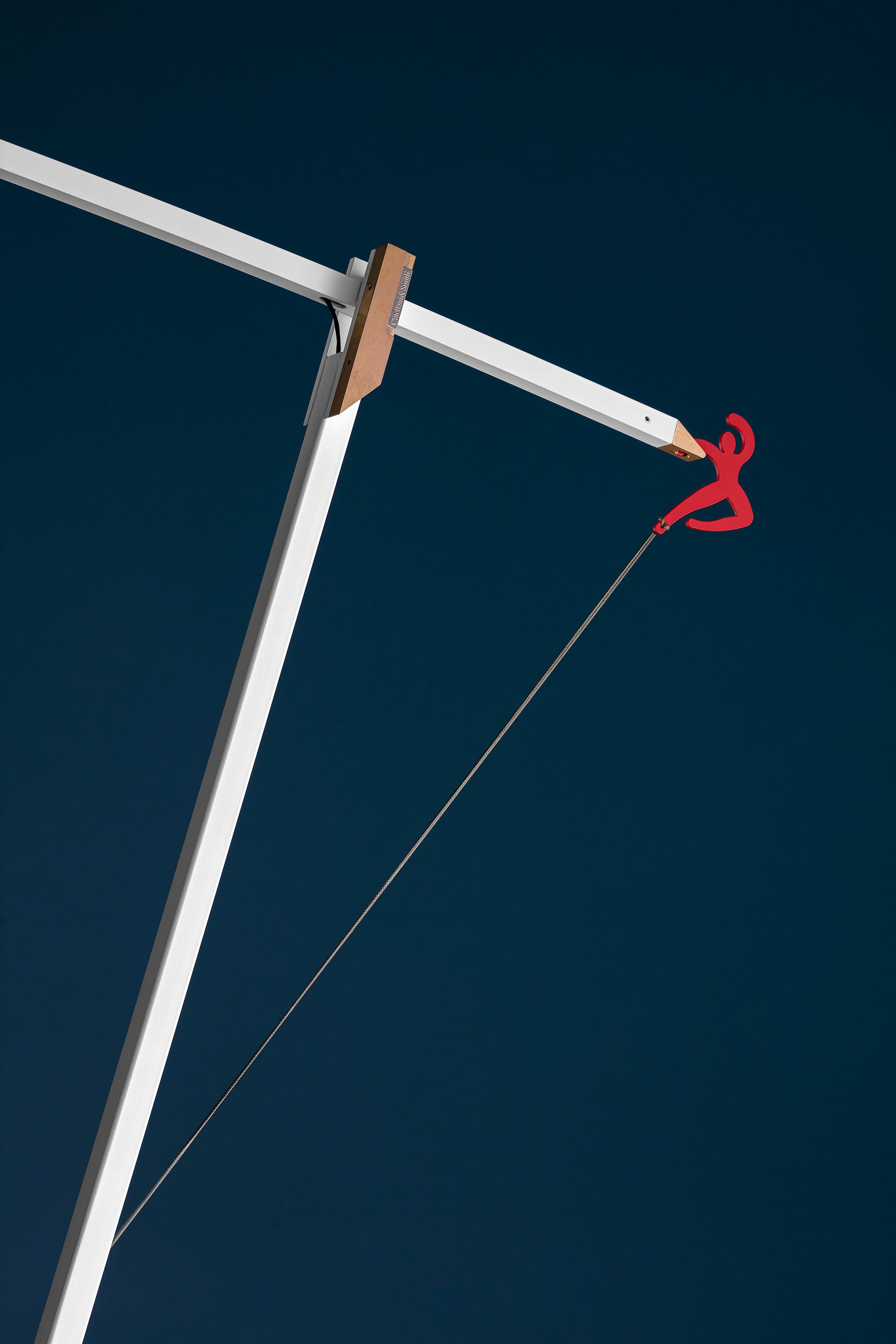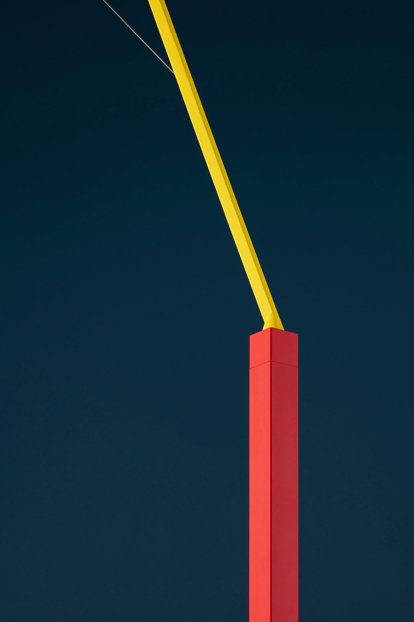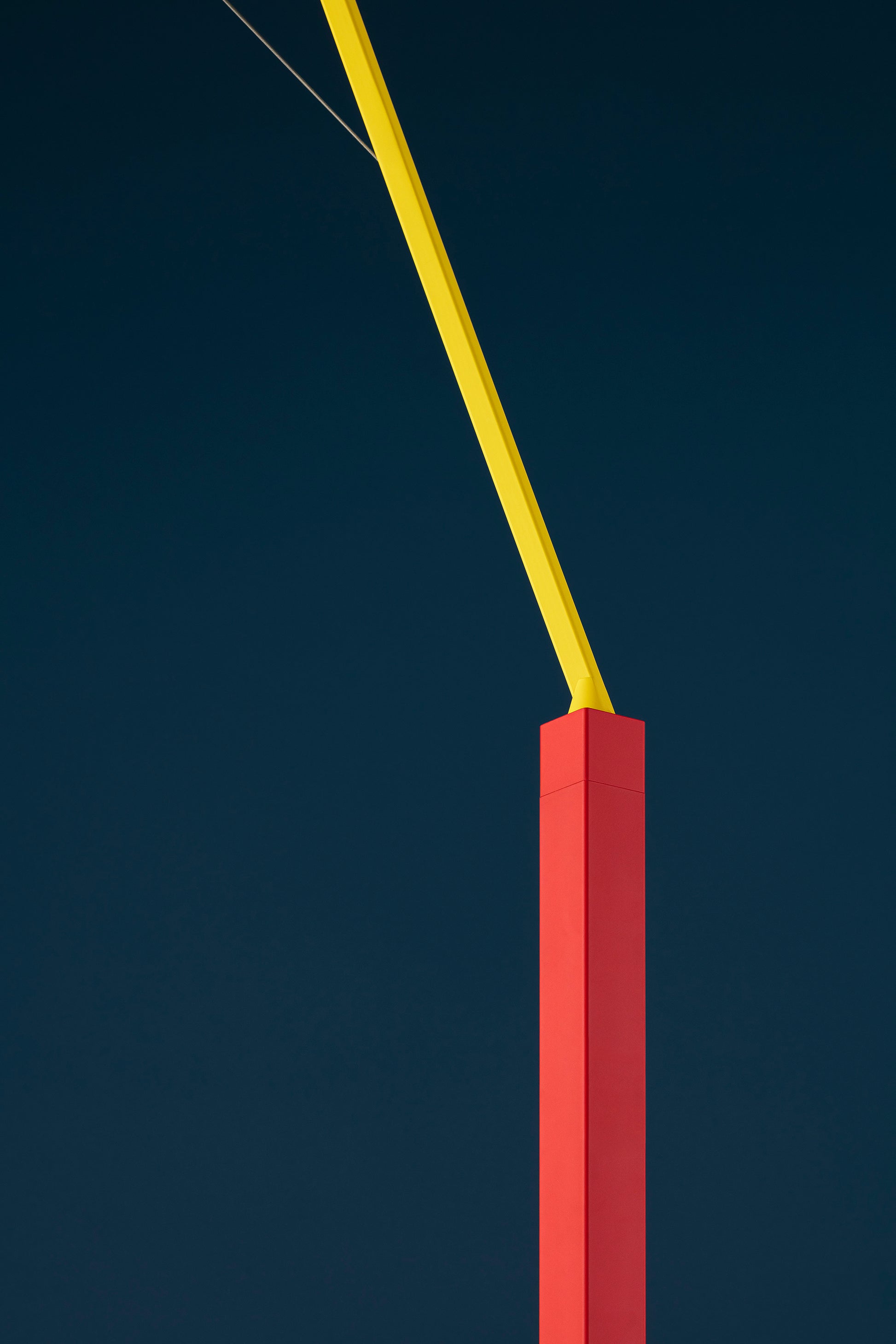 In 2004, colour became part of our catalogue for the first time, with the PostKrisi collection. Colour was used as a message of rebirth and joy. Today, that colour is back.” Also available in the classic black and white finishes, the “colourful” versions of the Ettorino lamps feature an elegant combination of primary colours, mixing blue, yellow and red. Preceded by the development of an innovative patented system, these new articulated lamps are characterised by a simple, rigorous design featuring surprising details. The signature feature of all the lamps is a functional detail in the shape of a red, dancing figure. Ettorino BIG is a large floor lamp designed for the lighting of a living room or a long table, thanks to a COB LED combined with a very wide optical lens that spreads the light evenly over the surface below.