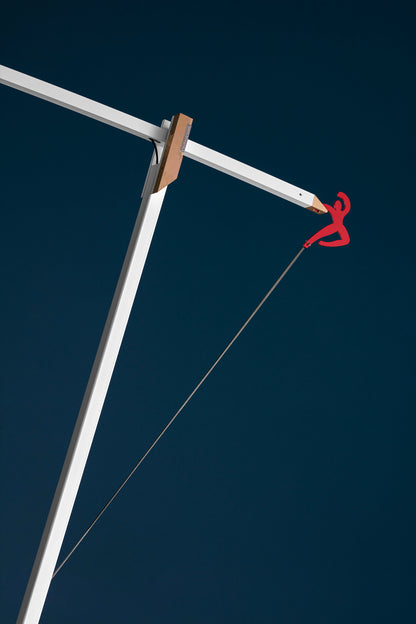 - white base / red vertical tube / yellow/blue structure / yellow tube / red man silhouette / brass details / black wire