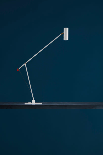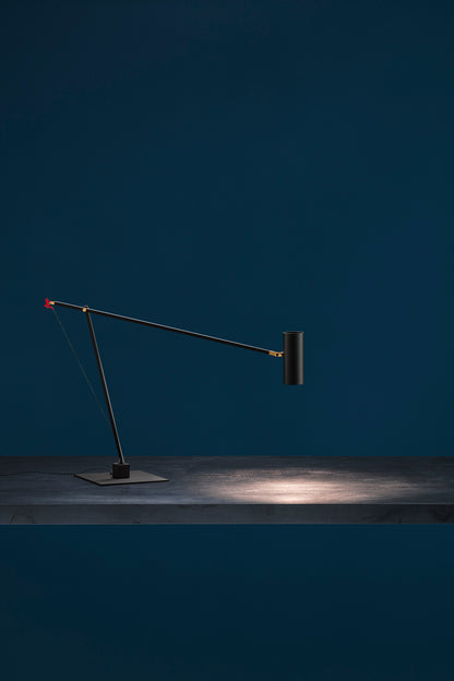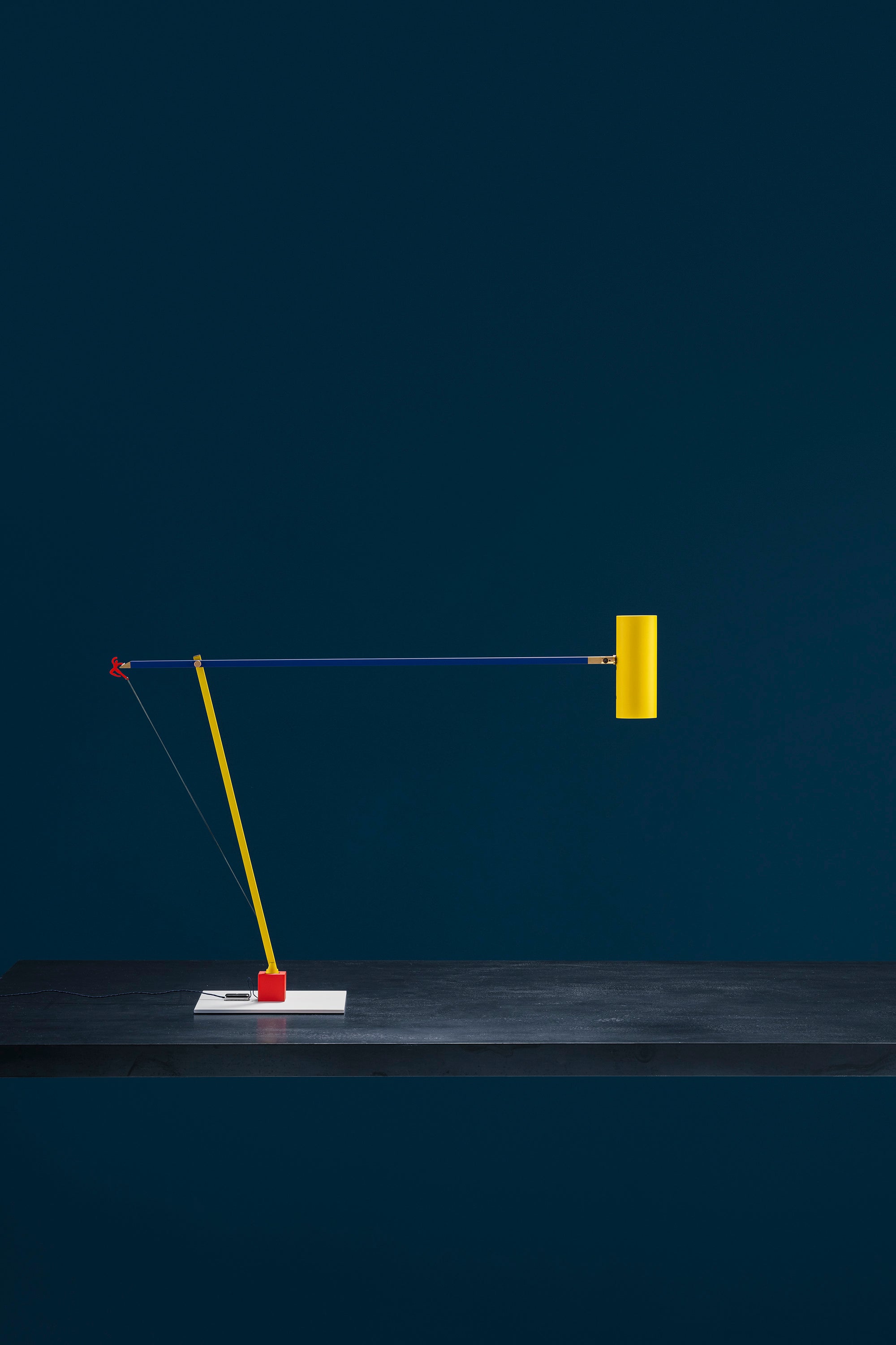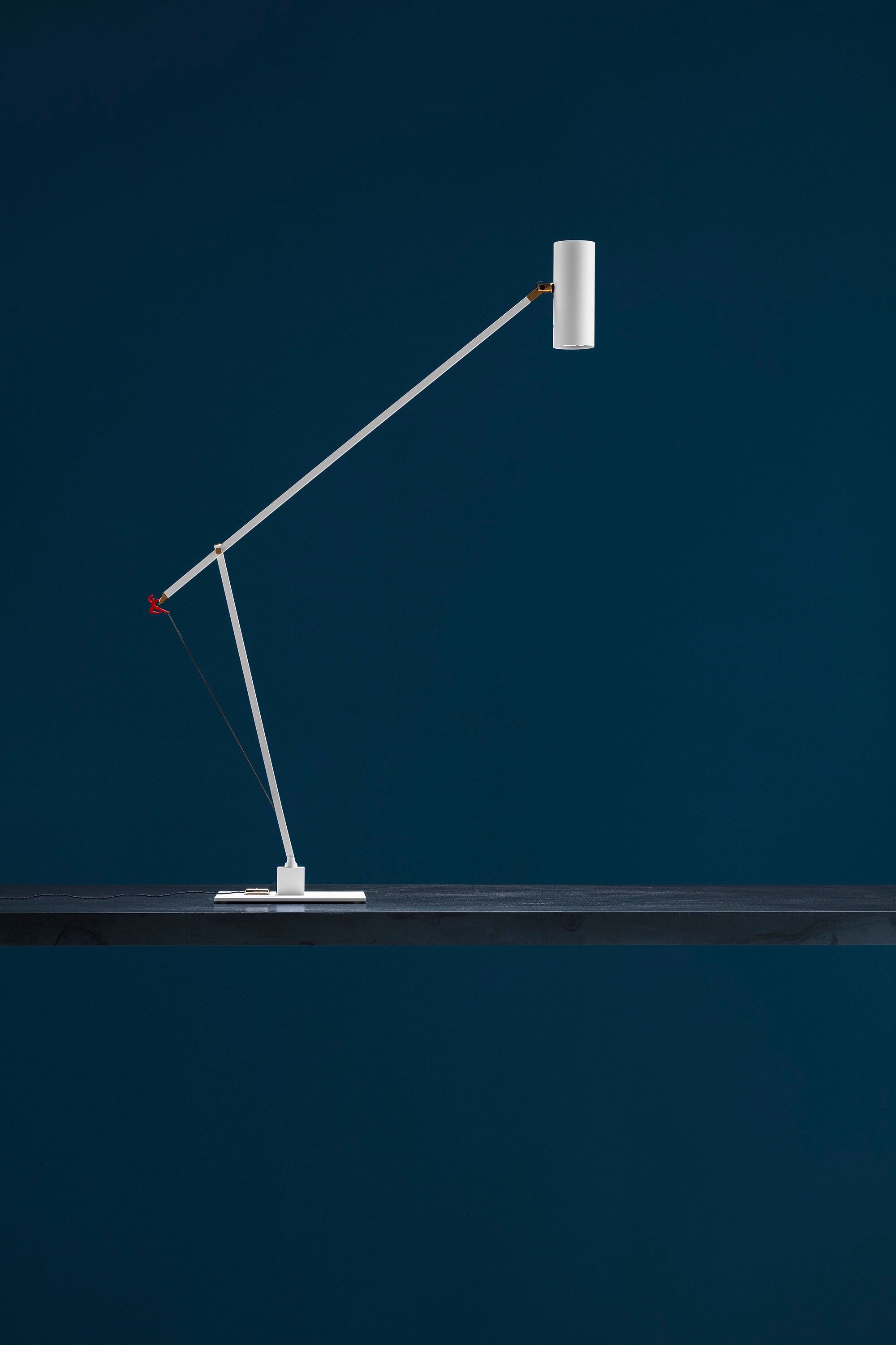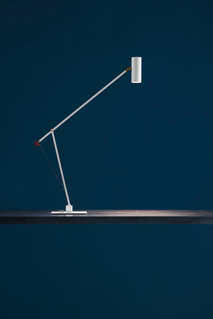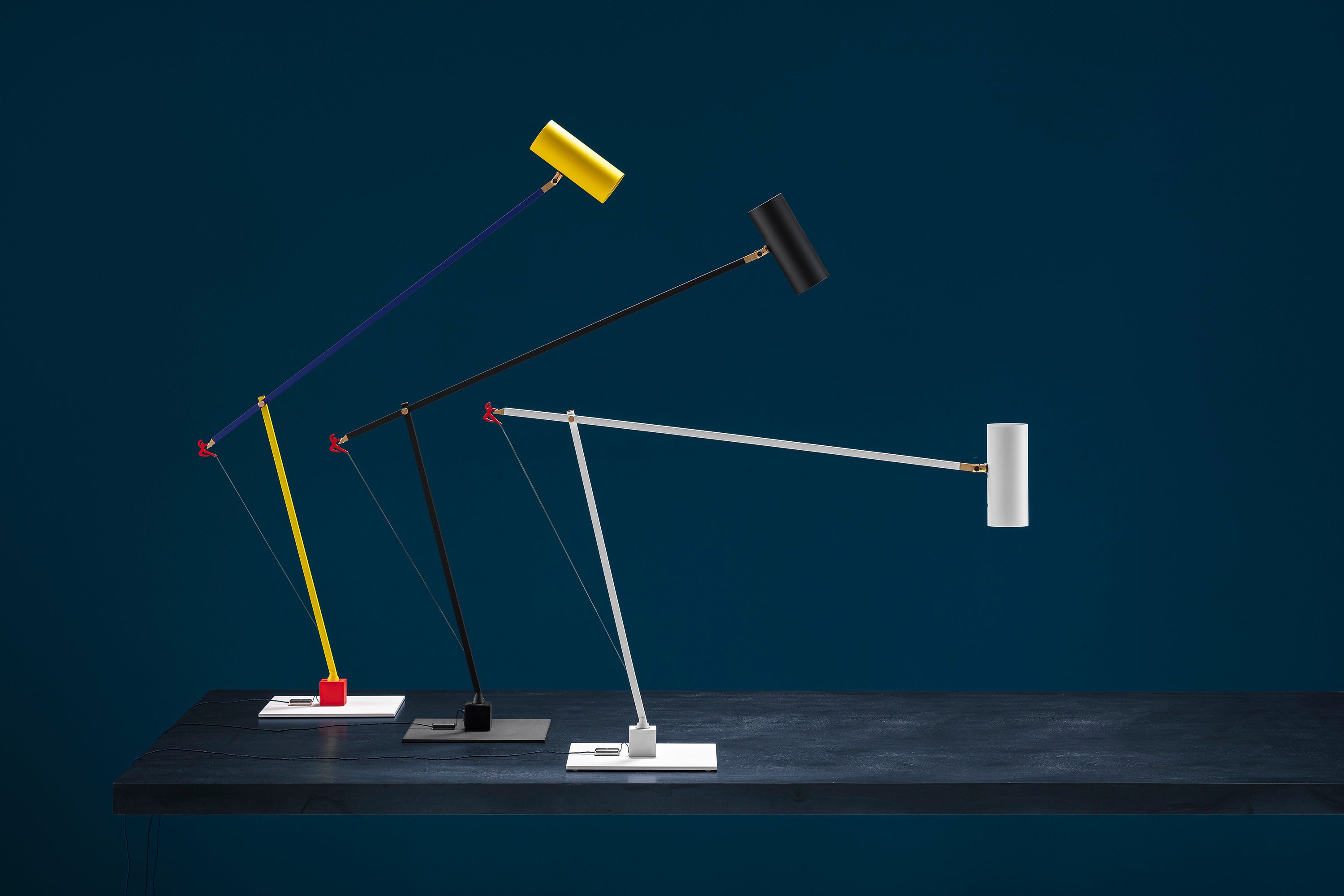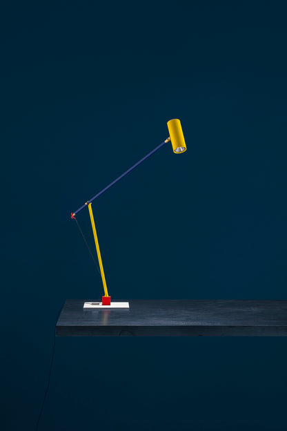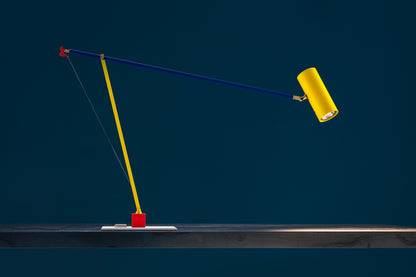 In 2004, colour became part of our catalogue for the first time, with the PostKrisi collection. Colour was used as a message of rebirth and joy. Today, that colour is back.” Also available in the classic black and white finishes, the “colourful” versions of the Ettorino lamps feature an elegant combination of primary colours, mixing blue, yellow and red. Preceded by the development of an innovative patented system, these new articulated lamps are characterised by a simple, rigorous design featuring surprising details. The signature feature of all the lamps is a functional detail in the shape of a red, dancing figure. Ettorino T has been designed as a desk lamp, to offer suitable lighting for work surfaces thanks to the possibility to move and rotate it.