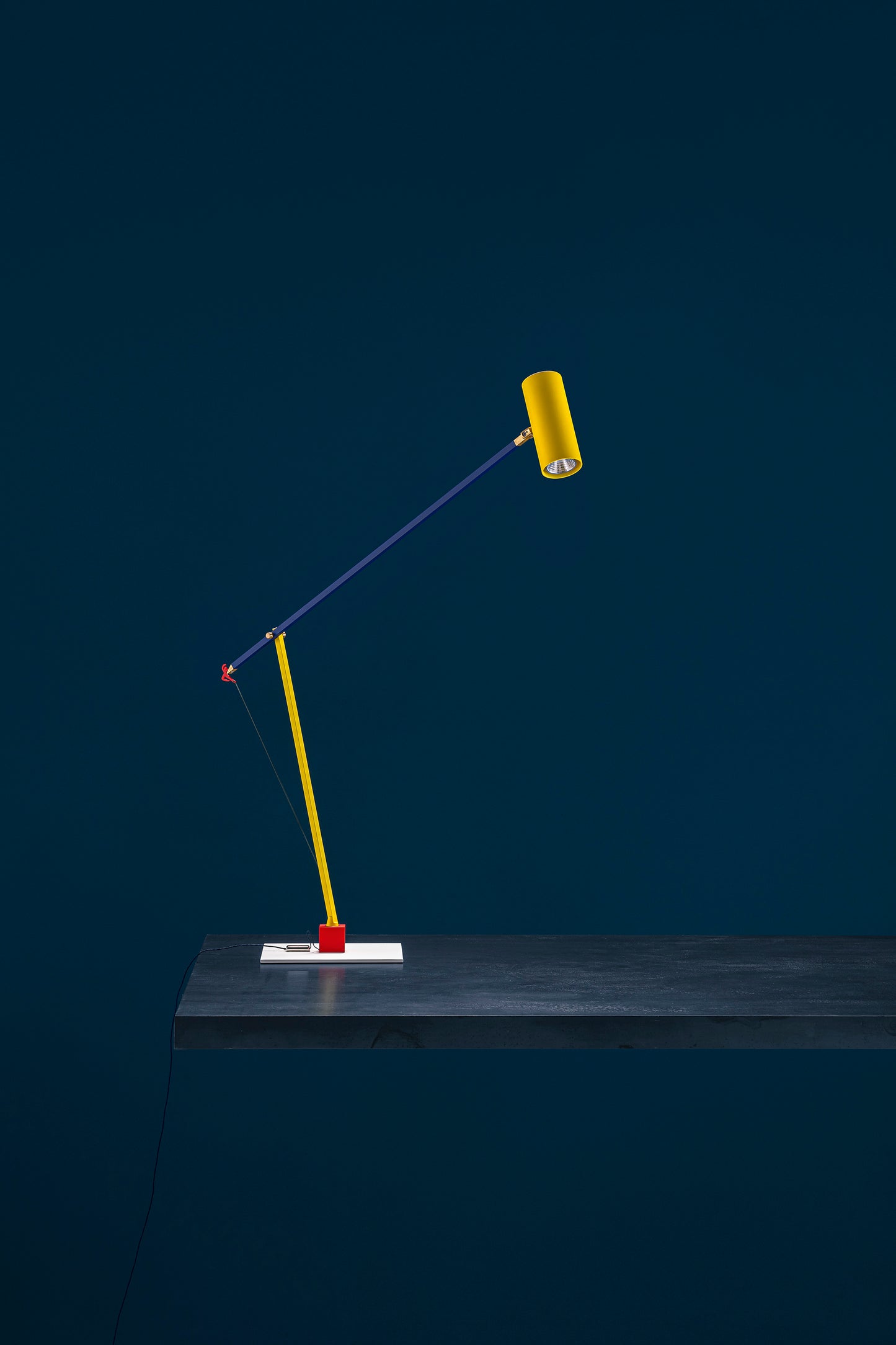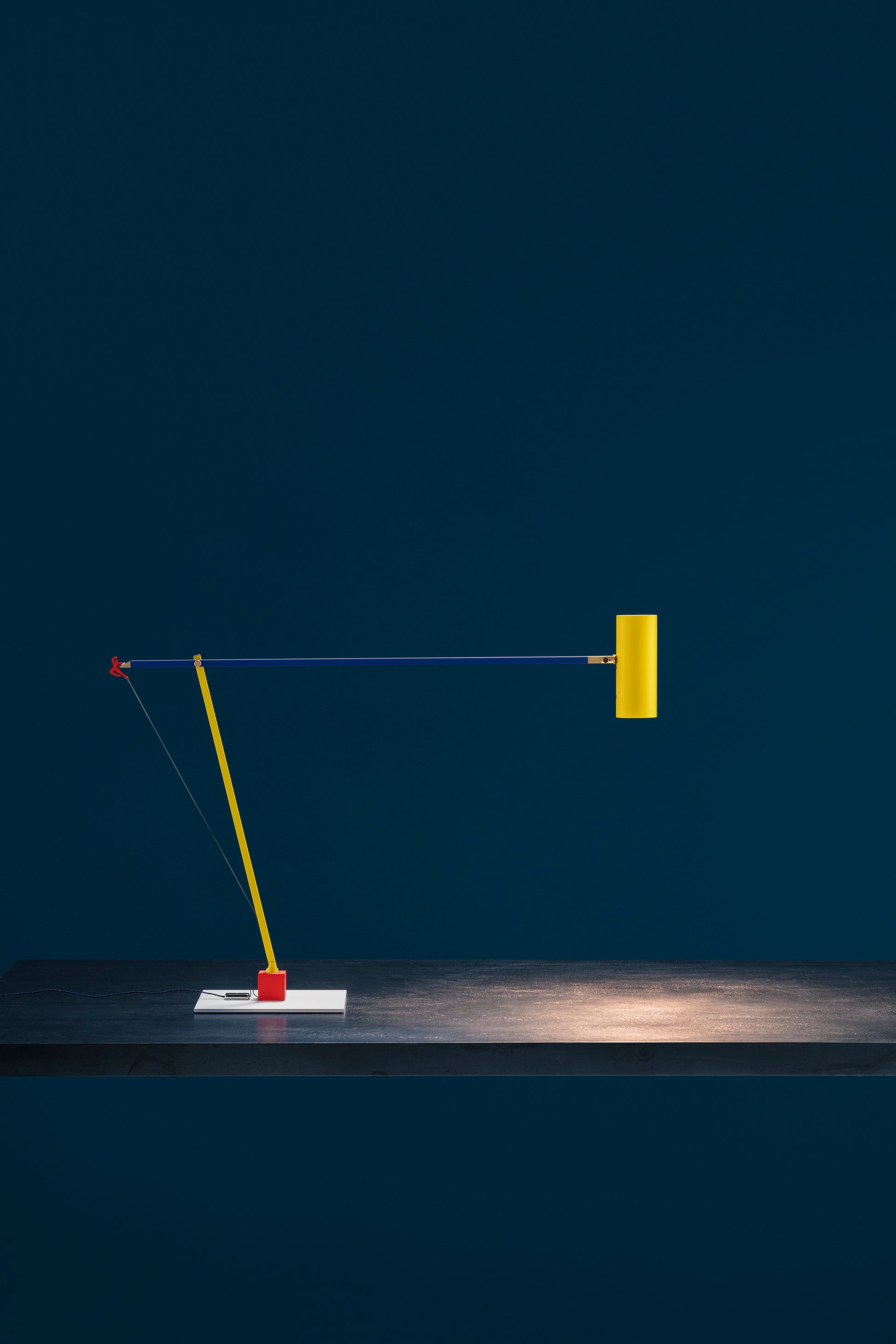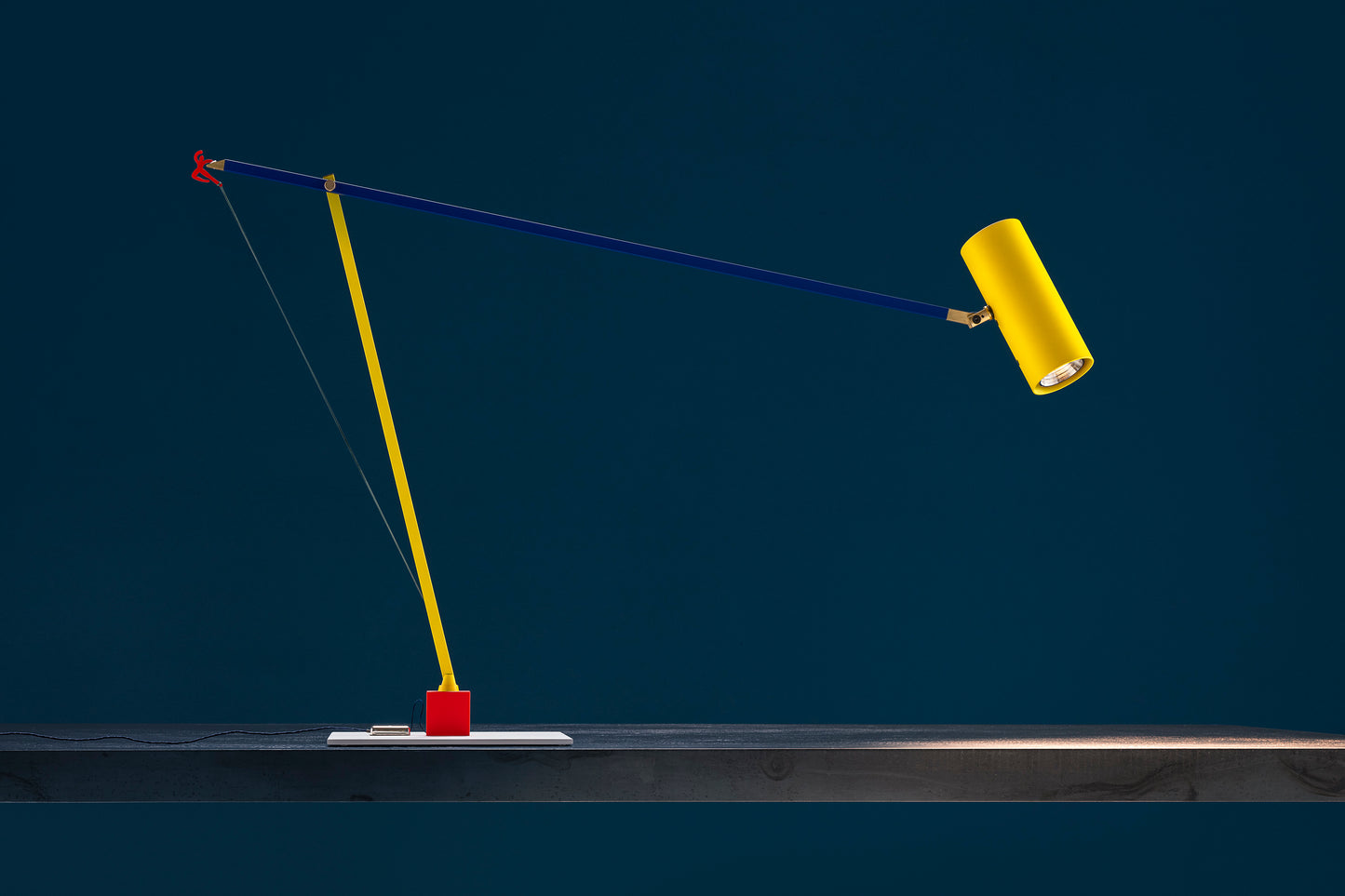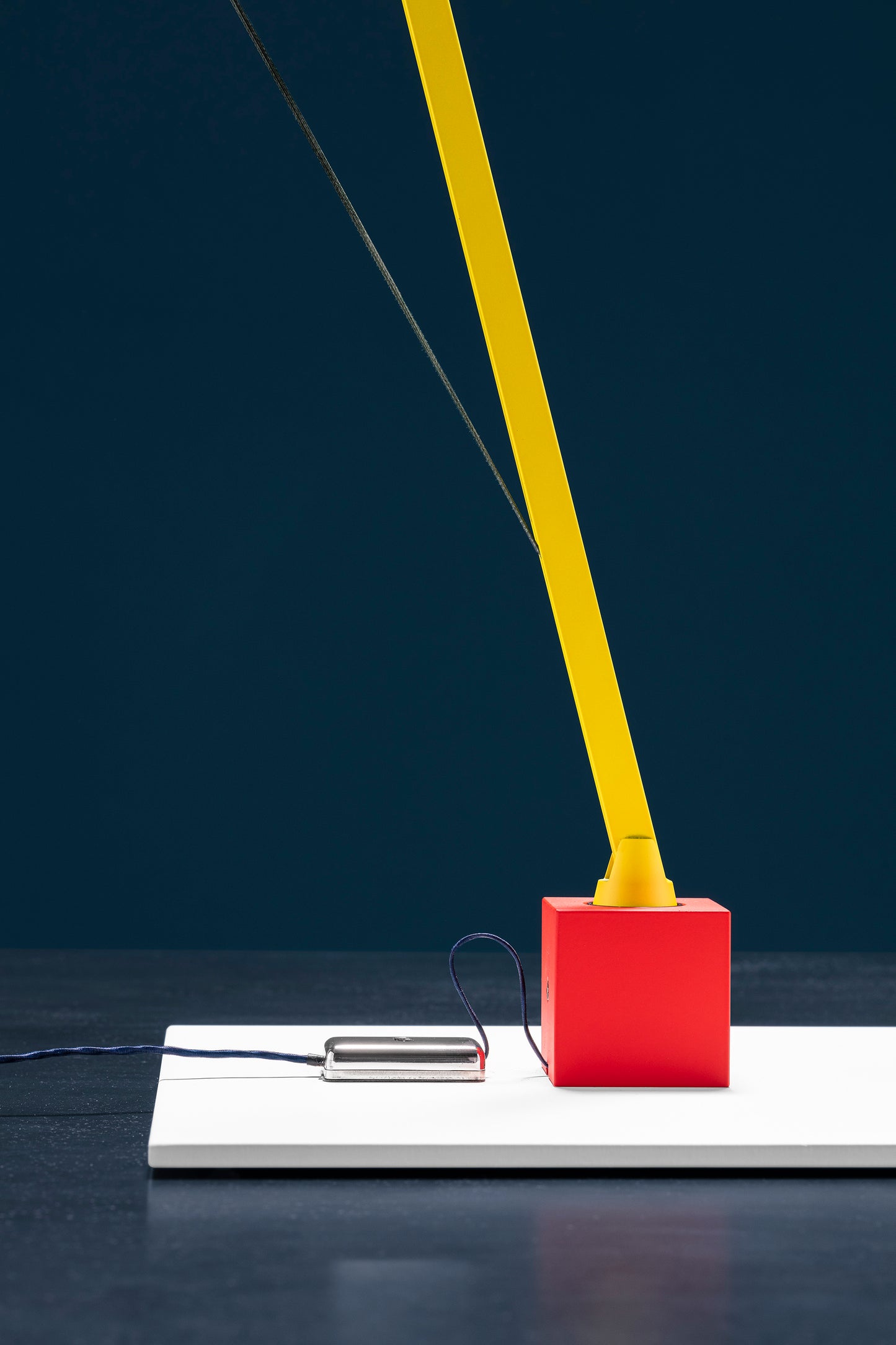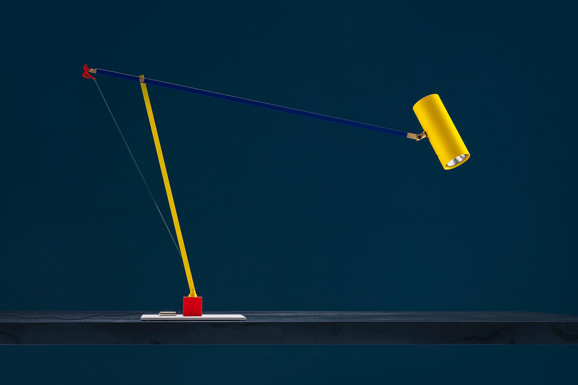 -white base with red cube / yellow/blue structure / yellow tube / red man silhouette / brass details / nickel dimmer / blue wire