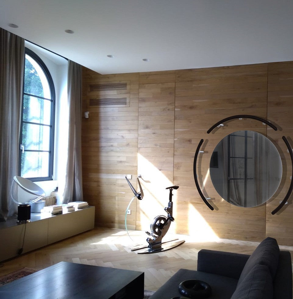 Developed in co-operation with Woodfriend and designed by Davide Negri and Luca Schieppati, Ciclotte Wall-bar in an unmissable complement for any interior design and luxury gym project: a real gymnastic ladder, but a unique mirror when the exercising racks are folded away