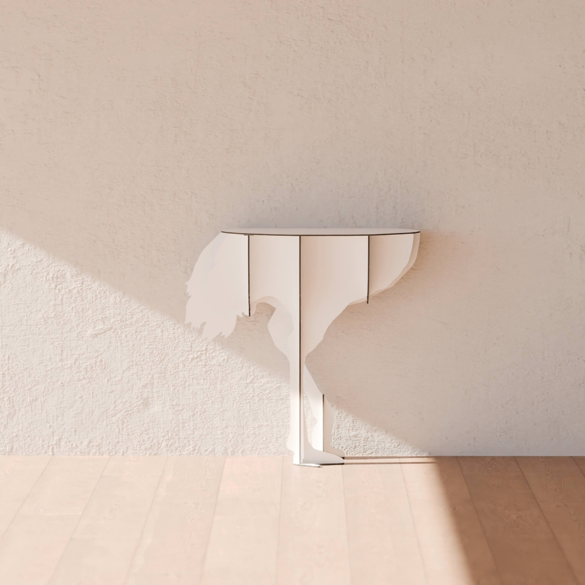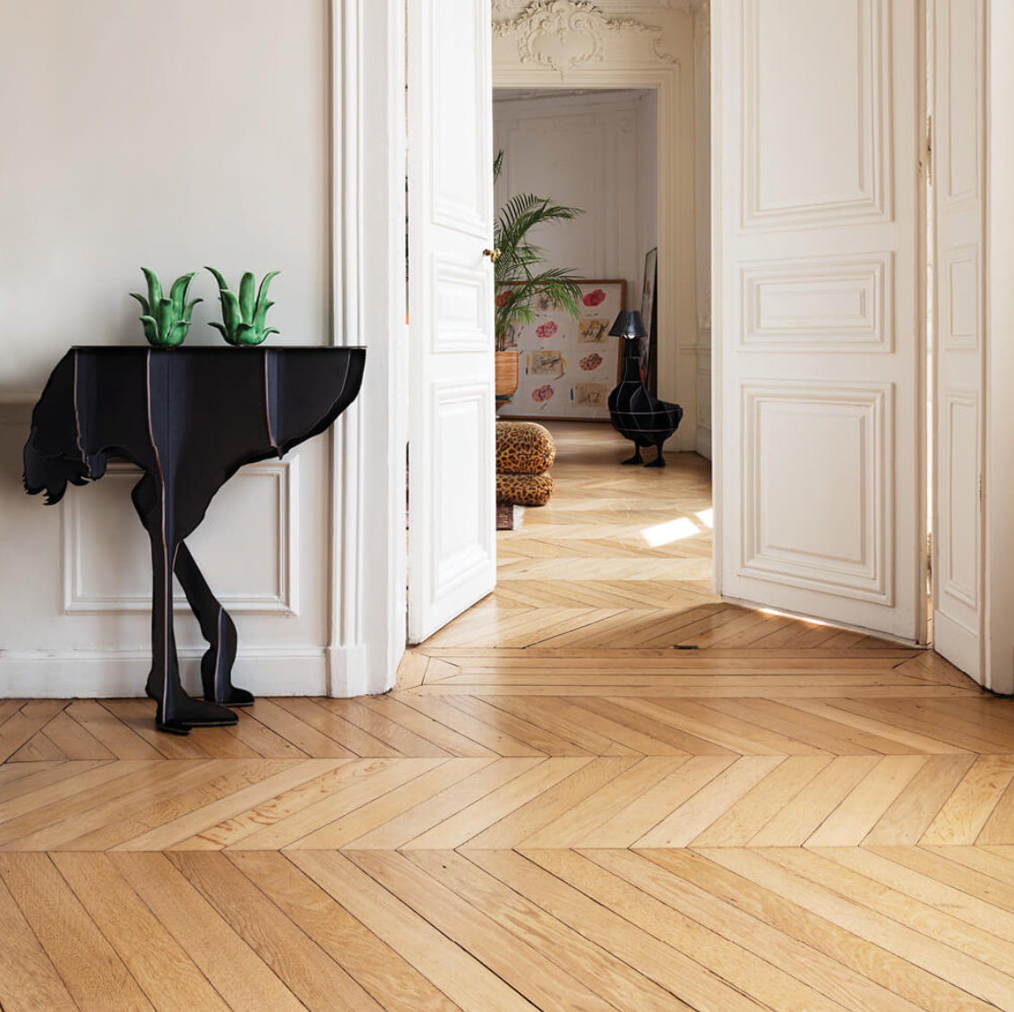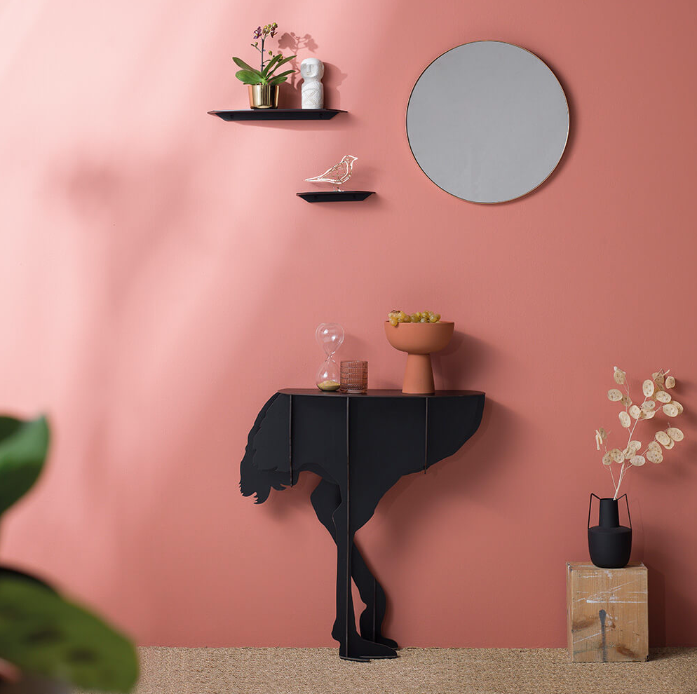 Airy, the Diva ostrich seems ready to take flight in a crazy race and defies the laws of gravity with its two feet barely anchored to the ground. Designed to lean against the wall, the elegant, ornamental and practical console creates surprise and asserts its eccentric femininity in the interiors it inhabits.