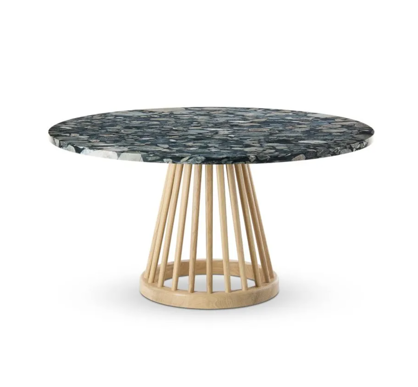Fan is a modern take on the classical Windsor design. The round table is a British archetype converted to a contemporary silhouette, creating an exclamation mark in any space with a semi transparent structure that takes up minimal visual mass. Featuring a natural wooden base and a versatile and hardwearing round top in pebble marble.