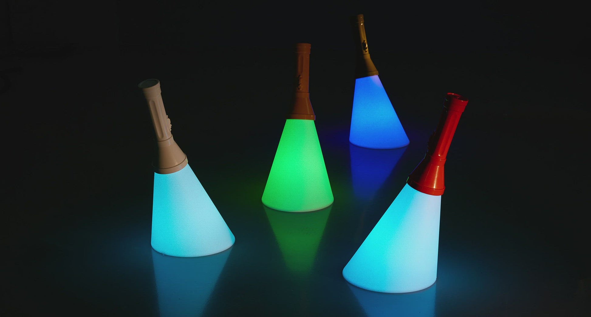 Make no room for darkness in your home with Flash, saviour of the universe!Flash is a flashlight shape lamp, designed by Studio Job, that has an illuminated light trace intended as a symbol of life, progress, and salvation against the shadows in our lives. Wireless, with a rechargeable battery and LED light, it can be regulated from a distance by remote control.