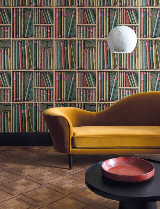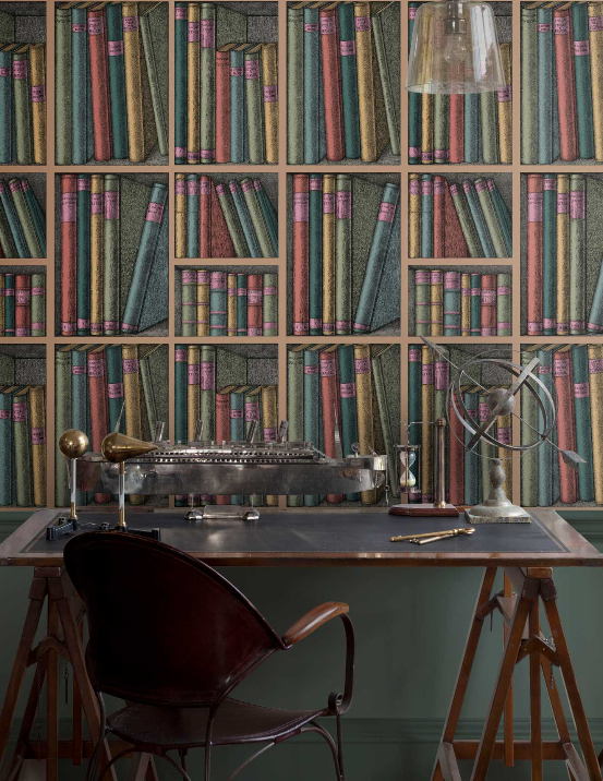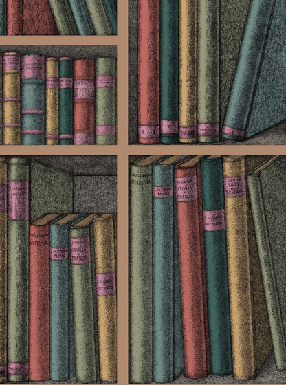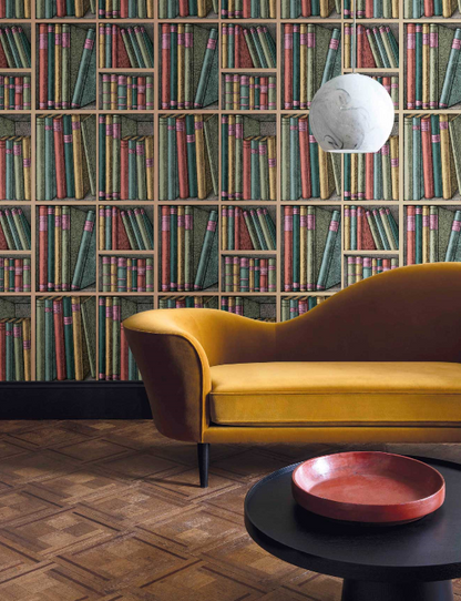 An avid collector of literature volumes on the applied arts, Fornasetti used books as a recurring theme which can be found throughout the Atelier's archive. This library Trompe d'oeil scene, abundant in leather-bound books, is adapted from a 1953 screen. The Forest colourway comprises of pine and fern green delicioously accented with bright tones of rich tomato, cerise and decadent saffron creating a vibrant and conversational wallcovering.