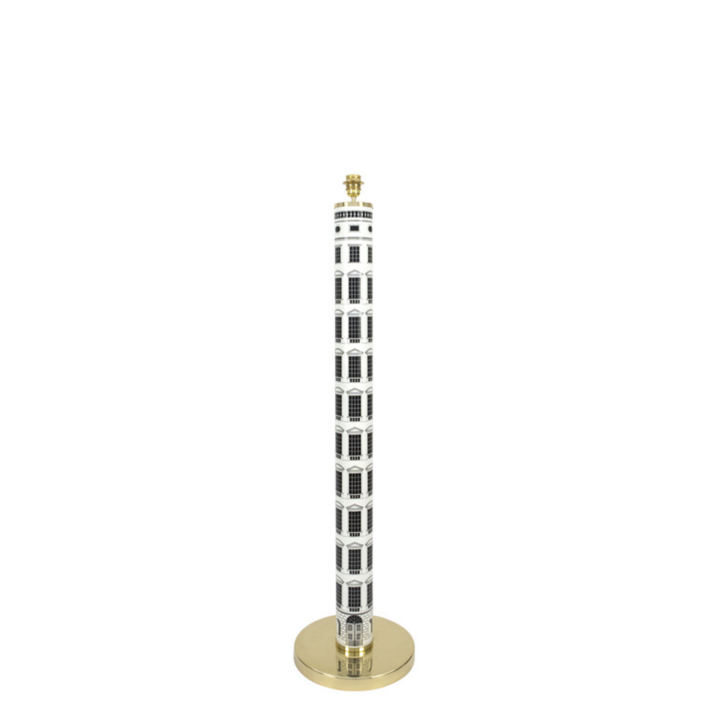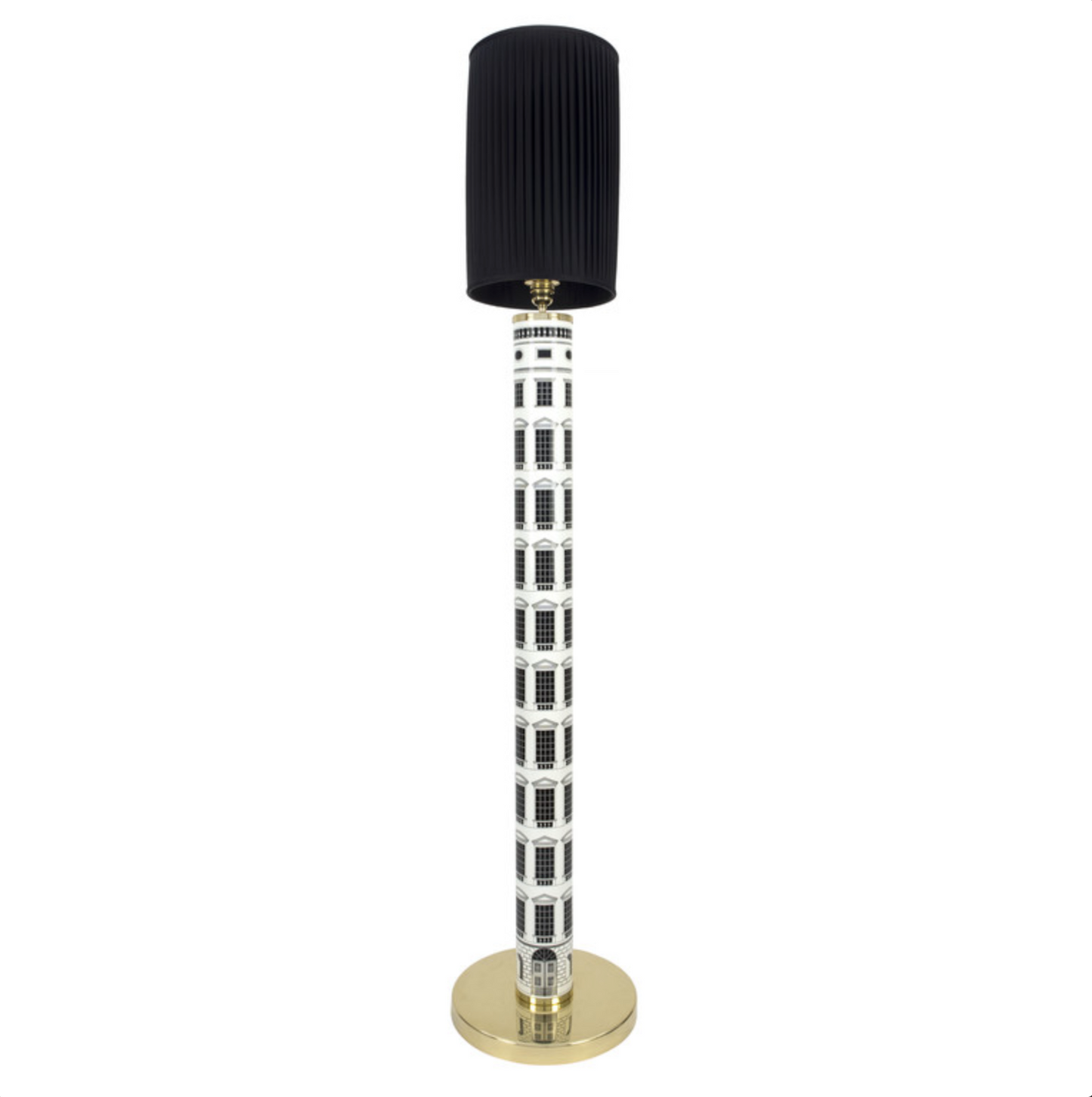 • The architectural decoration makes this hand-silkscreened and decorated floor lamp resemble an imaginative Renaissance skyscraper. Its mere presence illuminates living spaces and environments with wonder.