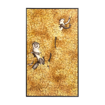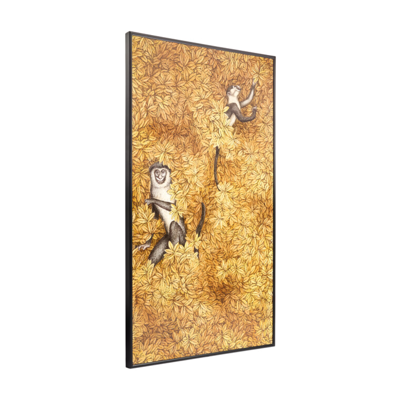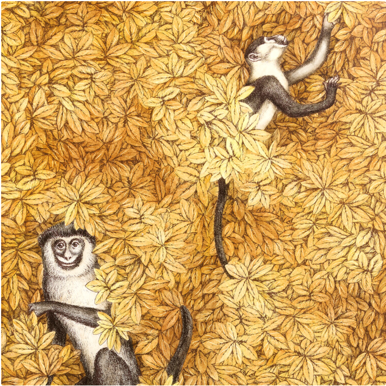 In the intricate foliage of the Scimmie e Foglie panel, a three-dimensional effect is achieved with colour gradients meticulously applied with a brush. The monkeys hidden in the vegetation humorously interpret the spirit of Fornasetti.