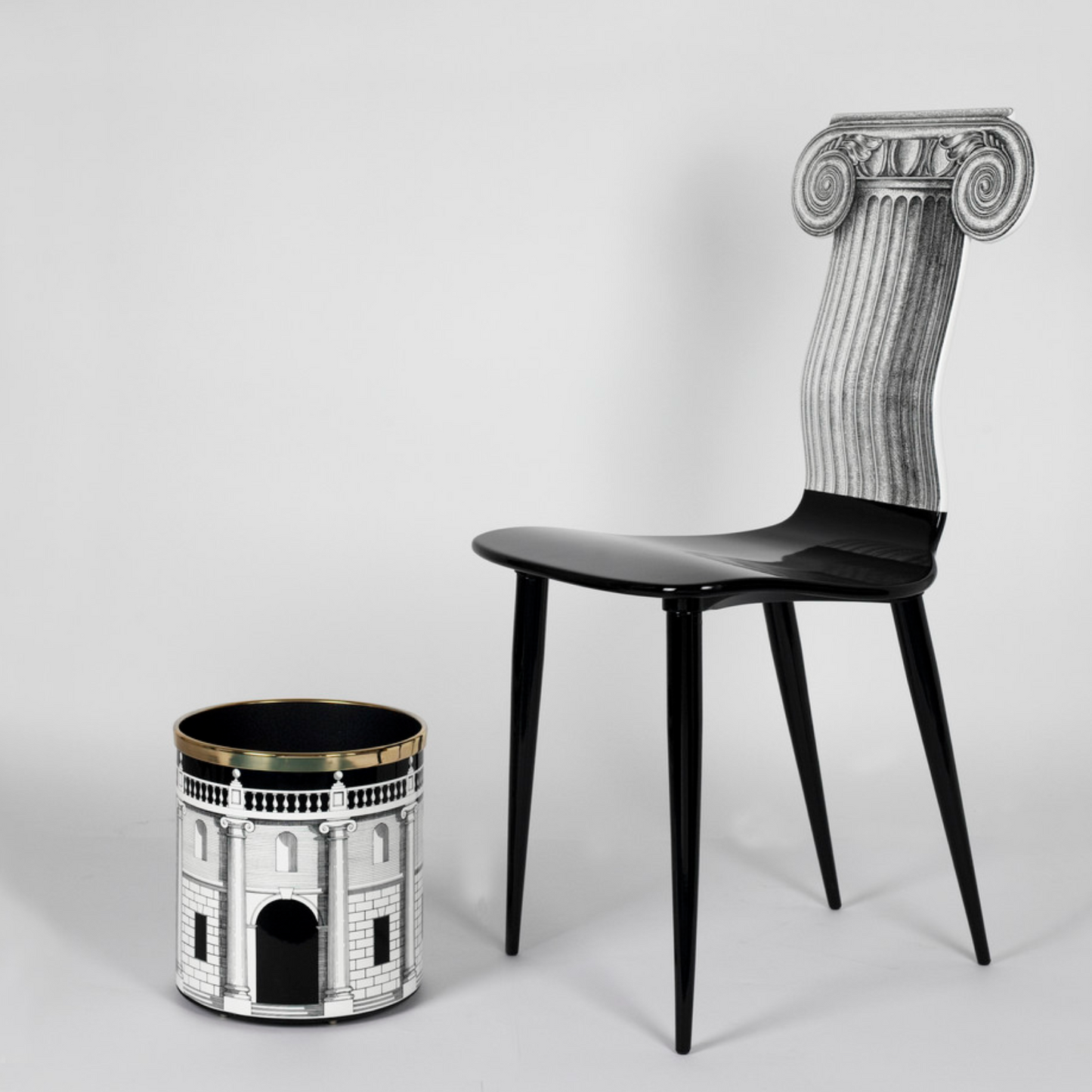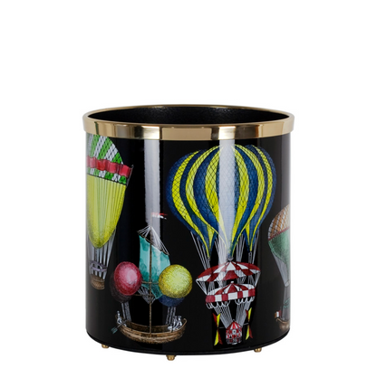 The taste for repetition along with the decorations chasing one another across the curved surface give an up-to-date and surprising charm to this hand-painted, lacquered, and silkscreened metal paper holder, with a brass upper edge and equipped with feet. Its eclectic shape allows it to be transformed into a container, vase holder, or simple accessory. For cleaning, we recommend a damp cloth without any soaps or solvents.