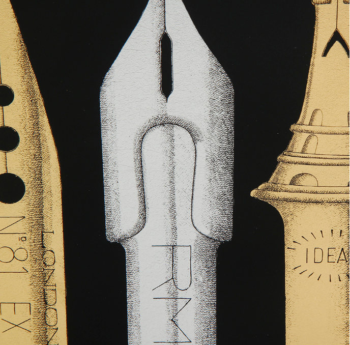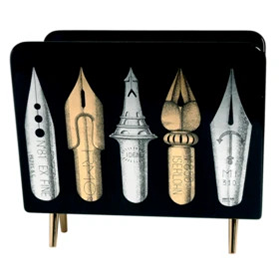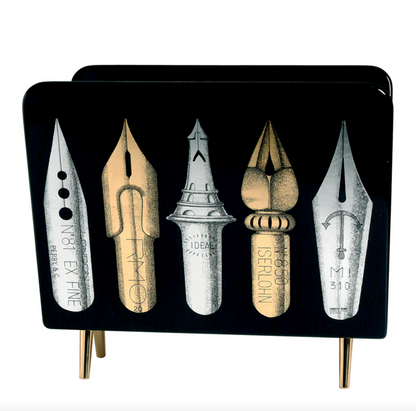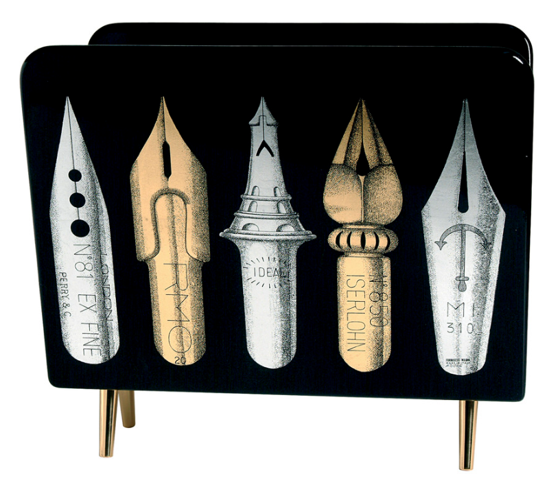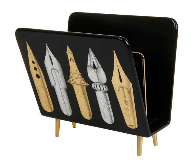 - The Atelier's imagination transforms even everyday objects into creations of art. This is the case with this hand-painted and decorated metal magazine rack with gold accents, in which a series of nibs allude to Fornasetti's typical graphic style.