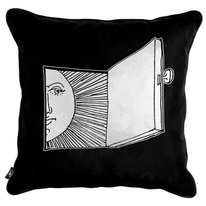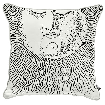 The Solitario collection was born from a group of unpublished Fornasetti drawings depicting minimalist, humanized versions of the sun: one of those decorations adorns this cushion with a removable silk cover.
