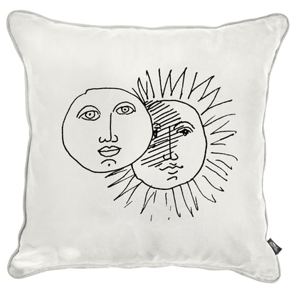 The Solitario collection was born from a group of unpublished Fornasetti drawings depicting minimalist, humanized versions of the sun: one of those decorations adorns this cushion with a removable silk cover.