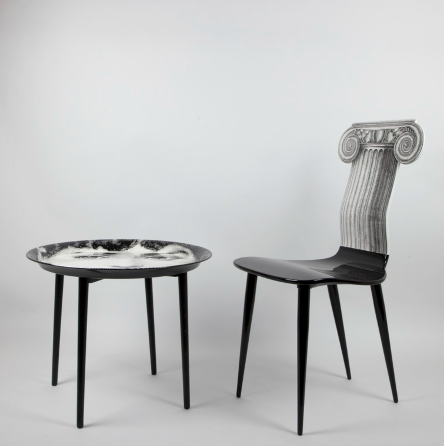 • The circular shape and flat surface give great prominence to the Atelier decorations. This hand-silkscreened, painted, and lacquered tray features the famous Lux Gstaad decoration standing out against the black background in all its irony. Combined with a foldable stand, the tray can be transformed into a coffee table.