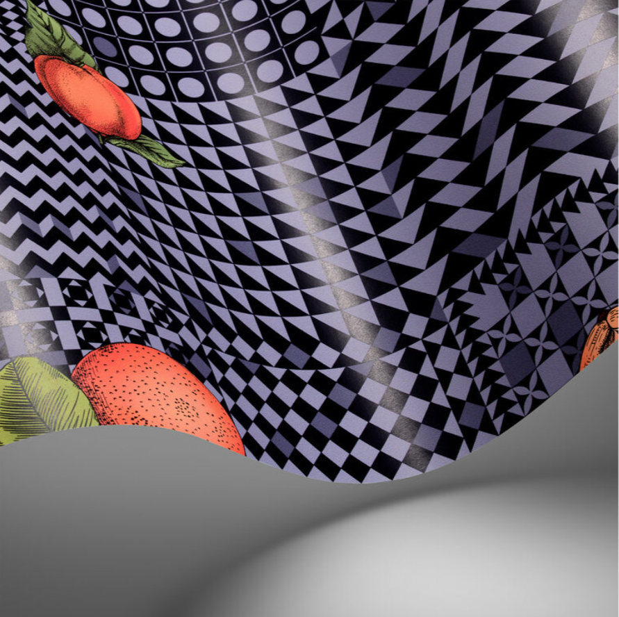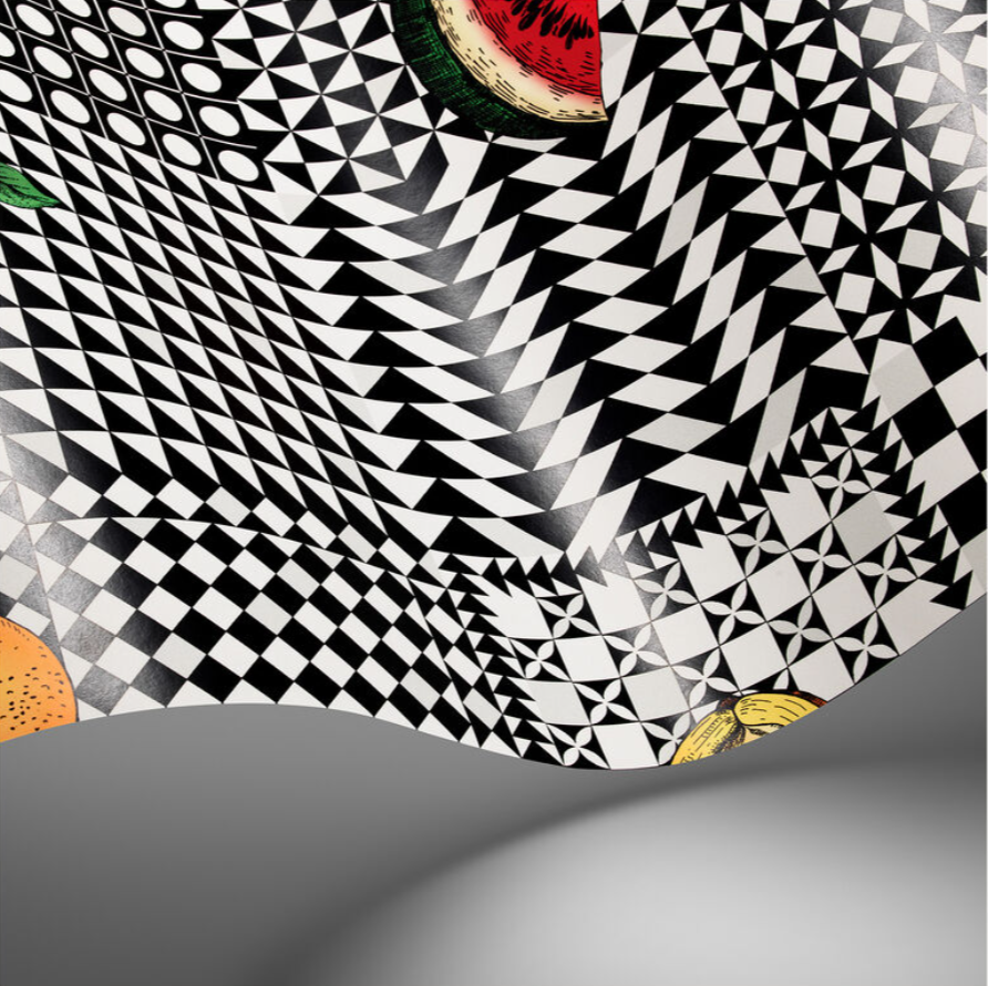 The trompe l’oeil effect enhances the contrast between the rigorous geometry of the base and the organic shapes of different fruits found in nature.