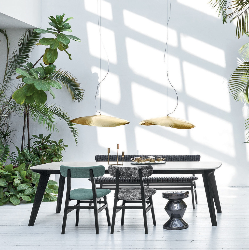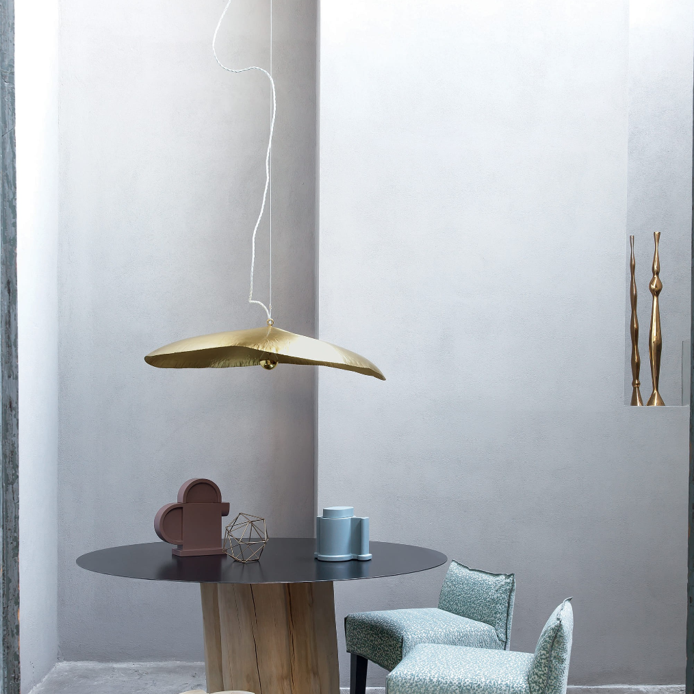 With a strong decorative impact, the Brass collection combines the ductility of brass with its ability to embellish any interior thanks to its luminous reflections. The pendant lamps have a light shape of great visual appeal: a light brass disk that floats in the air reflecting the light in a poetic and suggestive way. The collection is also completed by a series of small tables and coffee tables with a sculptural image and with the top in a brass or aluminium version, for warm and golden or cold and silver reflections. The Brass collection strongly connotes any environment underlining the eclectic spirit of the brand.