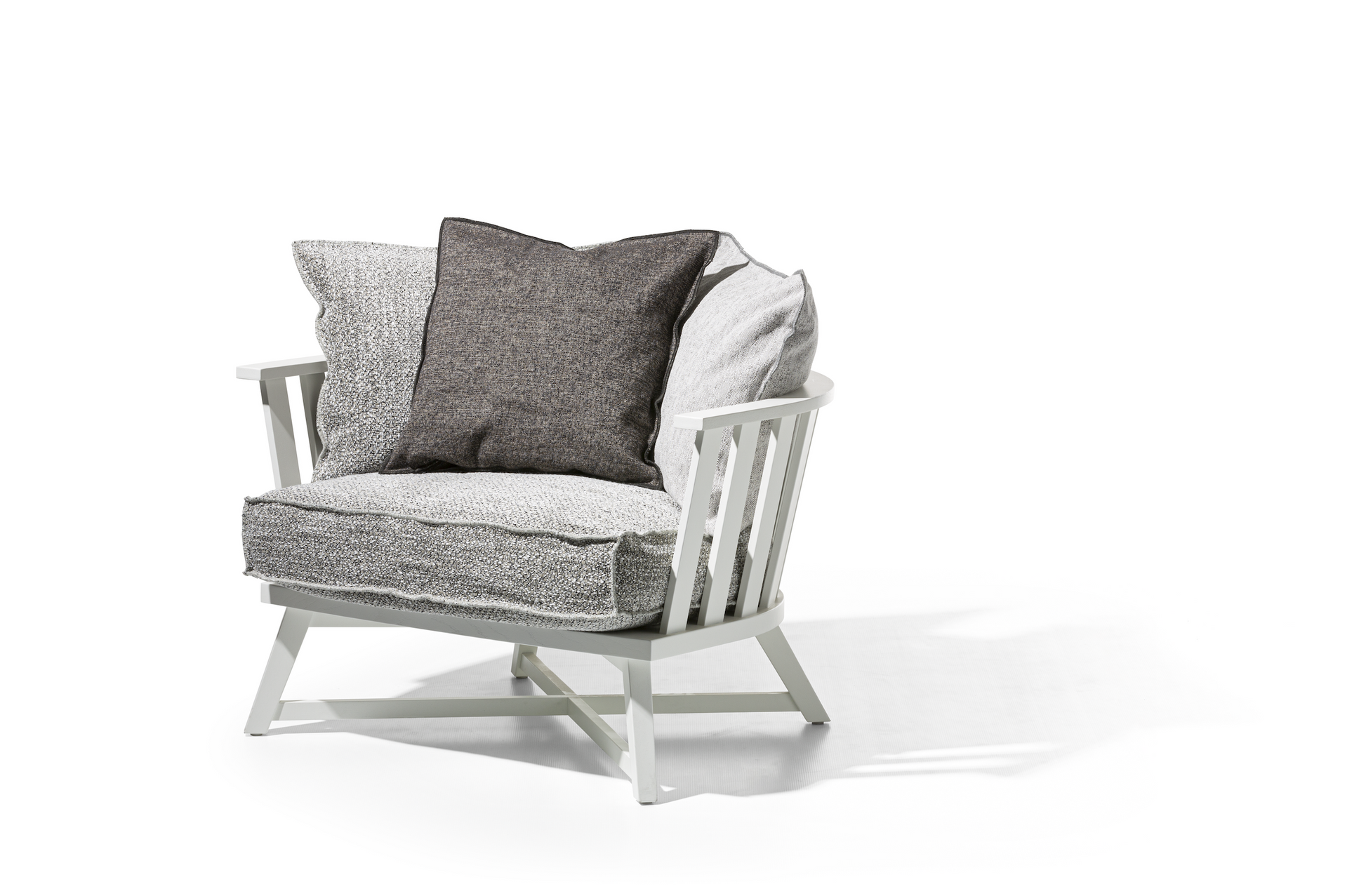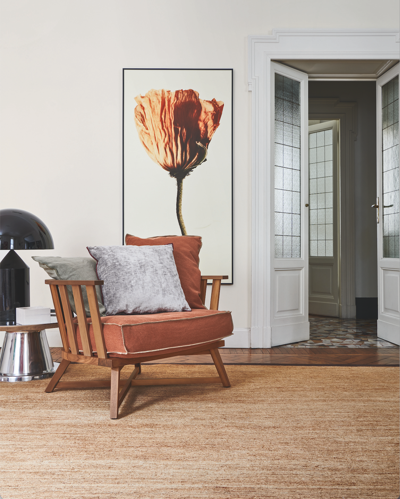 Gray 07 is a wooden armchair whose distinctive sign is an enveloping low backrest in the shape of a semicircle made with slats. The solid wood legs intersect, forming a cross. The structure is made of natural painted Canaletto walnut, bleached oak or white, grey, black, ocean, dove-grey, blueberry, date, ginger lacquered oak. For greater comfort, a set of loose cushions accentuates its softness.