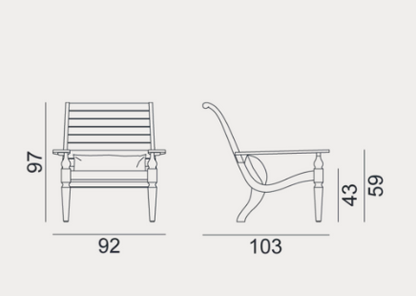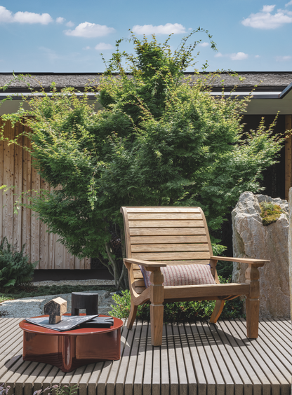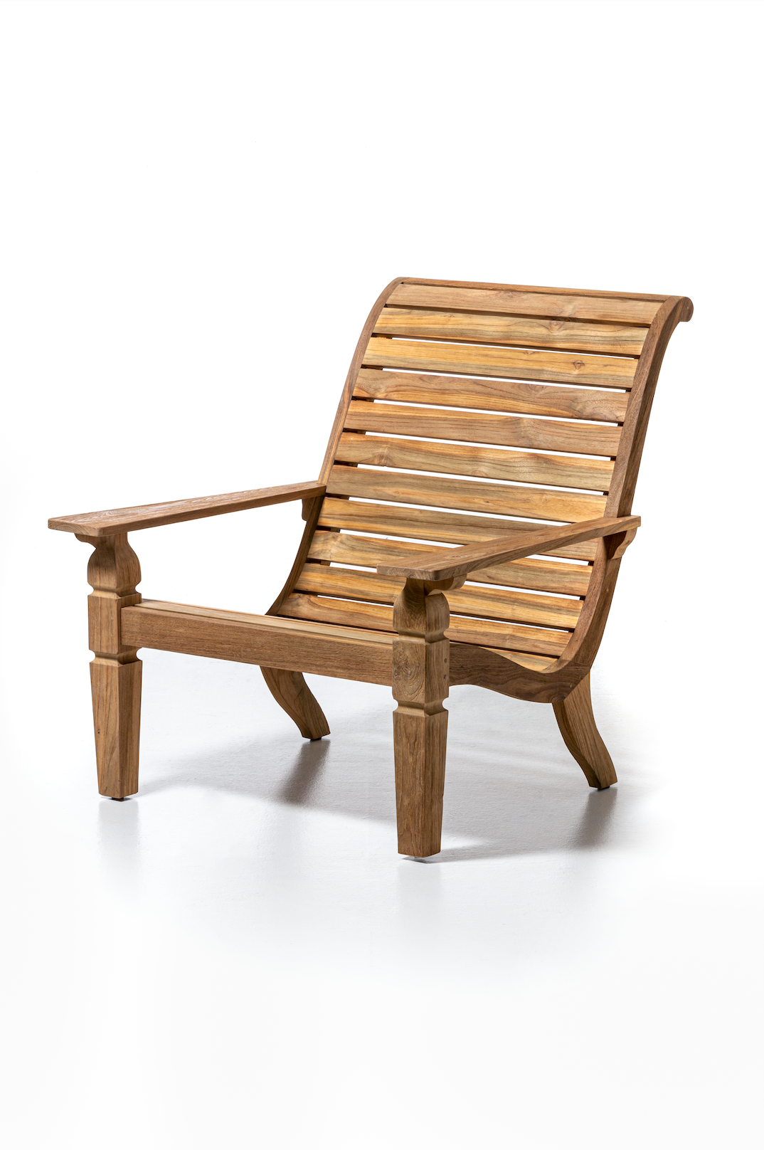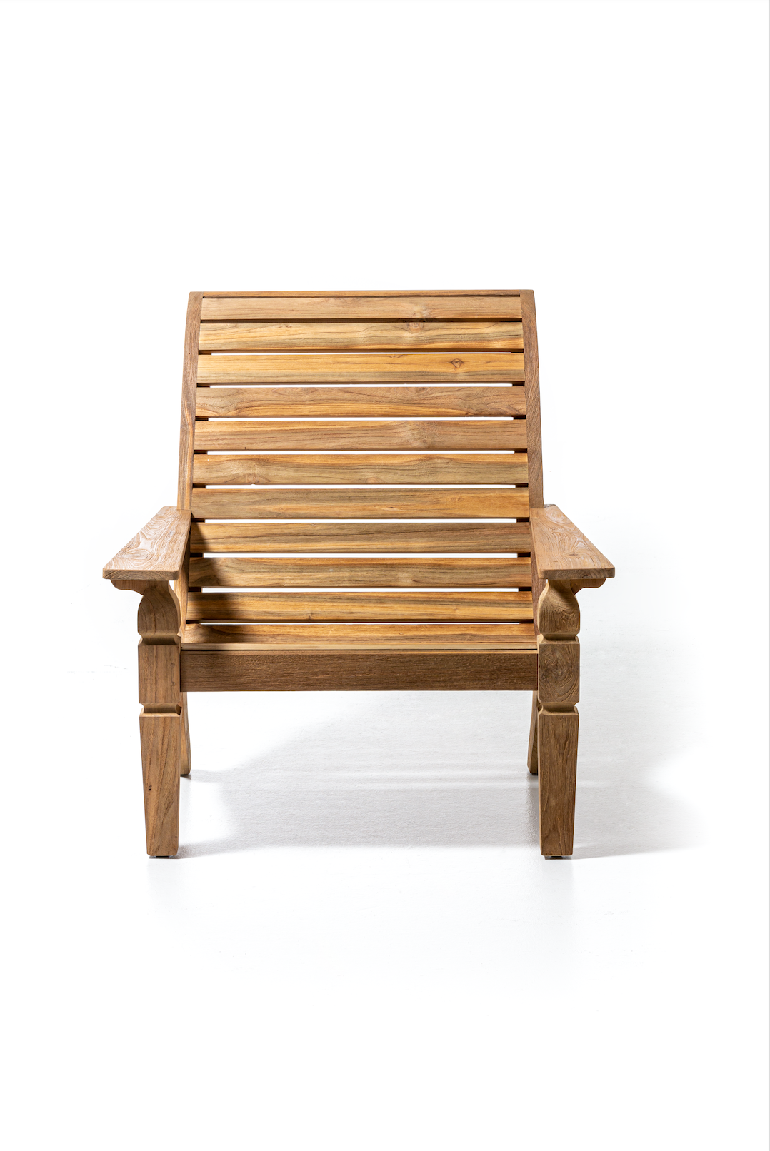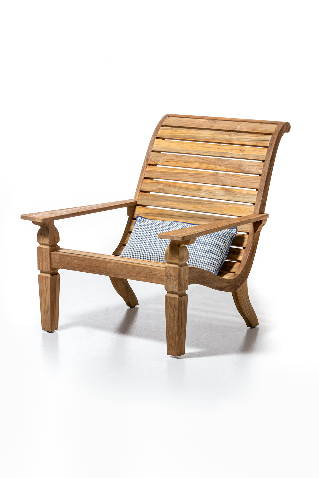 Armchair in colonial style of exotic inspiration, Jeko 26 has a structure made of ECOTeak, a material coming from the reuse of recovered beams and teak elements that have been repaired with recycled wood, assembled and polished to highlight the original veins. Lumbar cushion 60x30 cm with removable cover.
