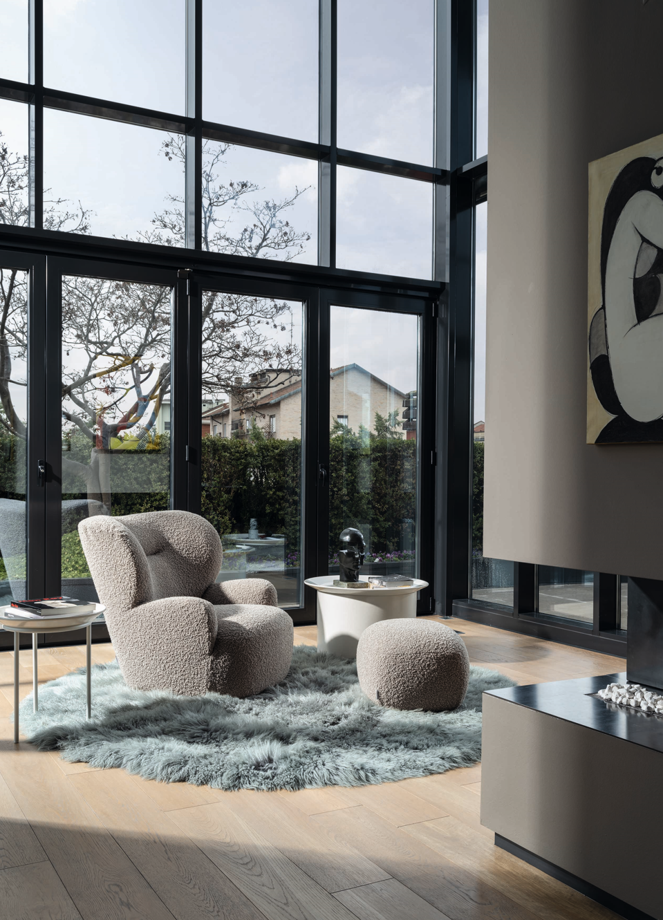 The beauty of simplicity and comfort take shape in the Loll collection. Composed of cosy and comfortable sofas and armchairs, Loll speaks of contemporary comfort, combined with attention to detail, the quality of the materials and the uniqueness of the craftsmanship. The profile of the sofas is underlined by the characteristic sew/cut which, like a light line drawn by hand, follows the essential geometries and soft lines of the collection. To make them extremely comfortable and enveloping like a nest, the padded parts were made using a soft layer of channelled goose down, with the recovery of the traditional technique of using pocket springs in the seat cushions.