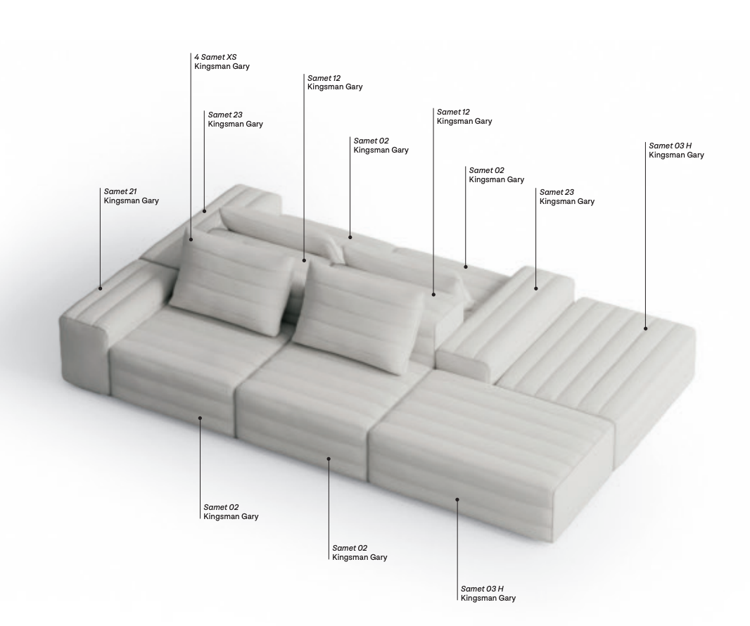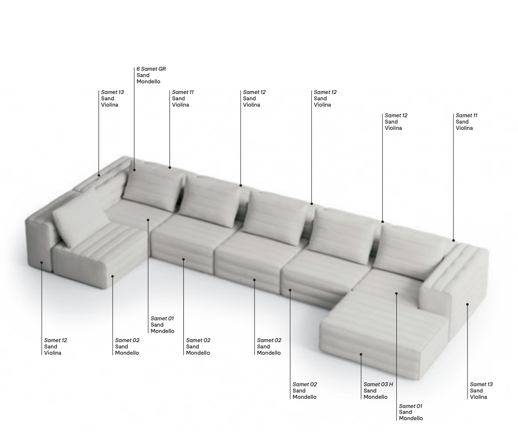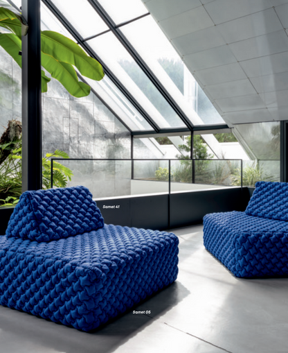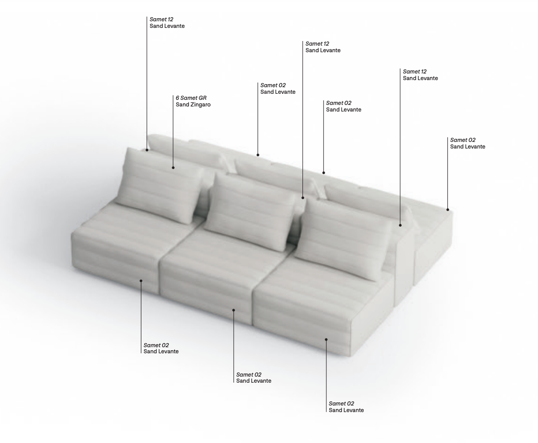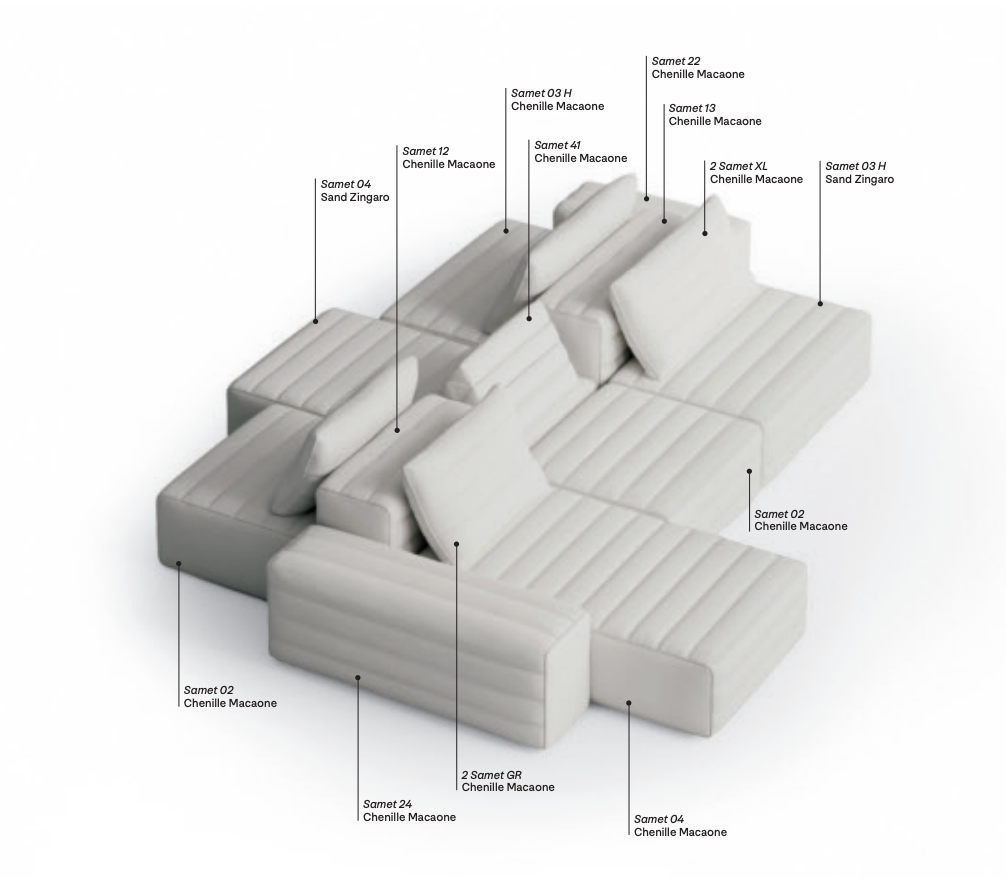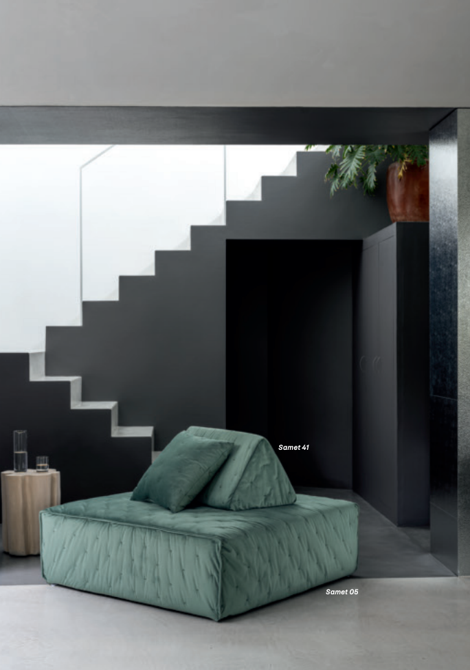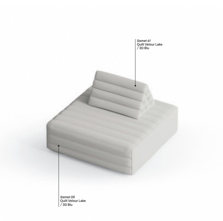 Samet is a modular sofa without rules, a multifunctional and configurable product that places the person as an active subject in the composition of their own space, encouraging them to experiment with new forms of use. Available in two variants, a classic high version and a floor-standing version that is even closer to the Thai imagery from which the design was inspired, it is presented in two compositions designed to create true islands of relaxation, one more articulated defined by overlapping shapes, the other instead more linear. Cosy and hospitable seats are juxtaposed with each other in regular and soft geometries, a dynamic design to create multiple types of more or less informal seating. Details, stitching and matelassé enrich a simple modularity that creates infinite compositions with a timeless aesthetic, from the most classic sofa to the most multifaceted, from the tidiest to the most disjointed.