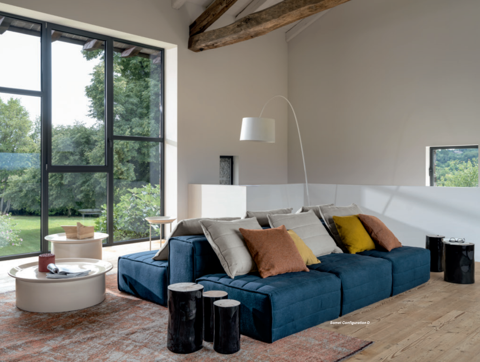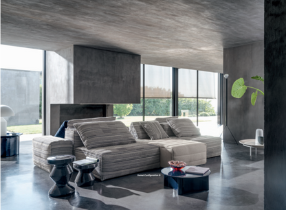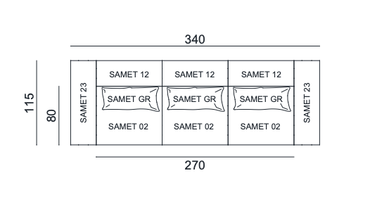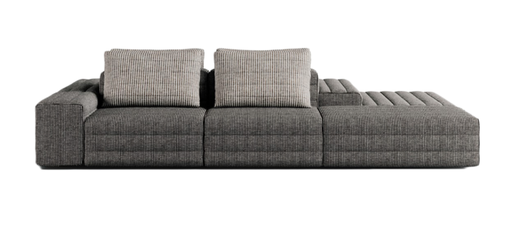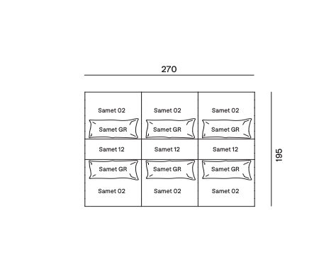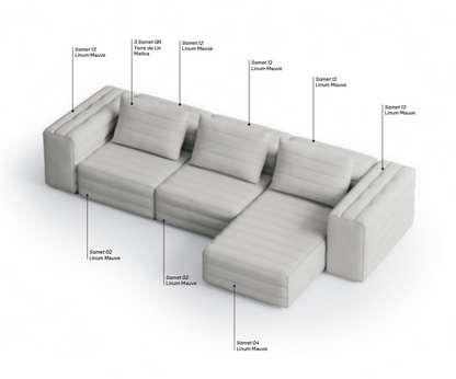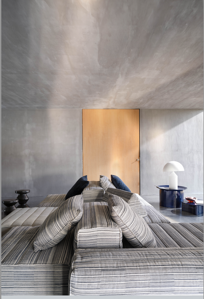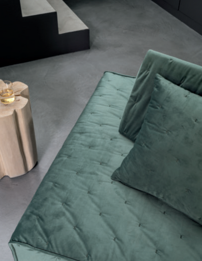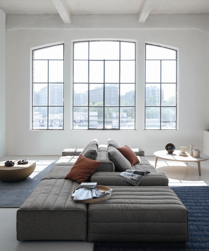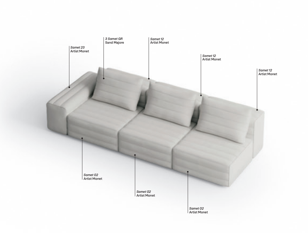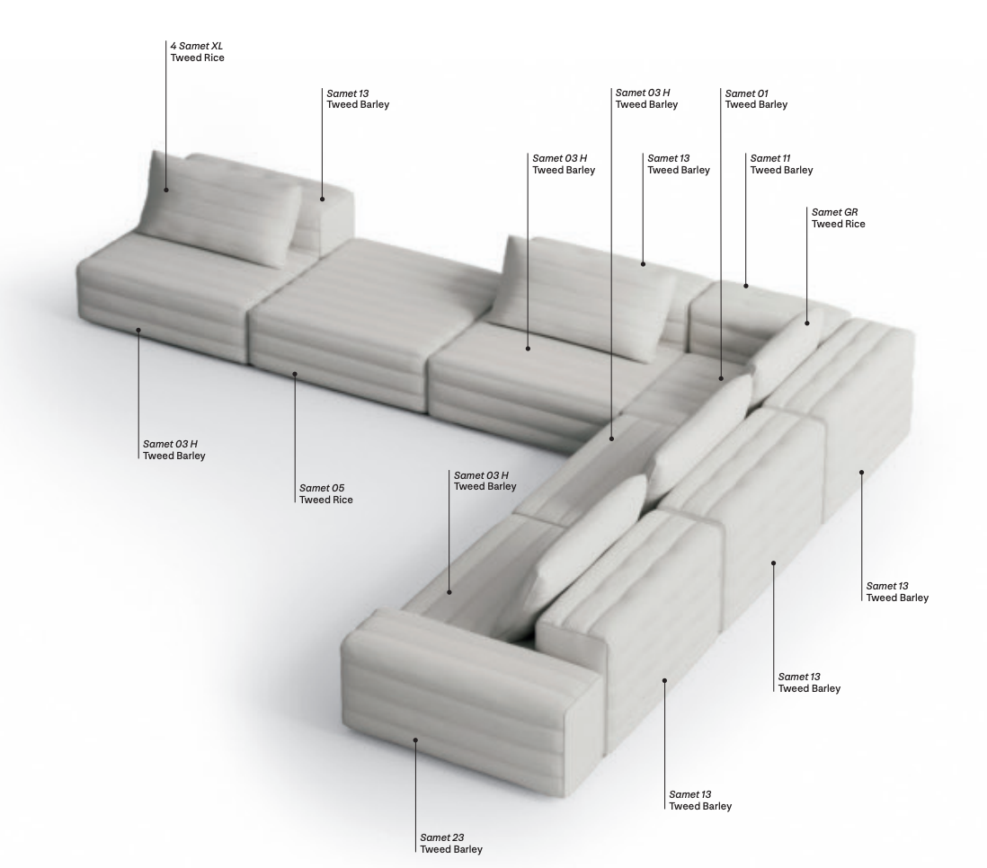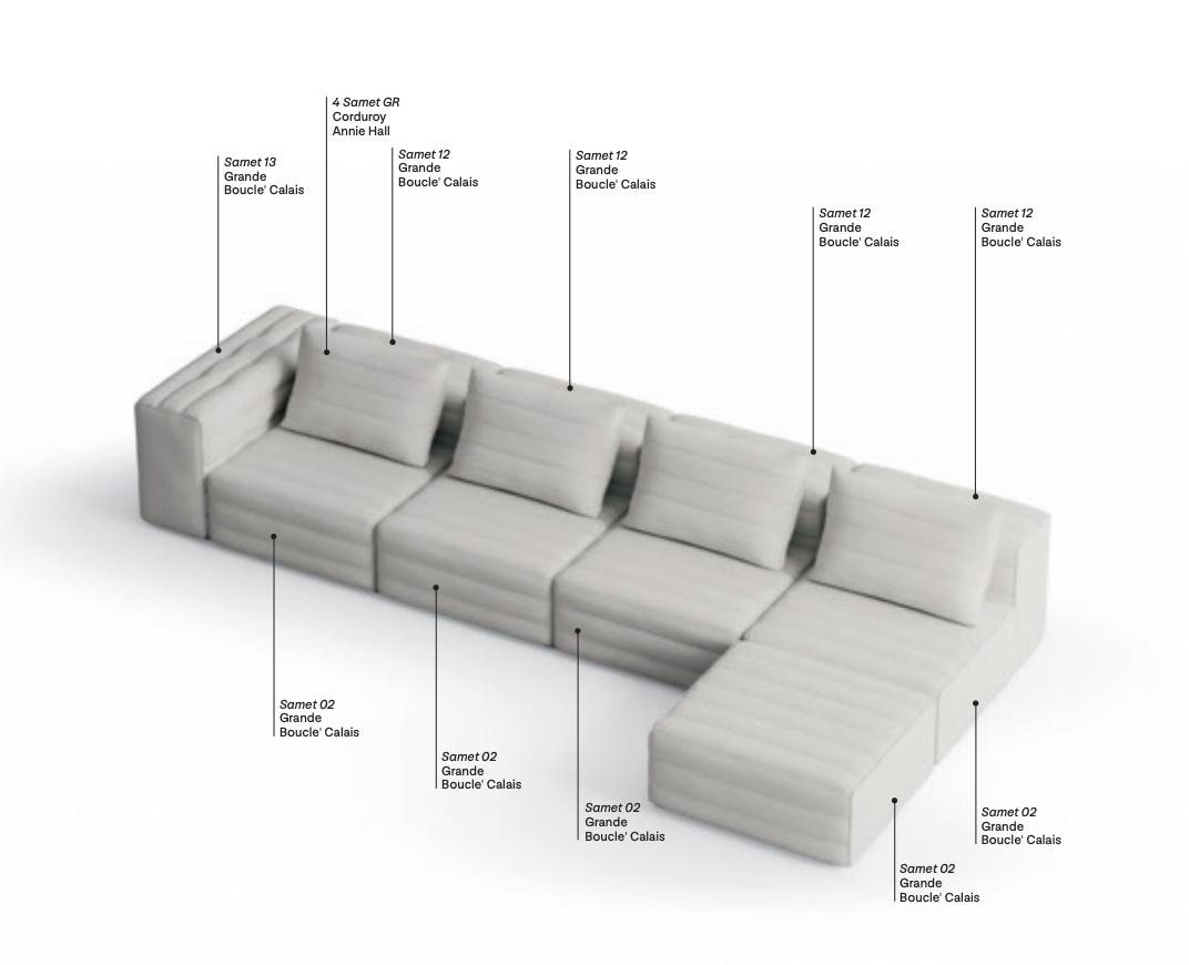 Samet is a modular sofa without rules, a multifunctional and configurable product that places the person as an active subject in the composition of their own space, encouraging them to experiment with new forms of use. Available in two variants, a classic high version and a floor-standing version that is even closer to the Thai imagery from which the design was inspired, it is presented in two compositions designed to create true islands of relaxation, one more articulated defined by overlapping shapes, the other instead more linear. Cosy and hospitable seats are juxtaposed with each other in regular and soft geometries, a dynamic design to create multiple types of more or less informal seating. Details, stitching and matelassé enrich a simple modularity that creates infinite compositions with a timeless aesthetic, from the most classic sofa to the most multifaceted, from the tidiest to the most disjointed.