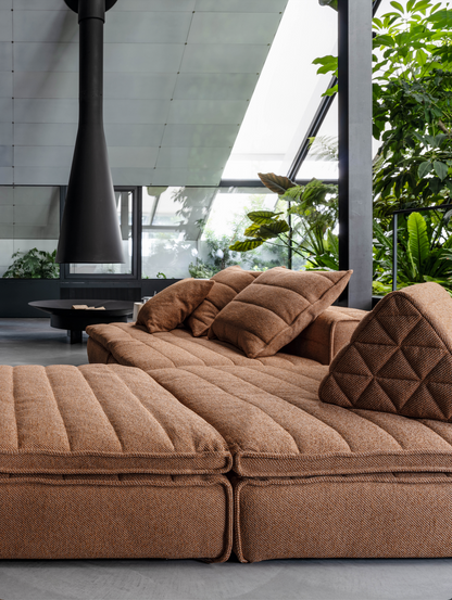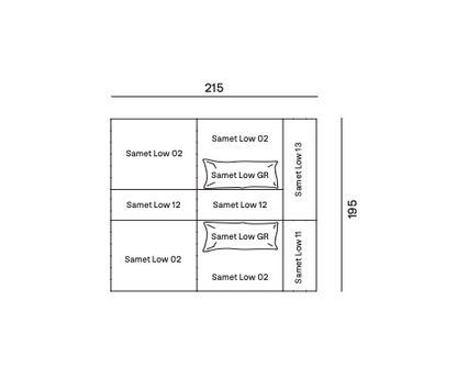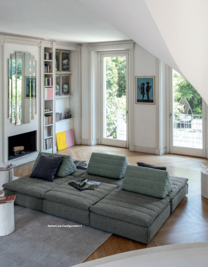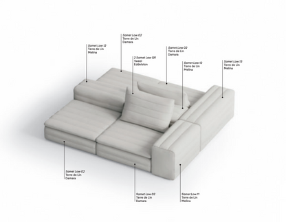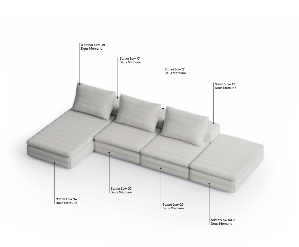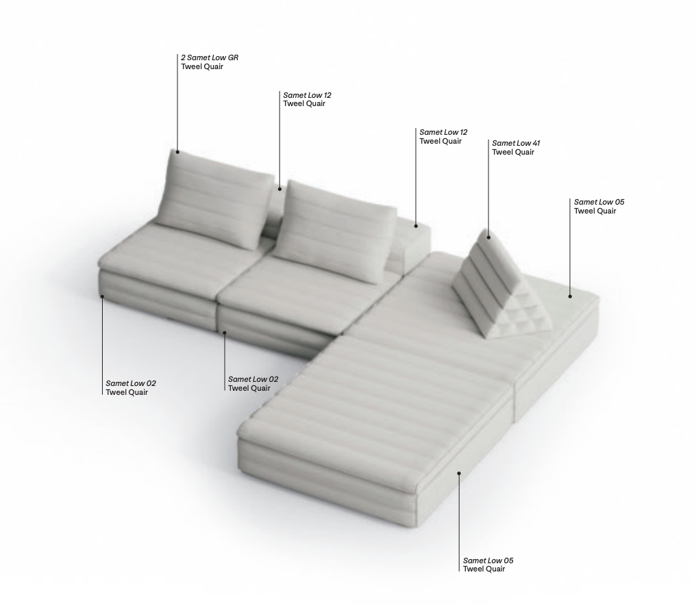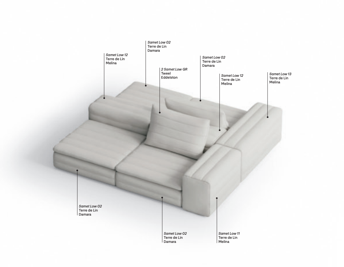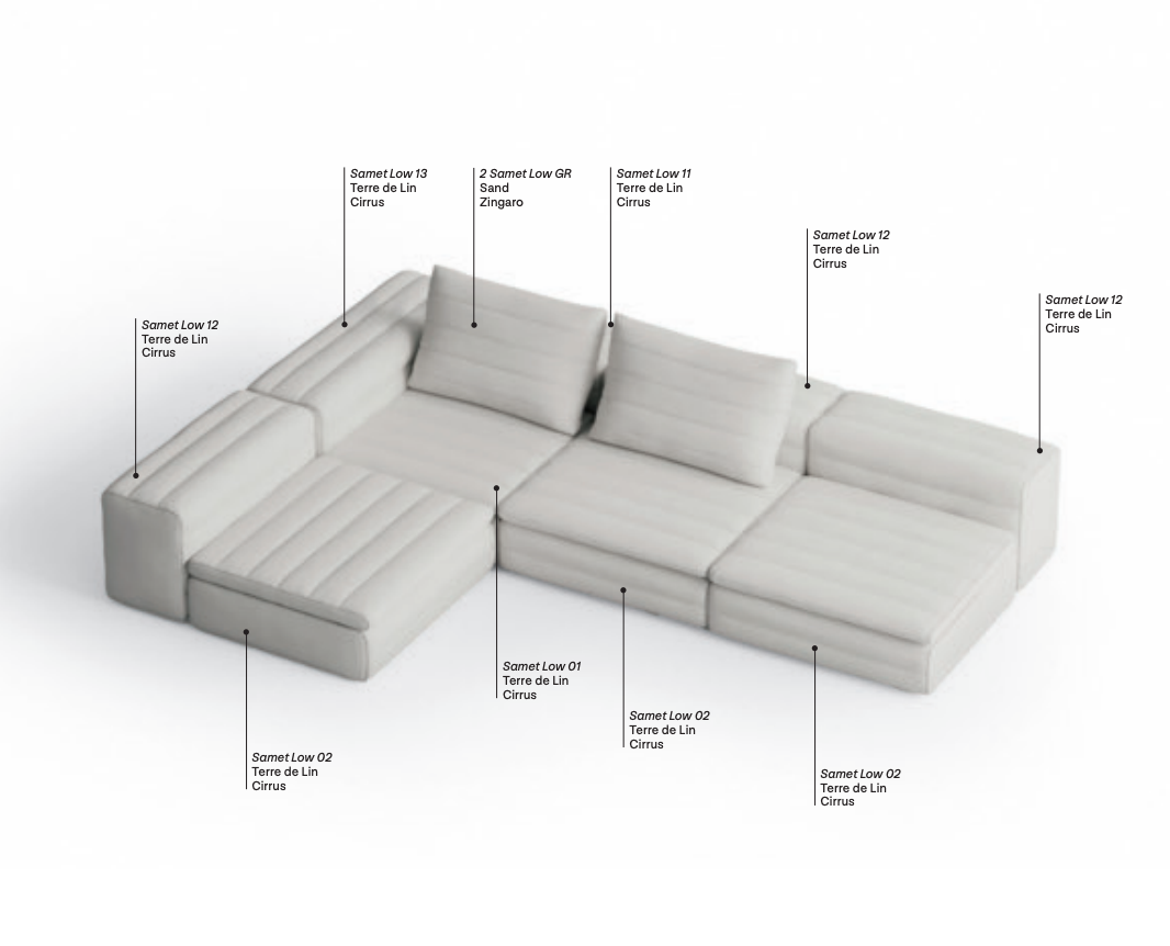 Samet is a modular sofa without rules, a multifunctional and configurable product that places the person as an active subject in the composition of their own space, encouraging them to experiment with new forms of use. Available in two variants, a classic high version and a floor-standing version that is even closer to the Thai imagery from which the design was inspired, it is presented in two compositions designed to create true islands of relaxation, one more articulated defined by overlapping shapes, the other instead more linear. Cosy and hospitable seats are juxtaposed with each other in regular and soft geometries, a dynamic design to create multiple types of more or less informal seating. Details, stitching and matelassé enrich a simple modularity that creates infinite compositions with a timeless aesthetic, from the most classic sofa to the most multifaceted, from the tidiest to the most disjointed.