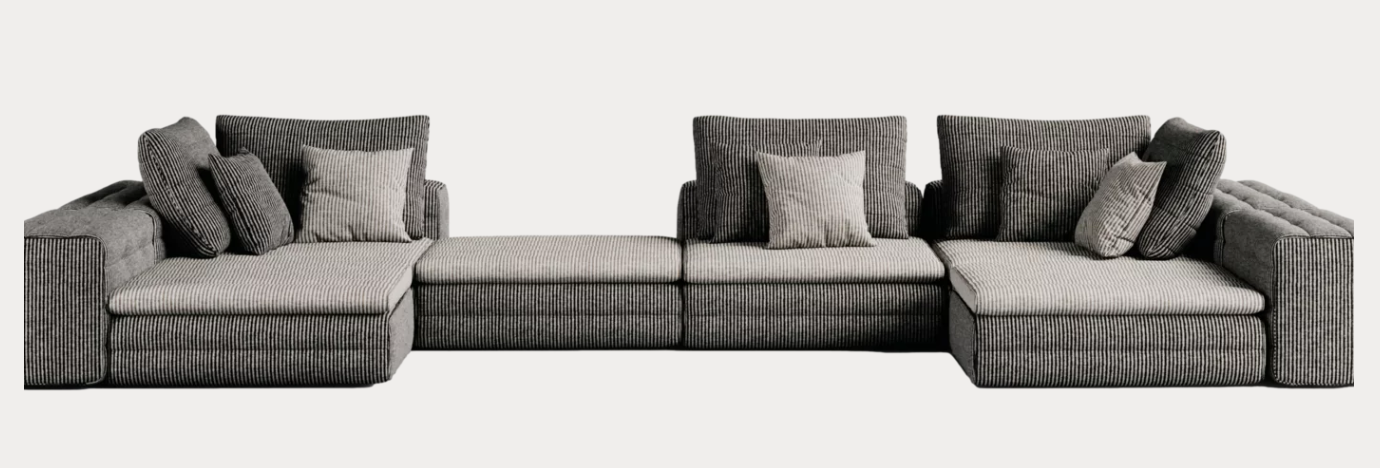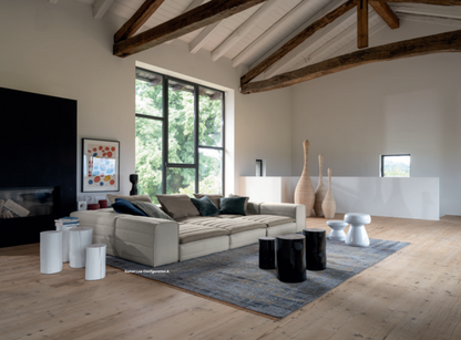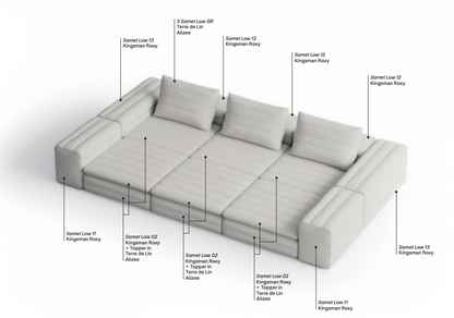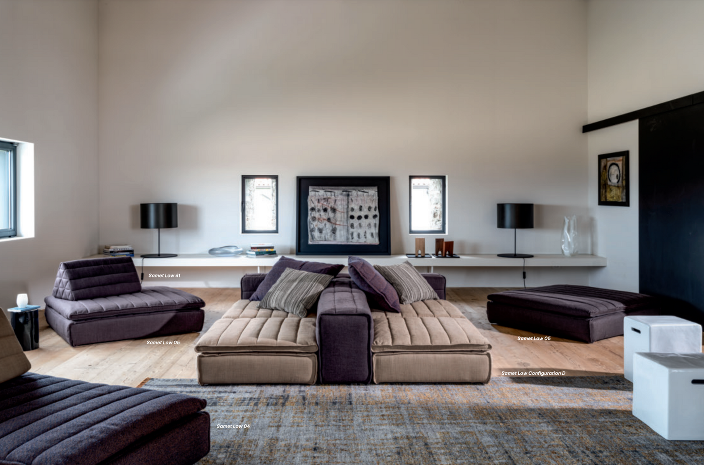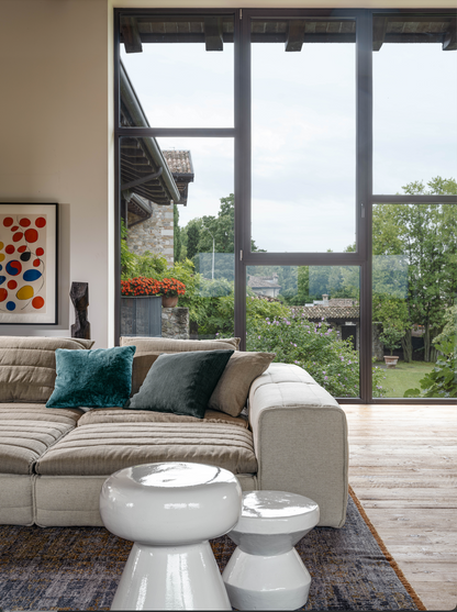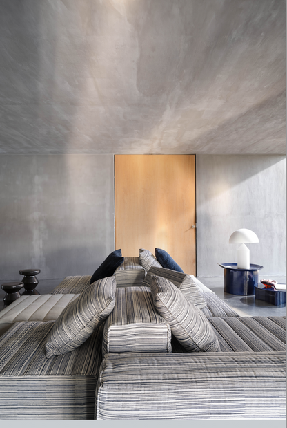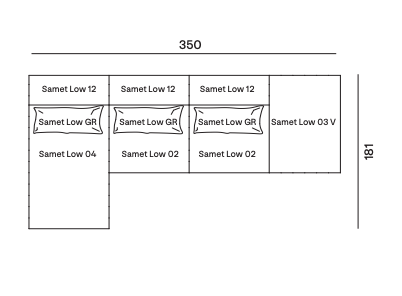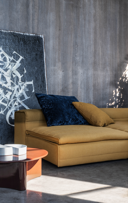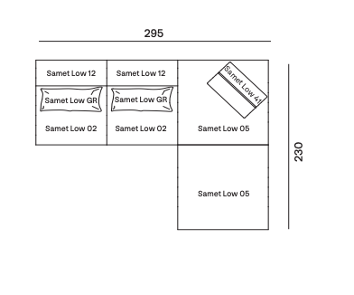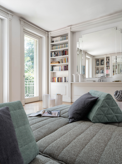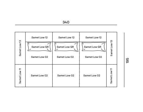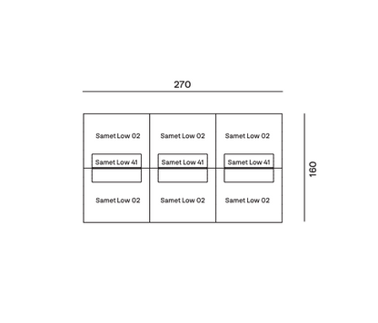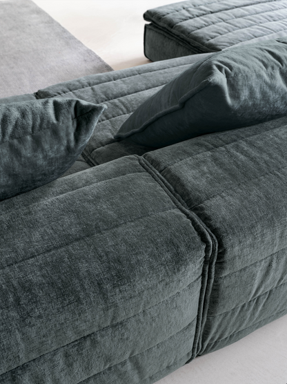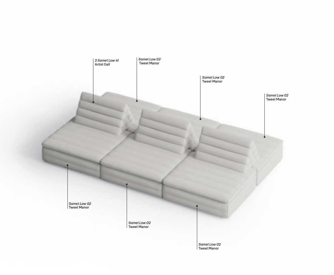 Samet is a modular sofa without rules, a multifunctional and configurable product that places the person as an active subject in the composition of their own space, encouraging them to experiment with new forms of use. Available in two variants, a classic high version and a floor-standing version that is even closer to the Thai imagery from which the design was inspired, it is presented in two compositions designed to create true islands of relaxation, one more articulated defined by overlapping shapes, the other instead more linear. Cosy and hospitable seats are juxtaposed with each other in regular and soft geometries, a dynamic design to create multiple types of more or less informal seating. Details, stitching and matelassé enrich a simple modularity that creates infinite compositions with a timeless aesthetic, from the most classic sofa to the most multifaceted, from the tidiest to the most disjointed.