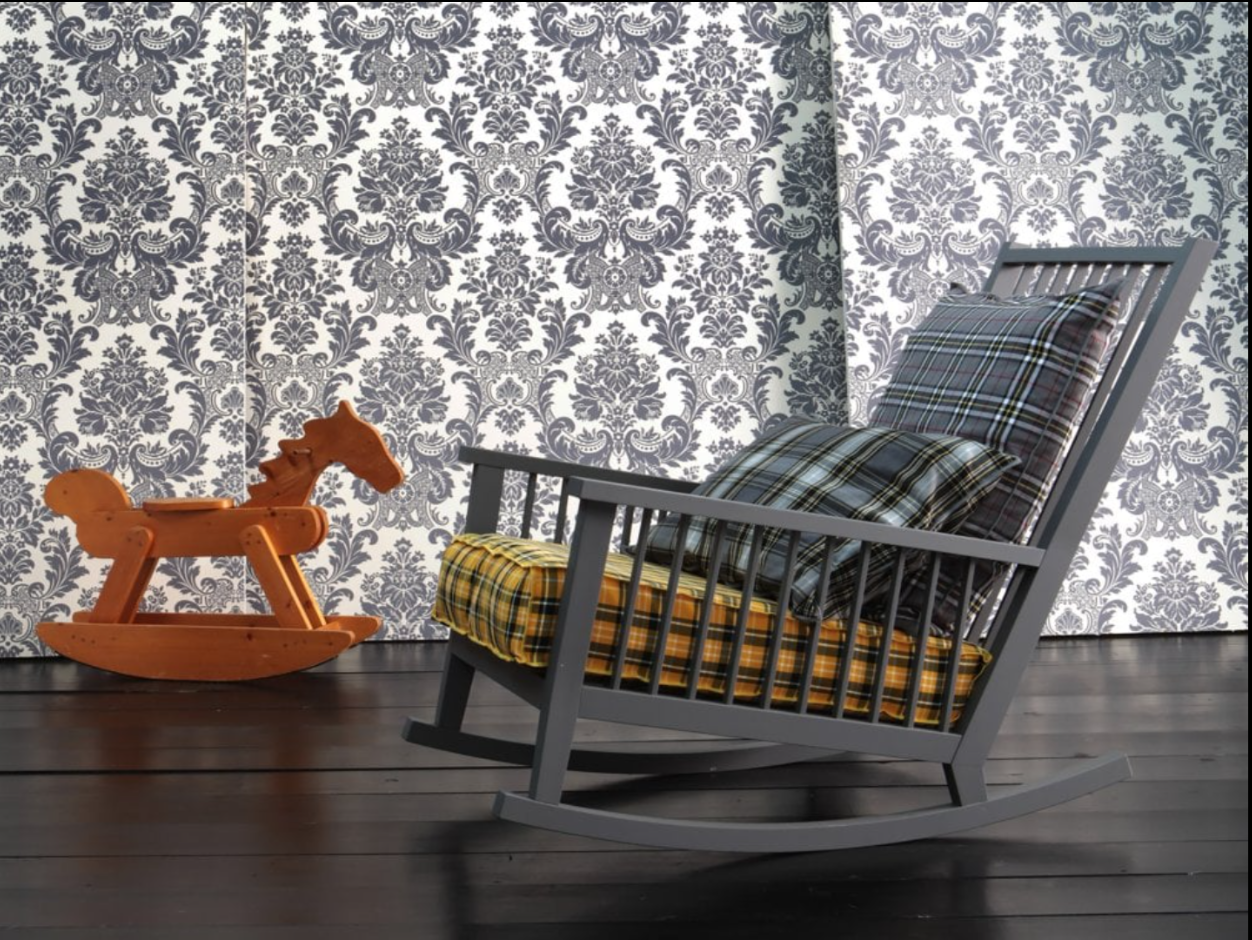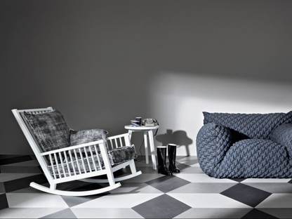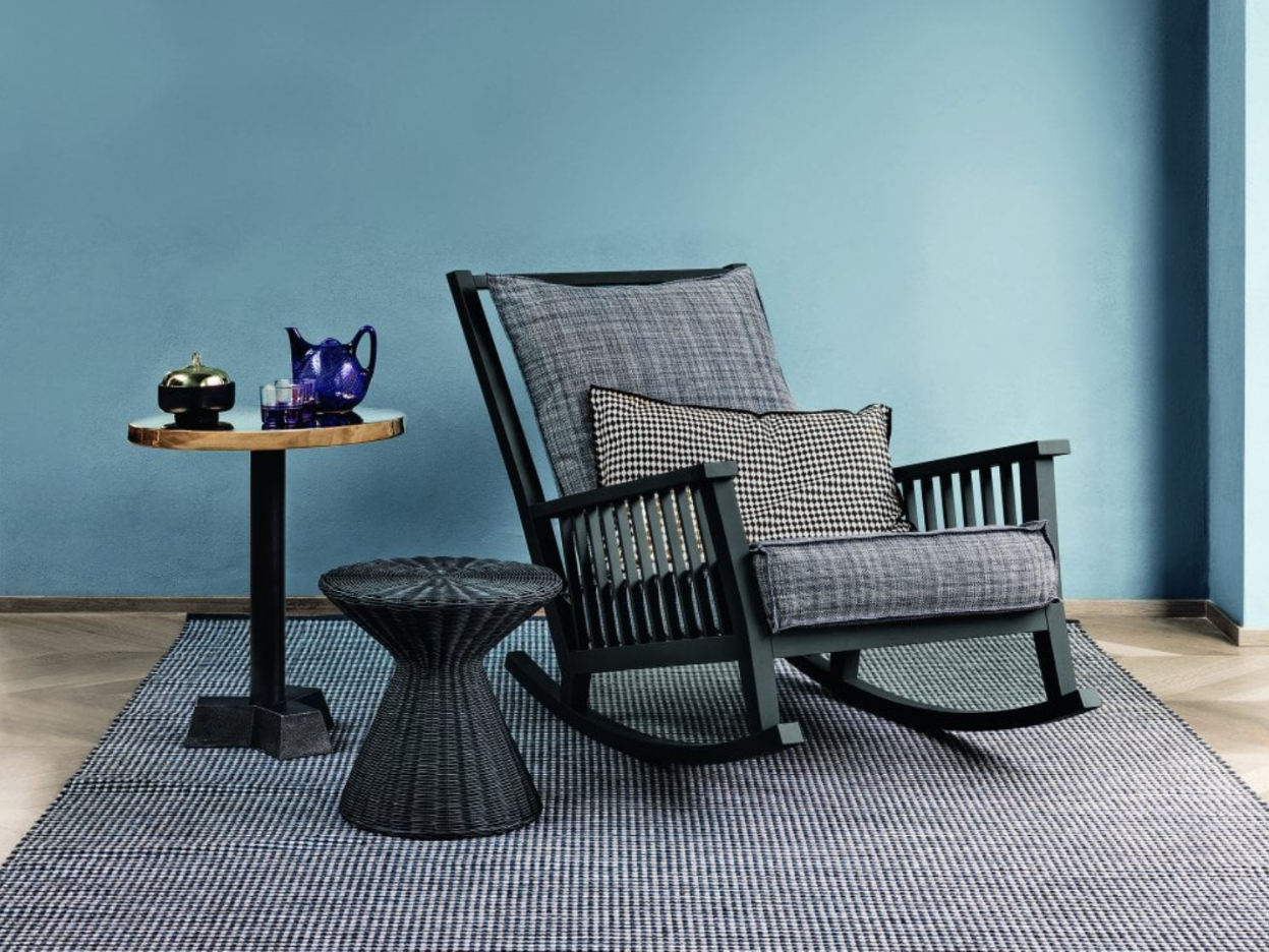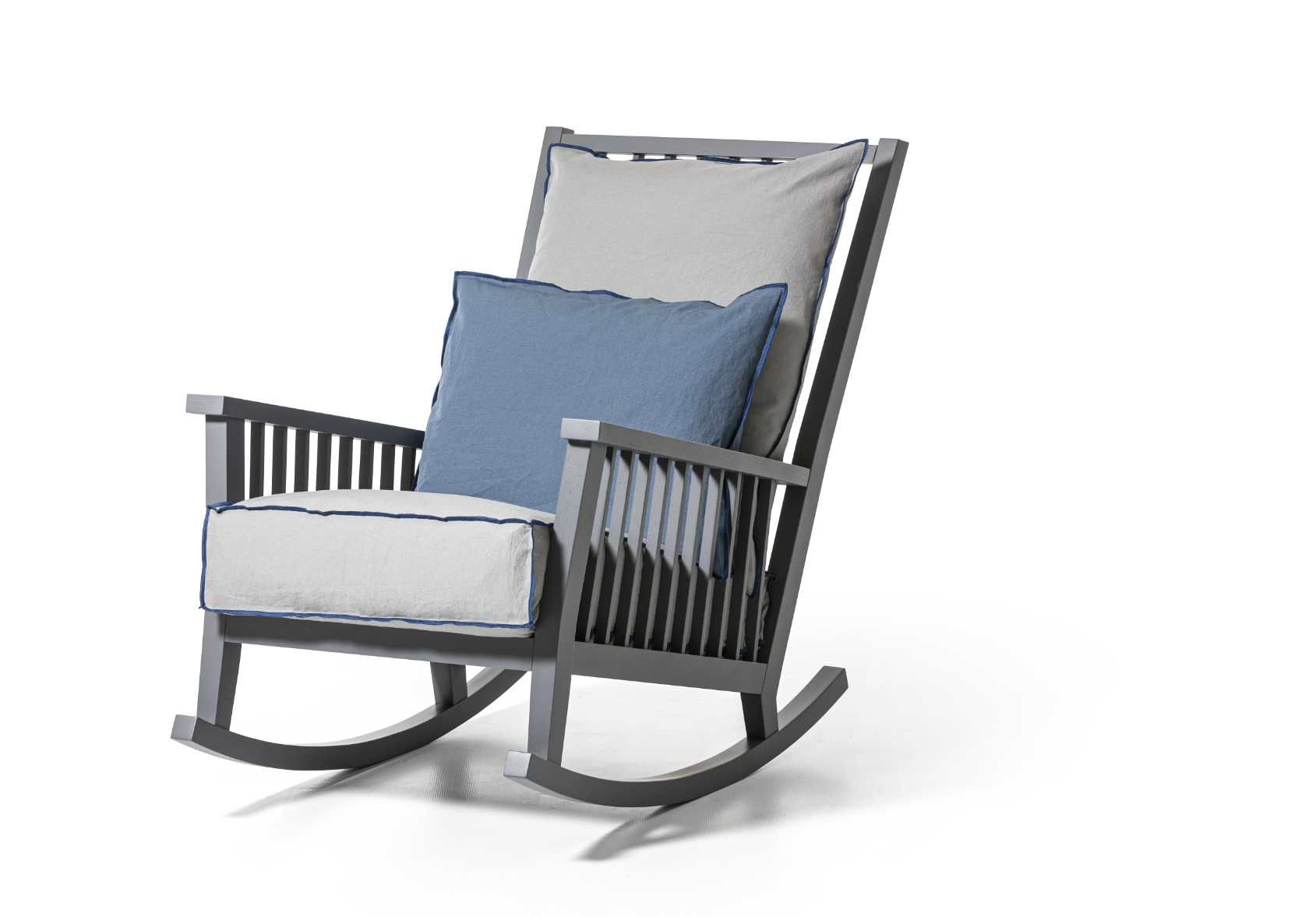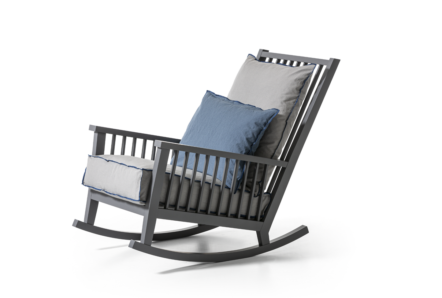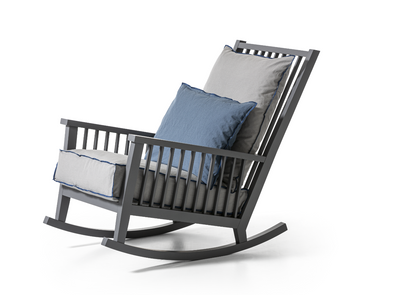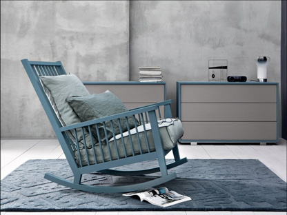 Rocking chair in wood, Gray 09 is characterised by a high backrest with visible slats on which a soft loose cushion rests. The structure, with a large and welcoming seat, is made of natural painted Canaletto walnut, bleached oak or White, Grey, Black, Ocean, Dove-grey, Blueberry, Date, Ginger lacquered oak.