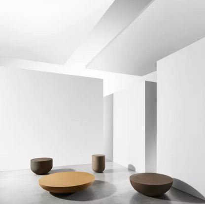 From the Japanese equilibrium, stability, Heiko calls to mind the shape of the tables, defined by curved lines, with a rounded base which seems to float on the surfaces. Simple geometries and full volumes are combined and superimposed, giving life to soft architectures in which every element coexists with the others. Four dimensions and three natural colours which remind us of the materiality of the earth, bringing the mind back to an oriental imagery. The collection is made up of side tables made of high-density polymer and finished with a clay layer. Matt stain-proof treatment. Available in four sizes and three colours: Ombra, Cassel or Siena. -Designer: David Lopez Quincoces. -Dimensions (see image): cm 23 H, diameter cm 120, Kg.56