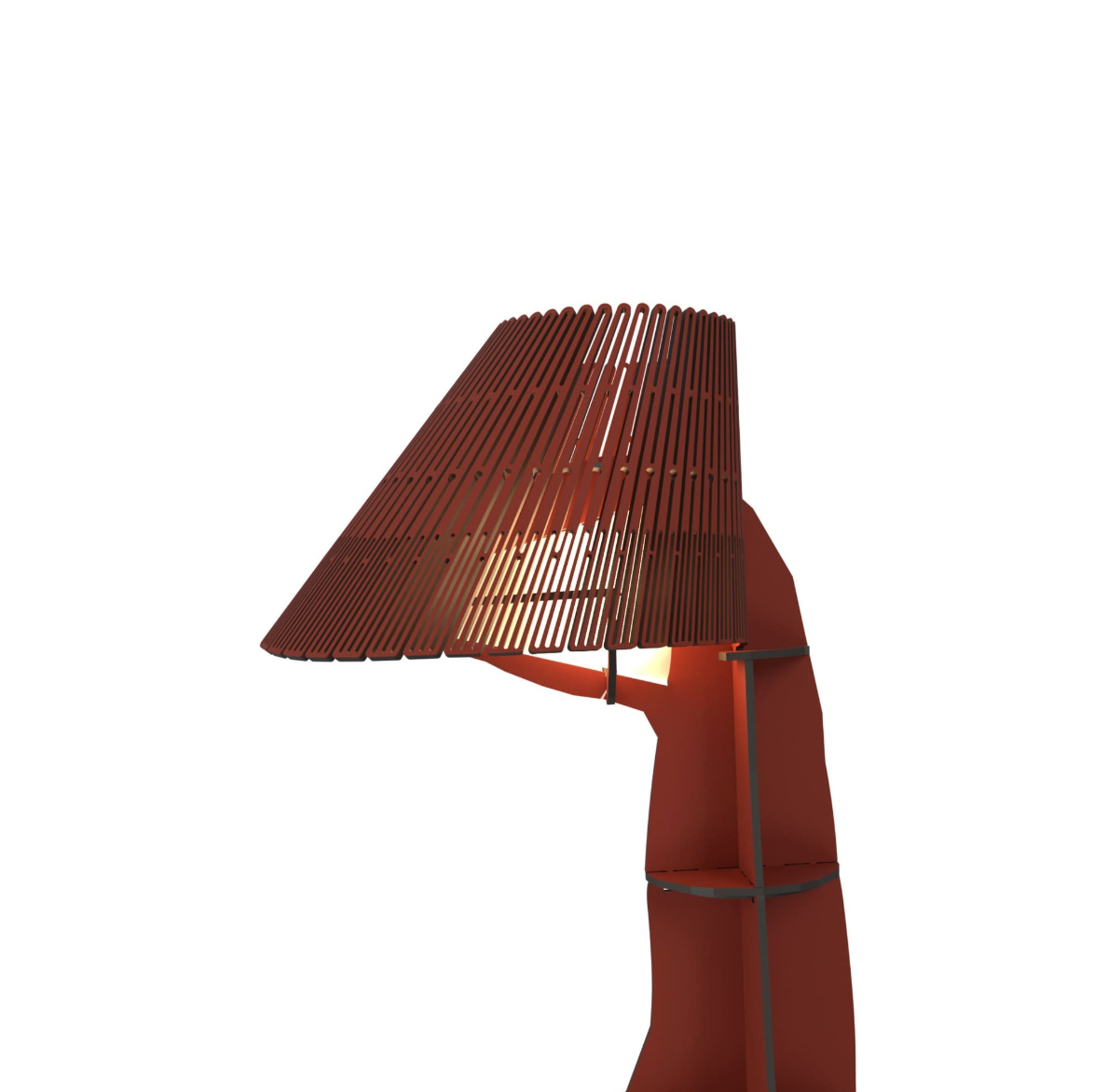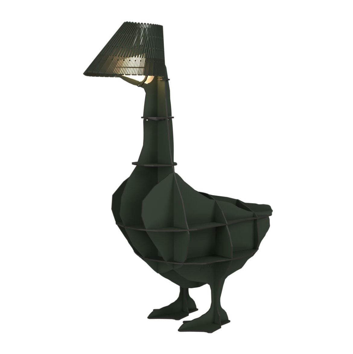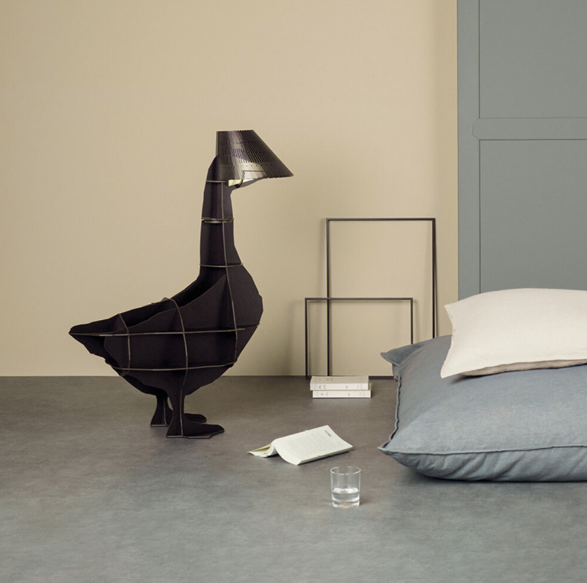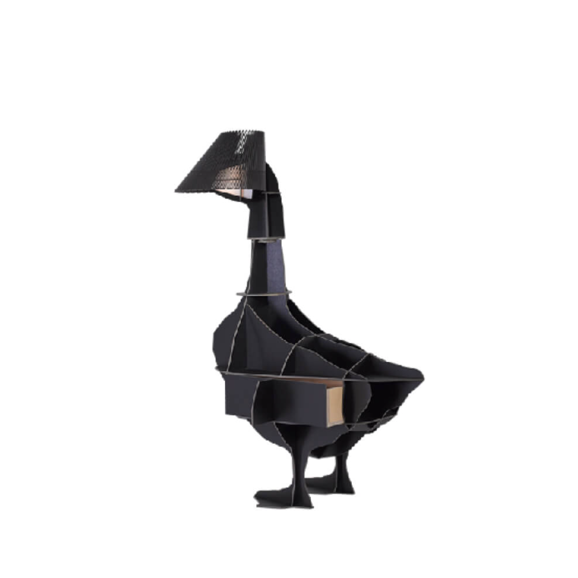 A bedside unit equipped with a USB port for charging mobile phones, the Helping Goose diffuses a poetic atmosphere: topped with a swivel lampshade, it lets subtle rays of light filter through the room through a louver.