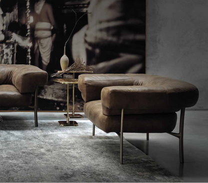 This Armchair refers to the iconic and seductive shapes of the classic Chesterfield, reinterpreted with renewed elegance, and thanks to the gentle curvature of the leg it resolves the connection with the seat and the back. This makes it enveloping and comfortable, its height and width support a relaxed sociability. In the elliptical leg, every millimeter has been designed and calibrated, as well as the relationship between seating and structure. Fittings and lines, grafts and joints, everything is designed for the best harmony. The dialogue between the parties, as in architecture, is for the Milanese architect a perfect orchestration.