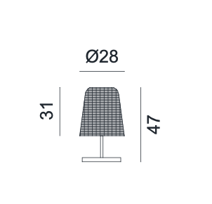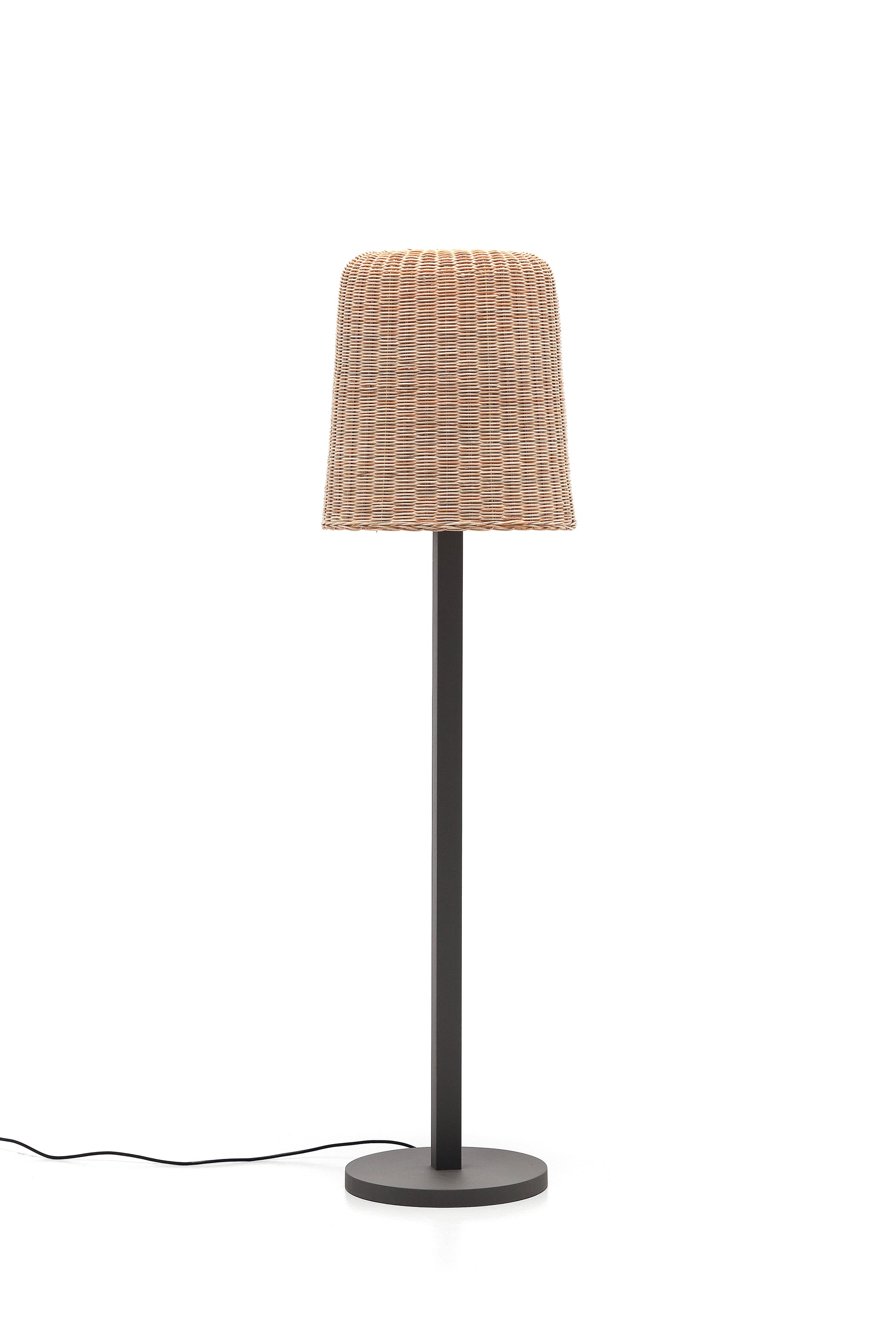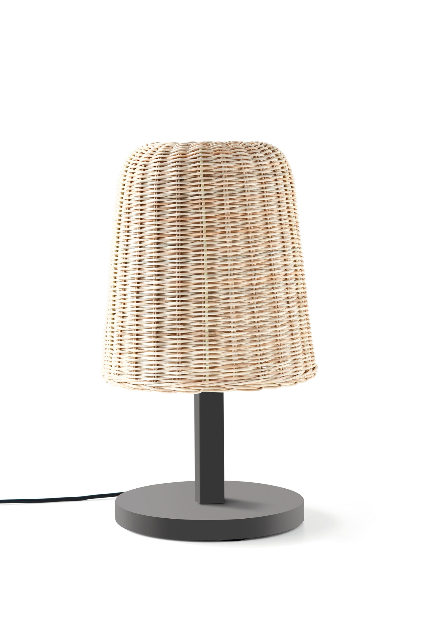 Table lamp in American walnut, available wood finishes: natural lacquer, black, white, grey, ocean, dove-grey, date, blueberry and ginger lacquer; handwoven natural mélange unfinished rattan core shade, max. power 7 W, 220 Volt, bulb holder E 14. Upon request, 110 Volt, US plug. Bulb not included.