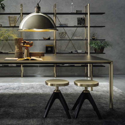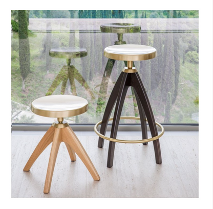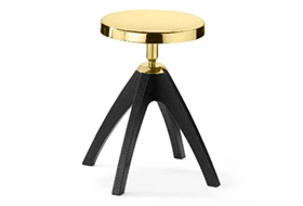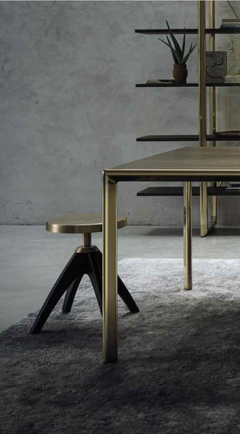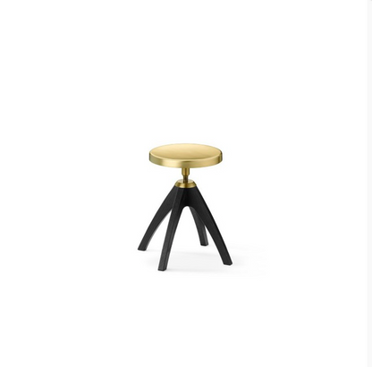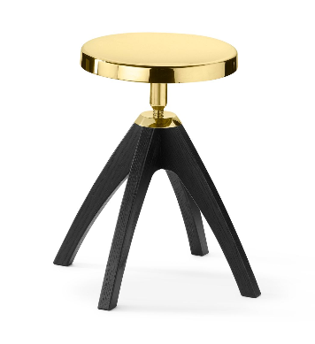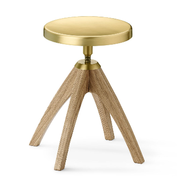 The height-adjustable stool, subject of which you can appreciate the adaptability with a gesture, in different contexts and users, becomes a precious object, with light or dark oak legs slightly bent and round seat in die casted brass. But the project literally revolves around the vertical spiral screw that adjusts the seat, and the brass emphasizes the dynamics of the mechanical movement.
