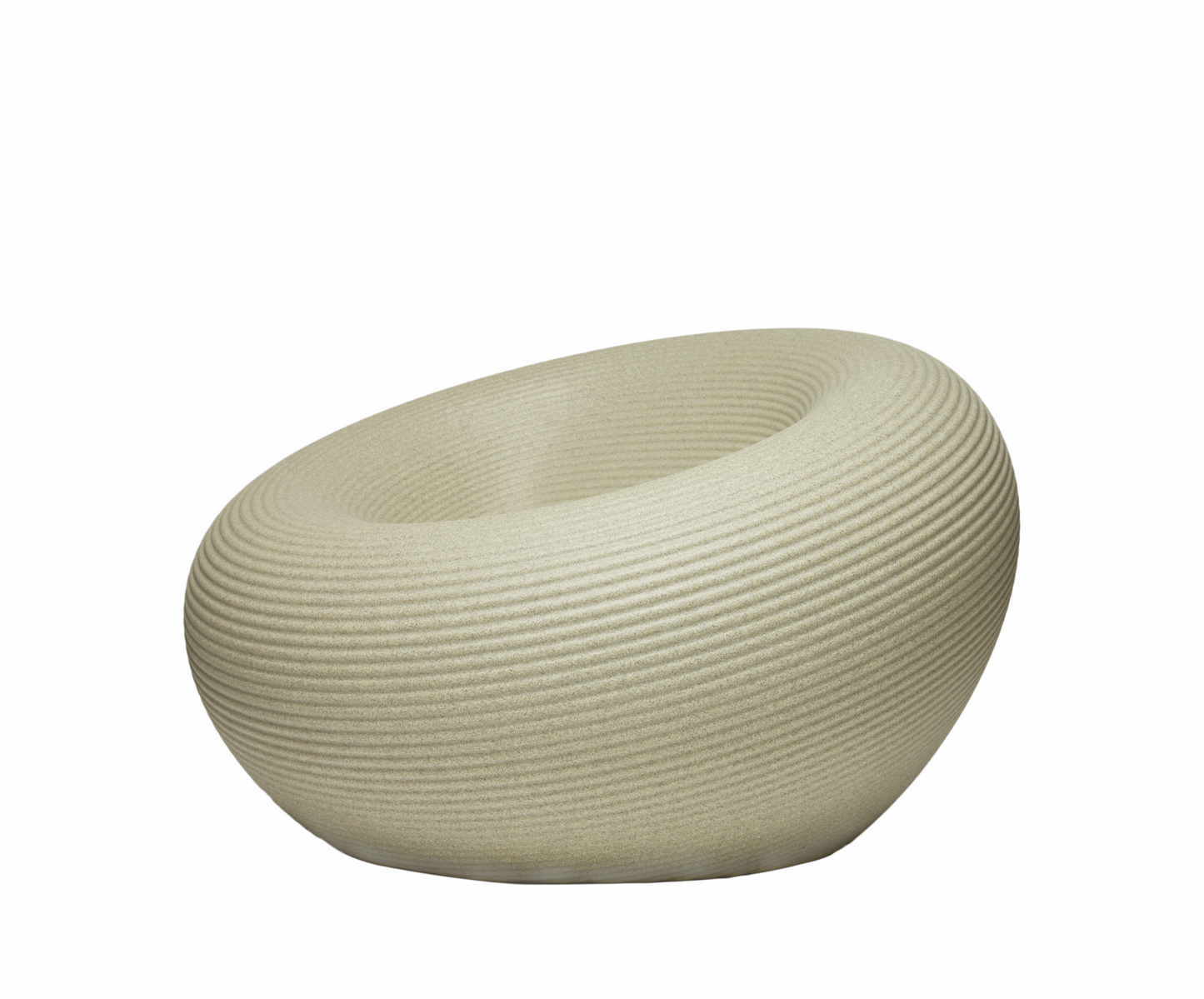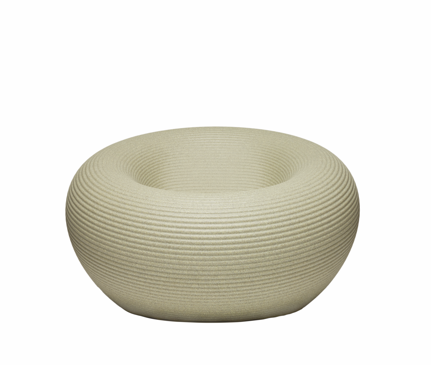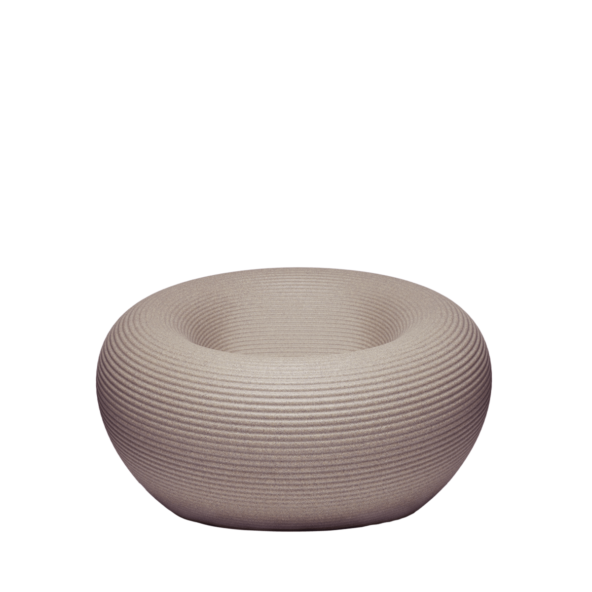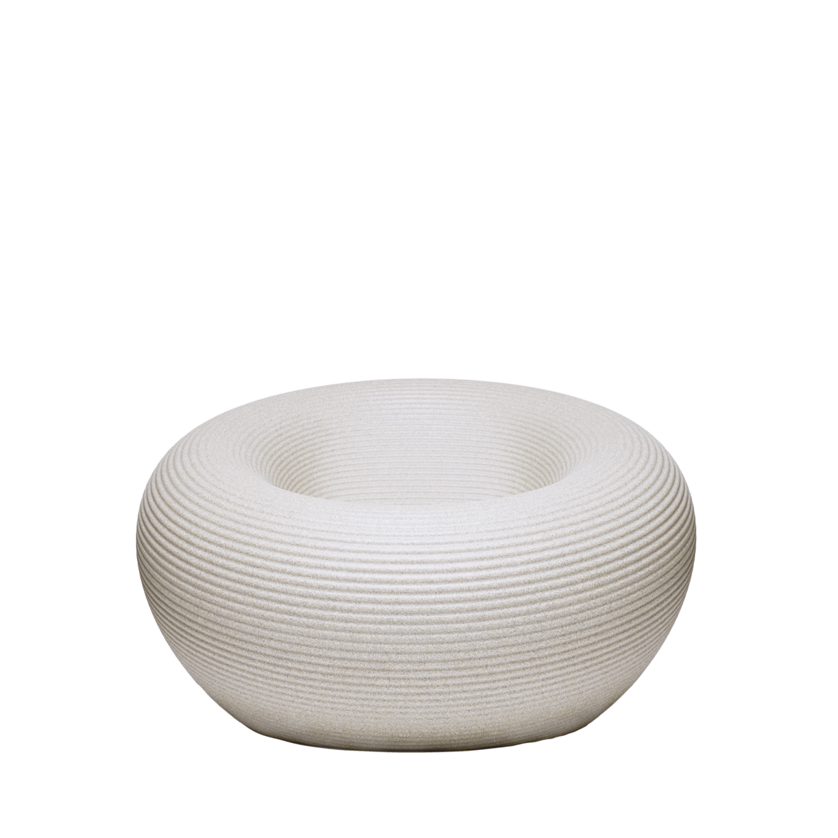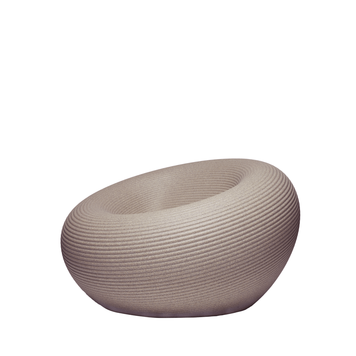 The Nami Armchair is obtained by the rotation of a section on the diagonal axis, it has a perfectly circular shape where the moldings that characterize its surface unravel from the center to its edges with a sequence of concentric rings. In the center of the armchair there is the channel for water reflux. Available in six colours, three of these have a uniform colour, the other three are obtained from recycling and mixing materials with 2-3 different color tones.