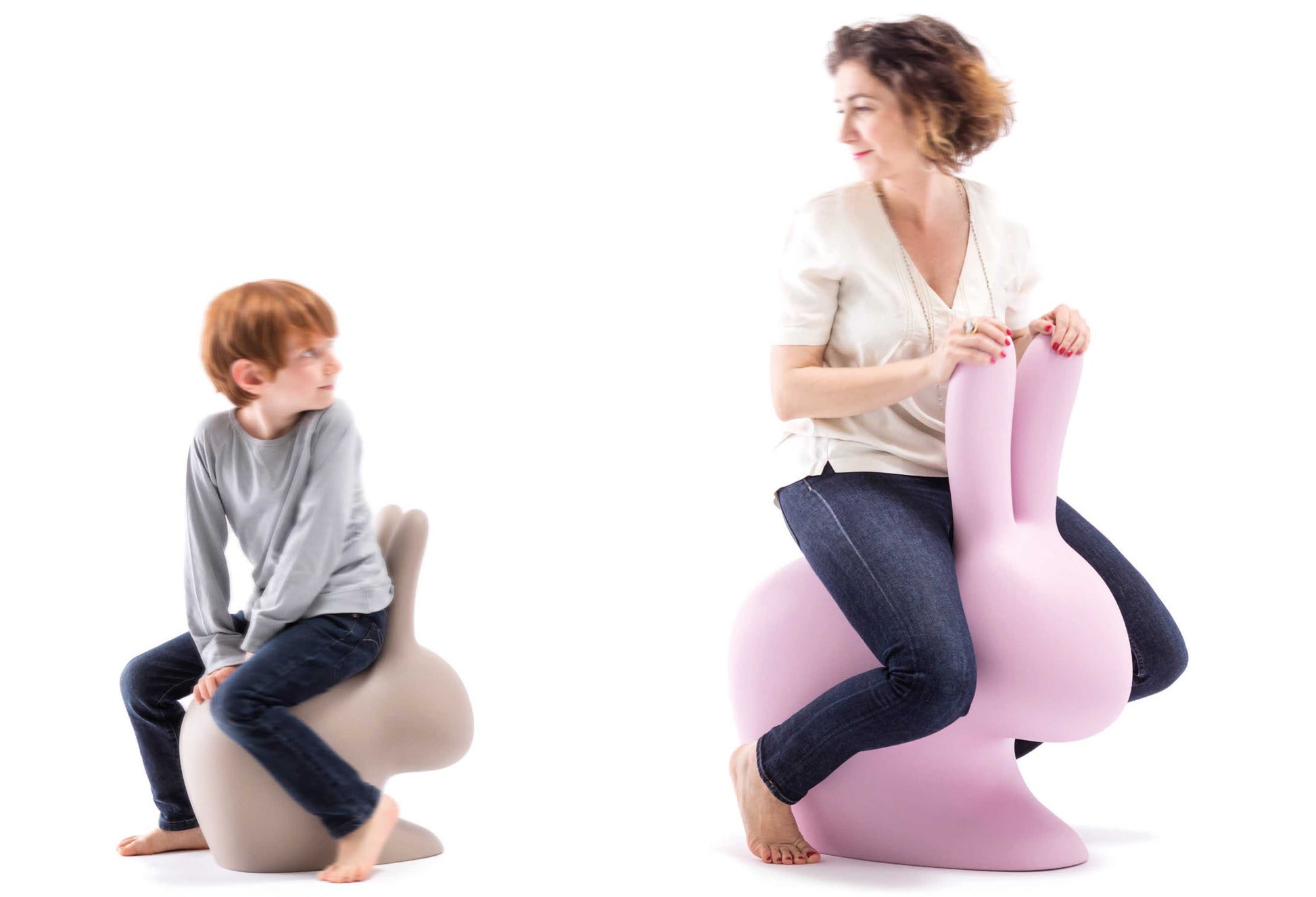 The RABBIT CHAIR is the last creation that came out from Stefano Giovannoni’s magic hat, that becomes a family of products with a strong communicative media power. The idea of the rabbit comes from the connection between its silhouette and the silhouette of a chair, where the rabbit’s ears become the setback of the chair. It has a double variation, for adults (Large) and for kids (Mini), and there is also a third version, illuminated, that can be a lamp. Young and old people can sit down and lean the back against rabbit’s ears or on the opposite side, riding it and leaning the arms on its ears. The rabbit is a gentle animal, lovable and tender. In Western and Eastern culture it symbolises love and fertility, it is a sweet and auspicious object that brings good fortune and good wishes.