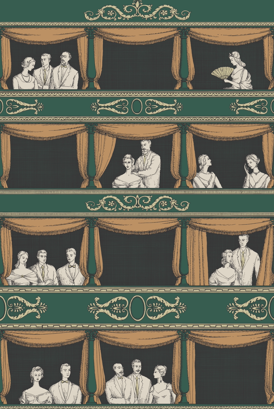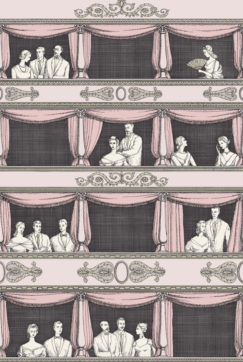 Piero Fornasetti had a deep love and admiration for music and theatre finding a wealth of inspiration from the Italian Commedia dell’arte. From this came the delightful Teatro. As charming today as it was then,Teatro was conceptualised in the 1950s.The scene is enthralling with intricate line work depicting elegant theatre goers. A delicate recolouring in the soft rose tones of Ballet Slipper plays towards the design’s theatrical inspiration, whilst the traditionally tasteful Racing Car Green is derived from timeless Fornasetti palettes of deep jade and emerald tones, as well as classic Linen and Rouge.