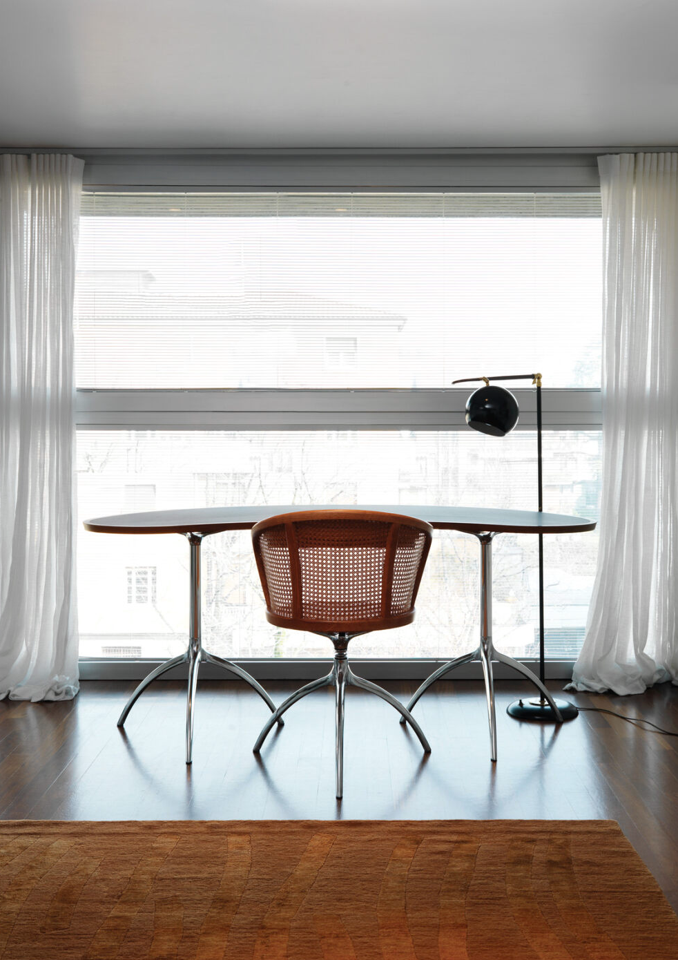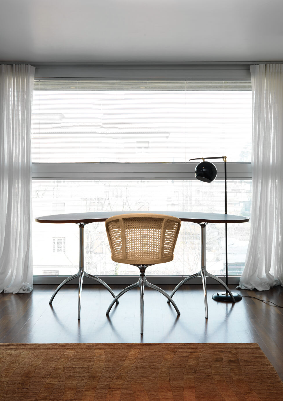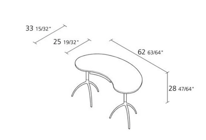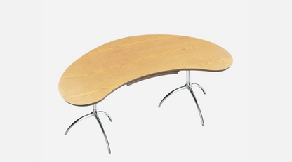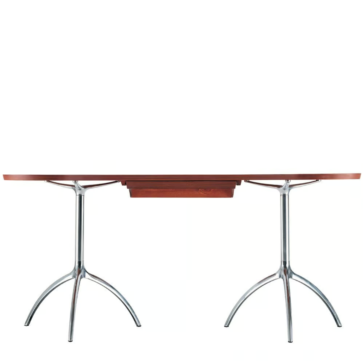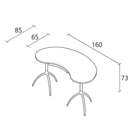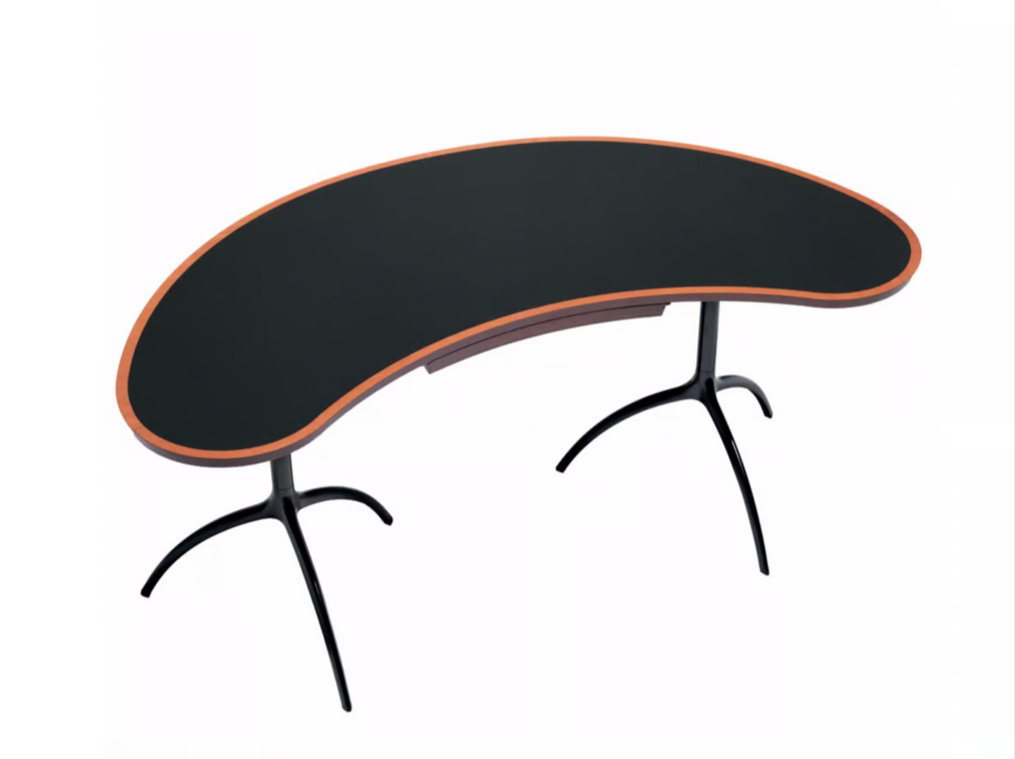 Desk with structure in die-cast lacquered or polished aluminium, top in veneered plywood natural ash (thickness 25mm). Draw in plywood