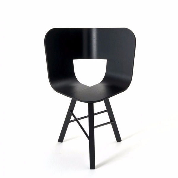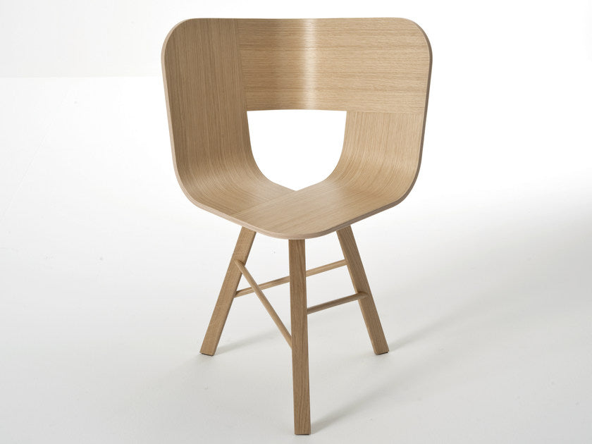 Plywood chair is composed of three equal elements in bent plywood assembled together and veneered in  oak (natural or stained white or black), red ash or with a special wood finishing ivory/ black stripes.